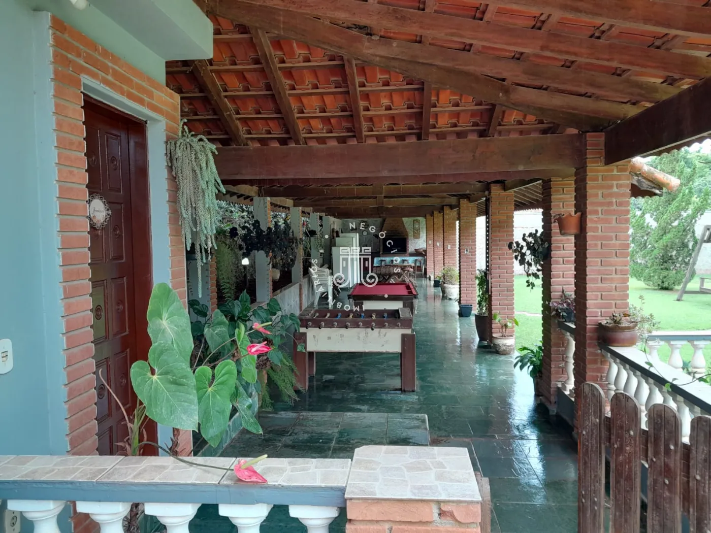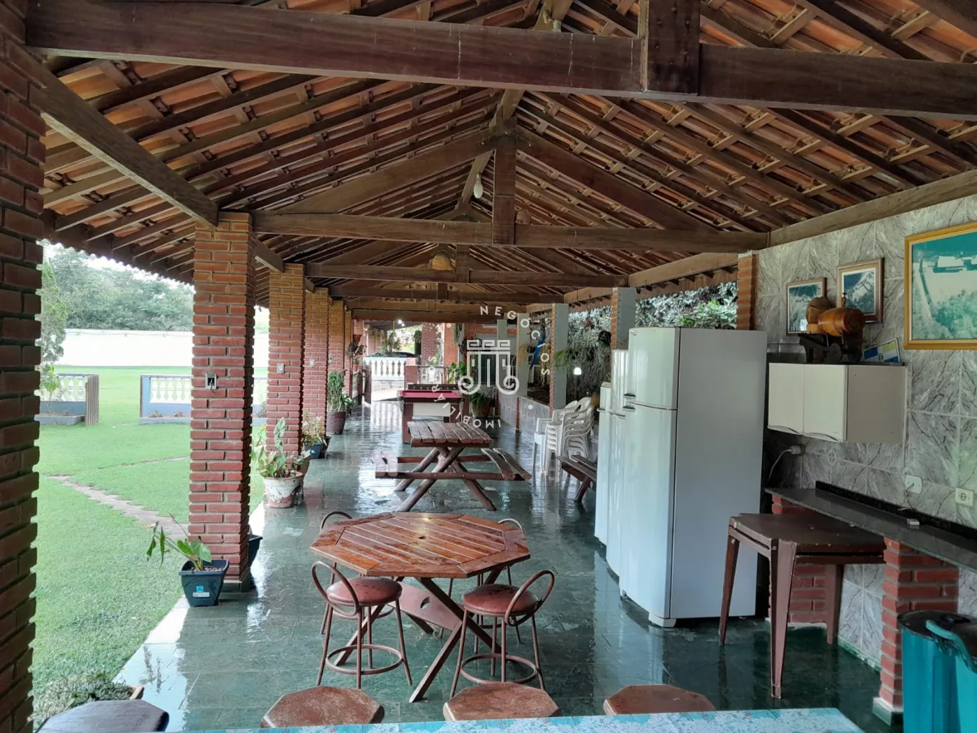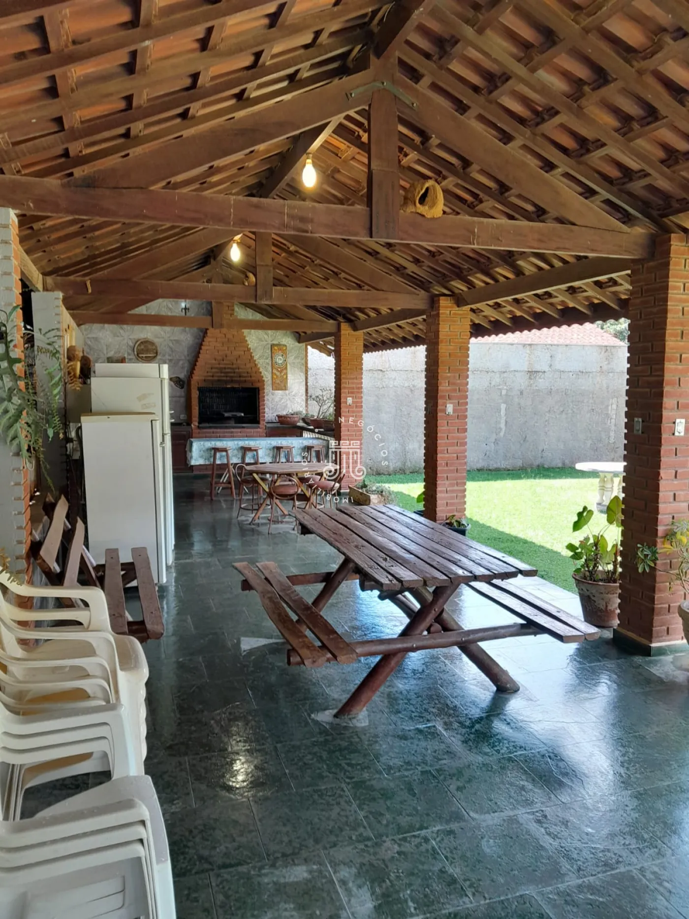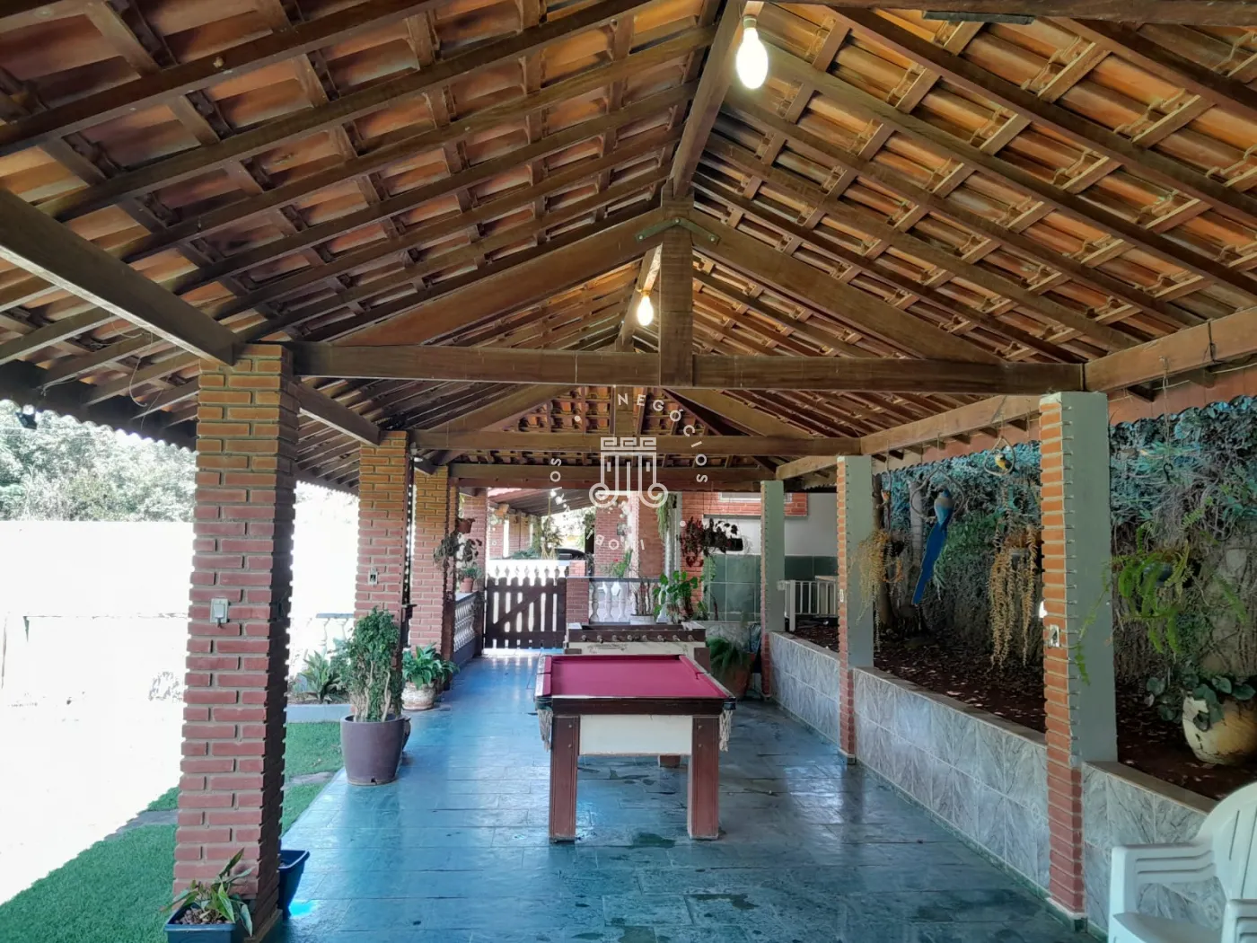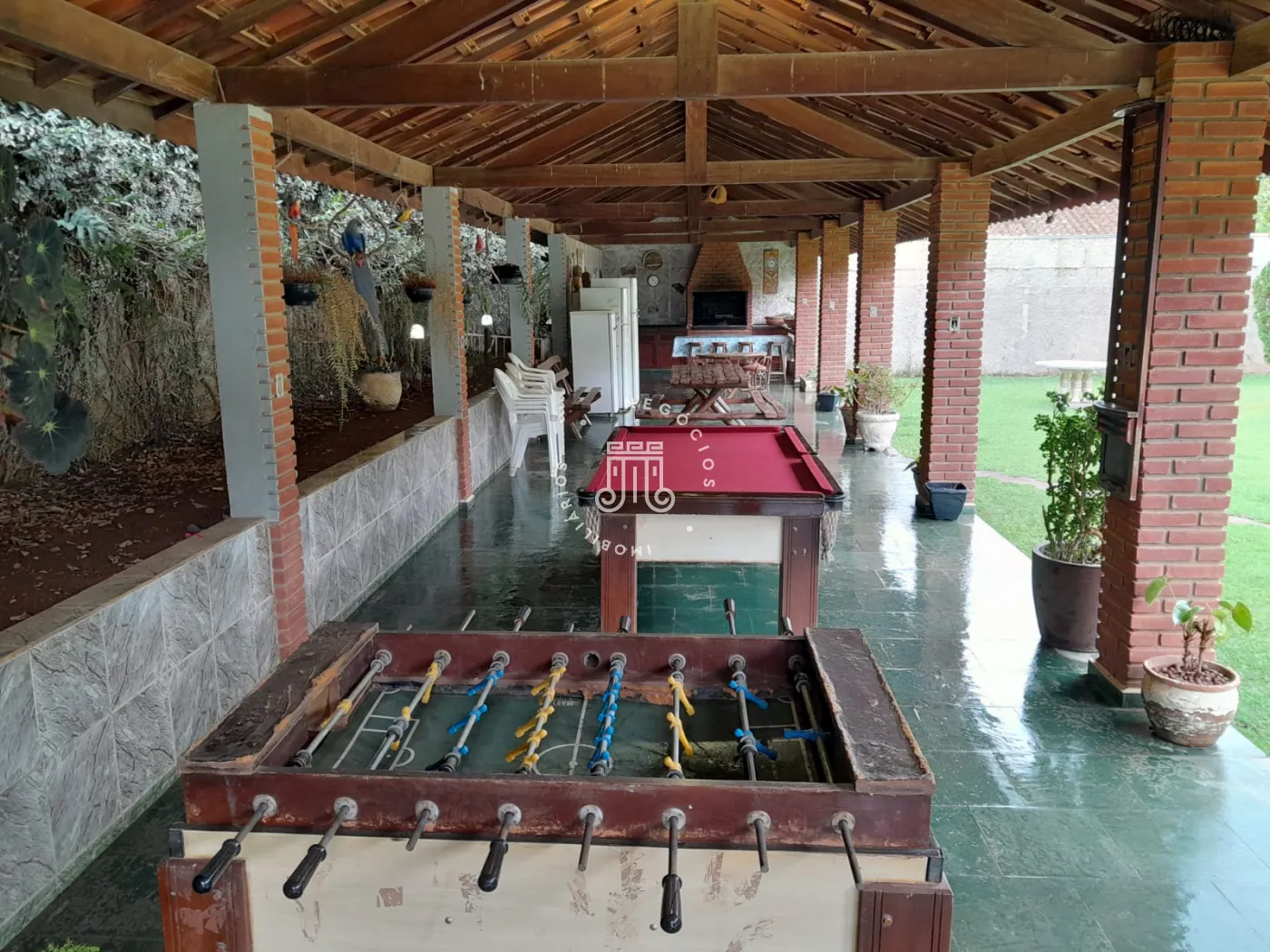 Chácara contém: Piscina nas medidas de 5x10m e hidro de 3 x 3m; Área gourmet com churrasqueira, mesa de pebolim, mesa de sinuca, mesas de madeira, geladeiras, fogão; Banheiro na área gourmet, pia de mármore sob medida; Casa com cozinha, sala de estar, sala de jantar, banheiro e um dormitório, toda avarandada, com cama de casal e solteiro, guarda roupa de madeira, sofá, mesa com cadeiras, geladeira e fogão.