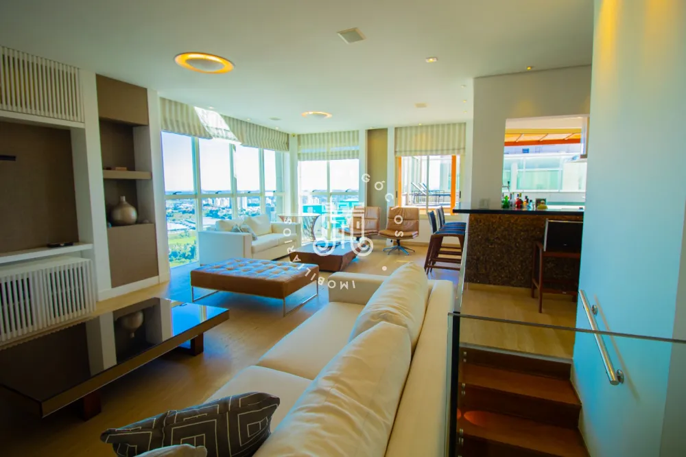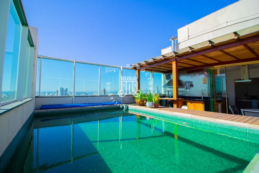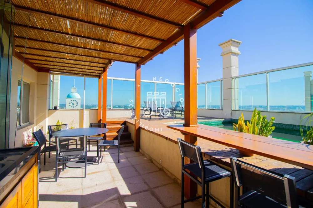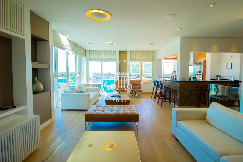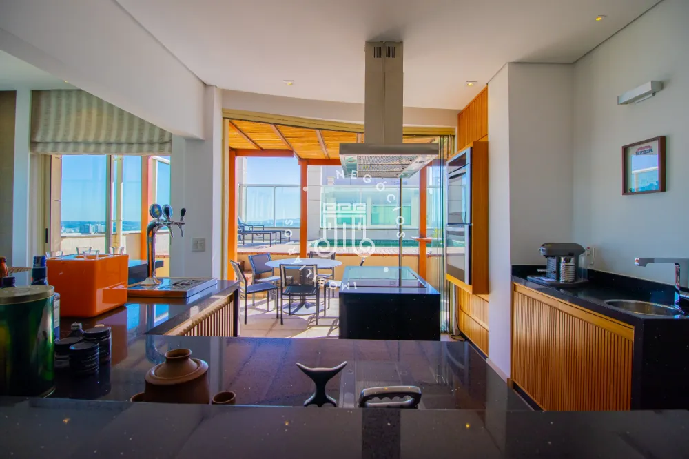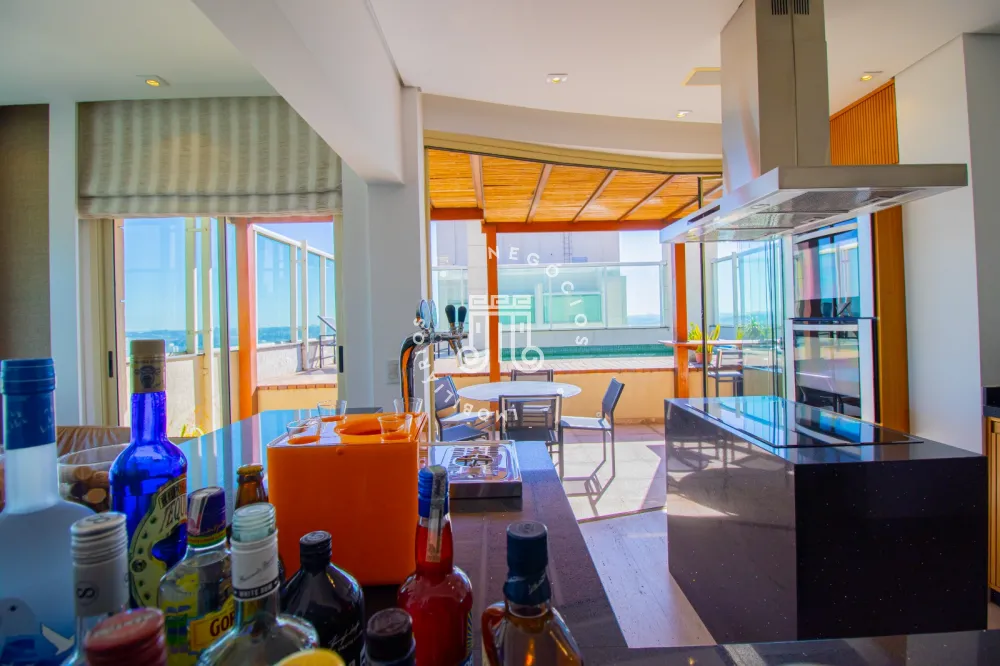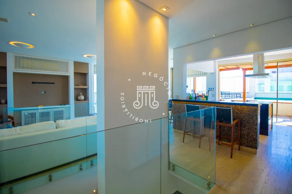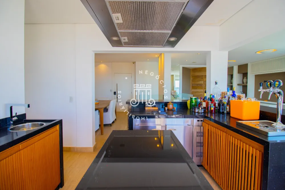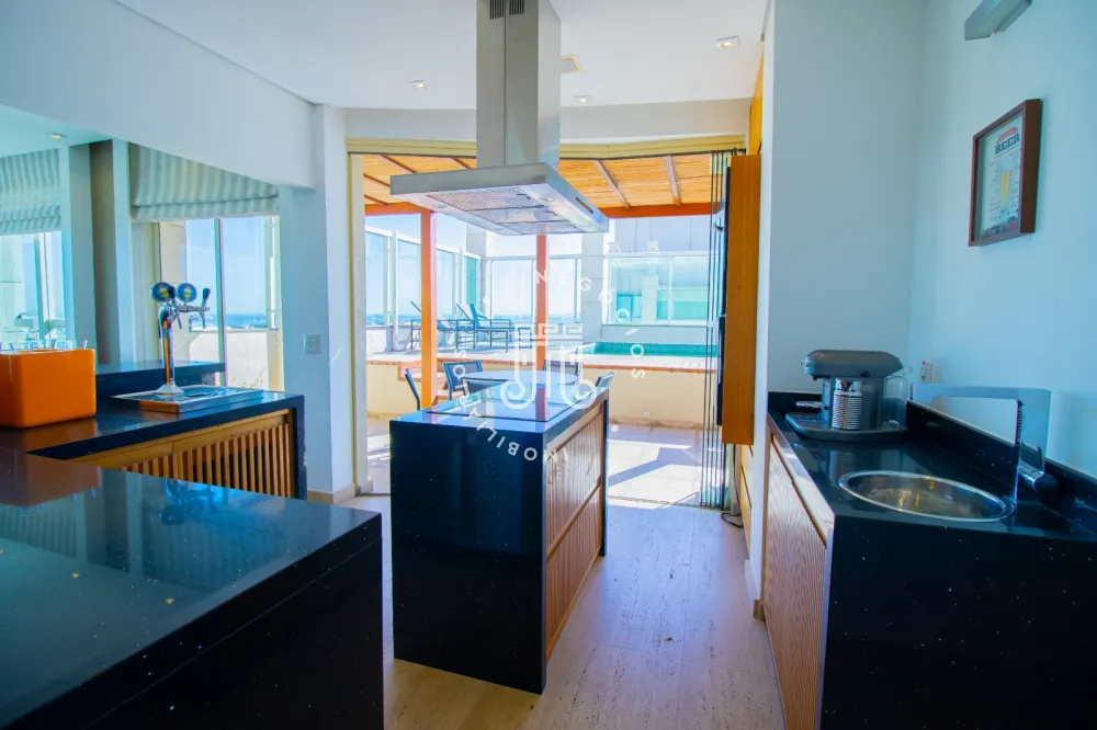 Diferenciais desta cobertura são 04 vagas cobertas, apenas 2 coberturas por andar, vista panorâmica de todos os ambientes, todo o revestimento de piso da cobertura é de mármore travertino, bancadas e pias de silestone e ônix, marcenaria em todos os ambientes, ar condicionado em todos os ambientes, 02 cozinhas equipadas e completas, som ambiente em todos os andares na área social e iluminação em led.