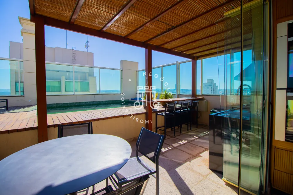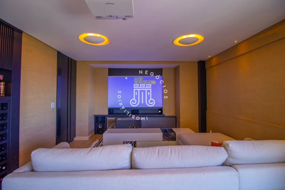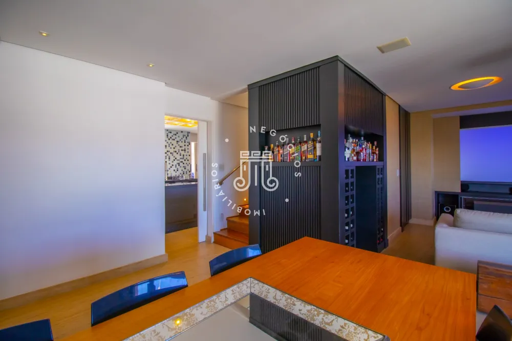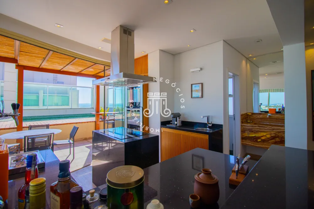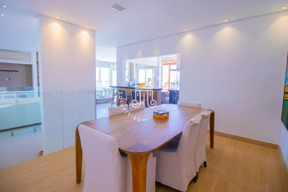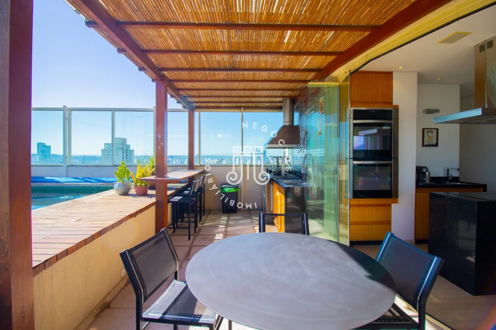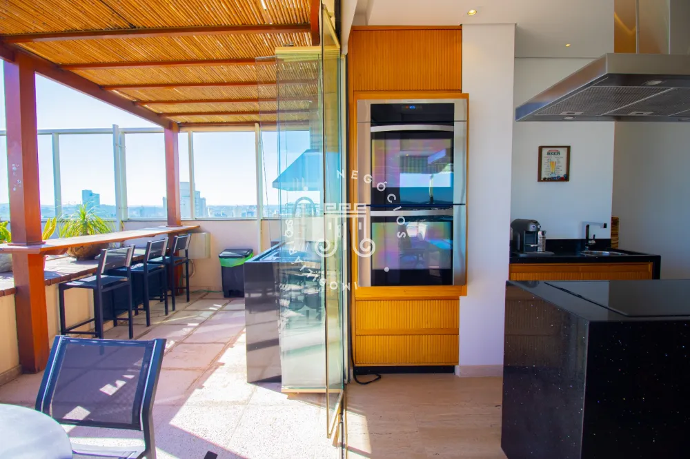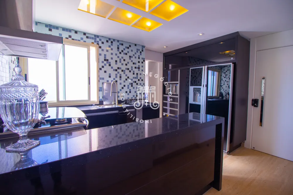 Diferenciais desta cobertura são 04 vagas cobertas, apenas 2 coberturas por andar, vista panorâmica de todos os ambientes, todo o revestimento de piso da cobertura é de mármore travertino, bancadas e pias de silestone e ônix, marcenaria em todos os ambientes, ar condicionado em todos os ambientes, 02 cozinhas equipadas e completas, som ambiente em todos os andares na área social e iluminação em led.
