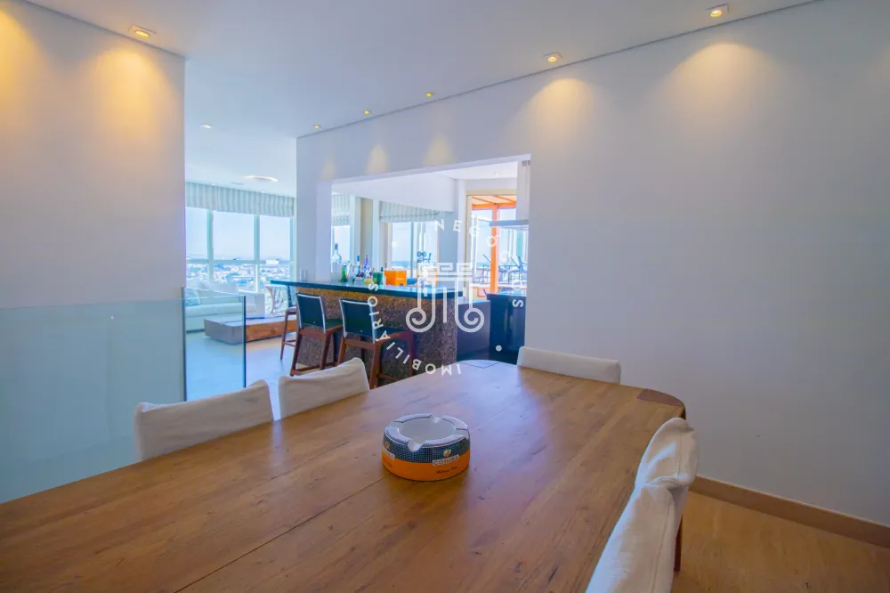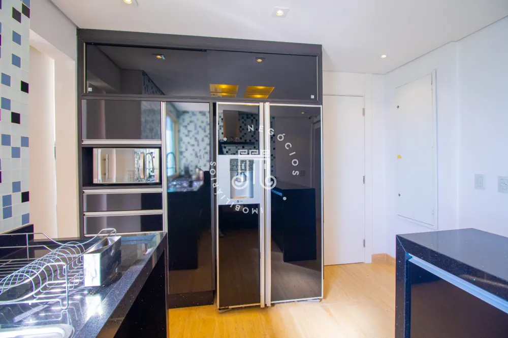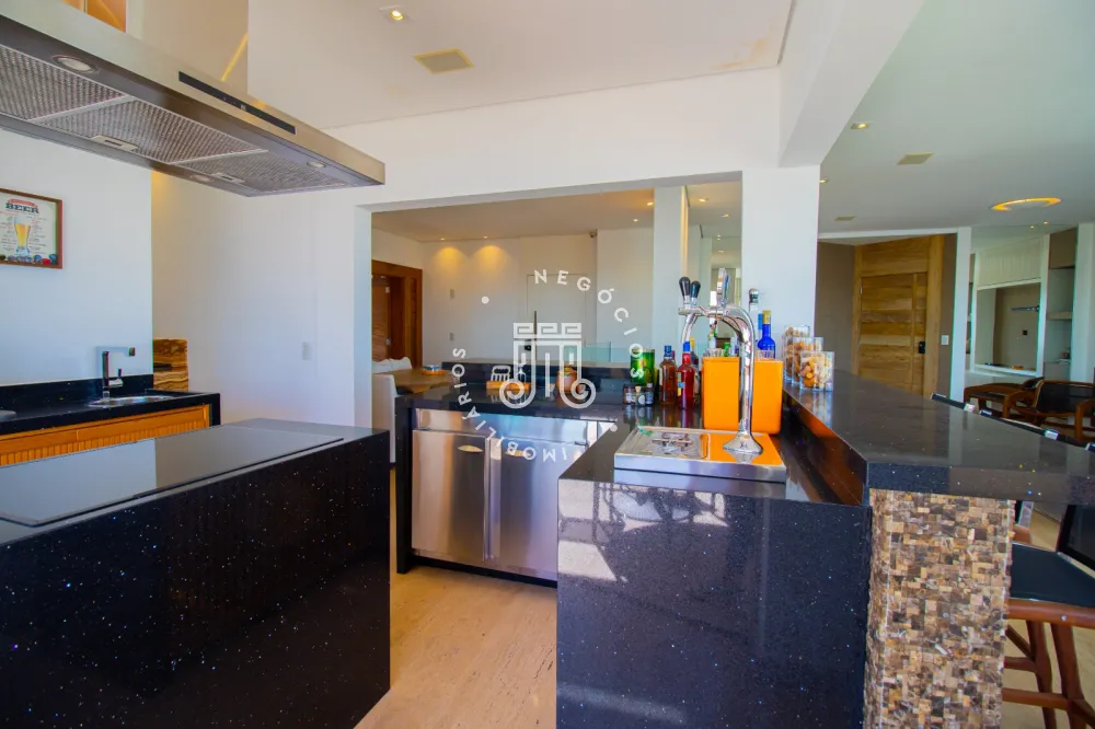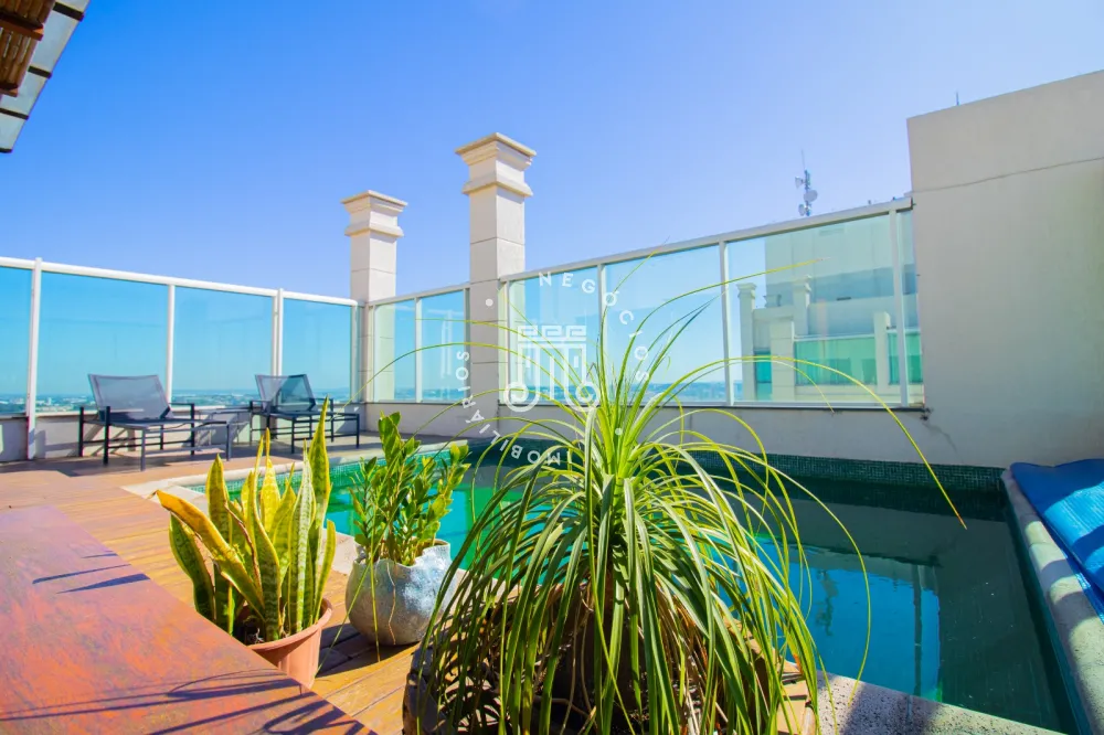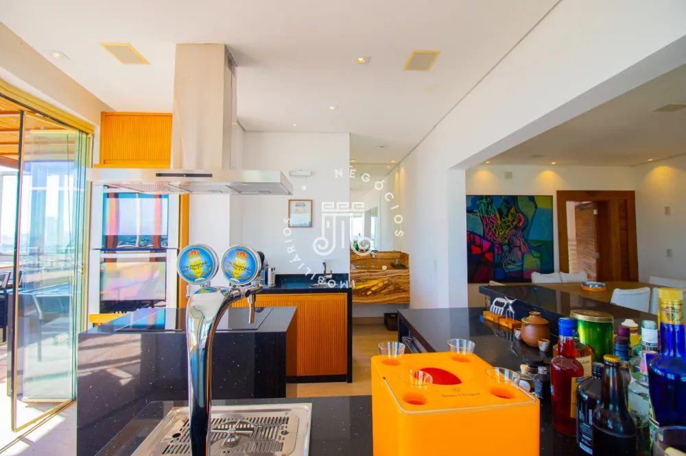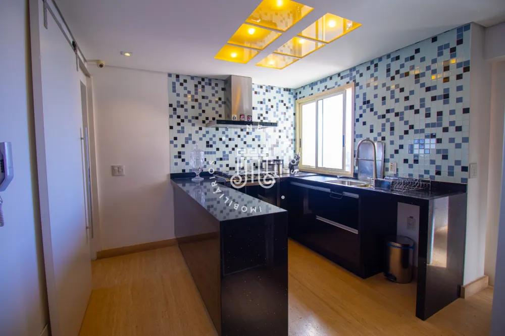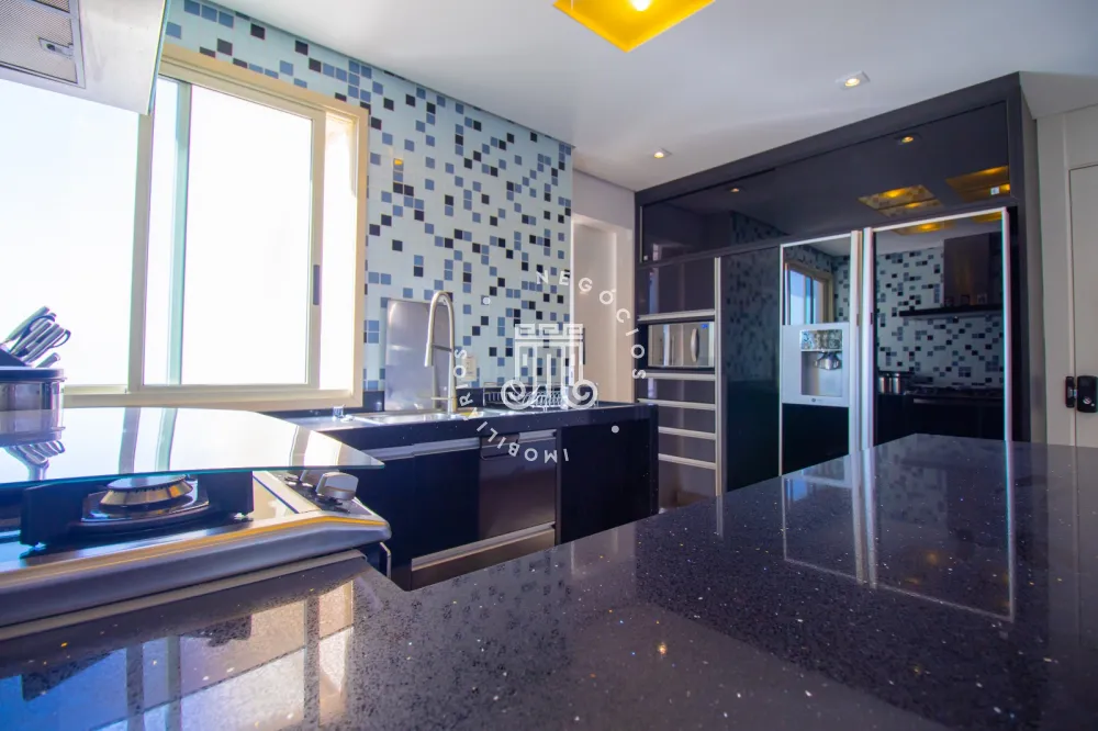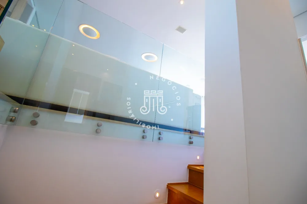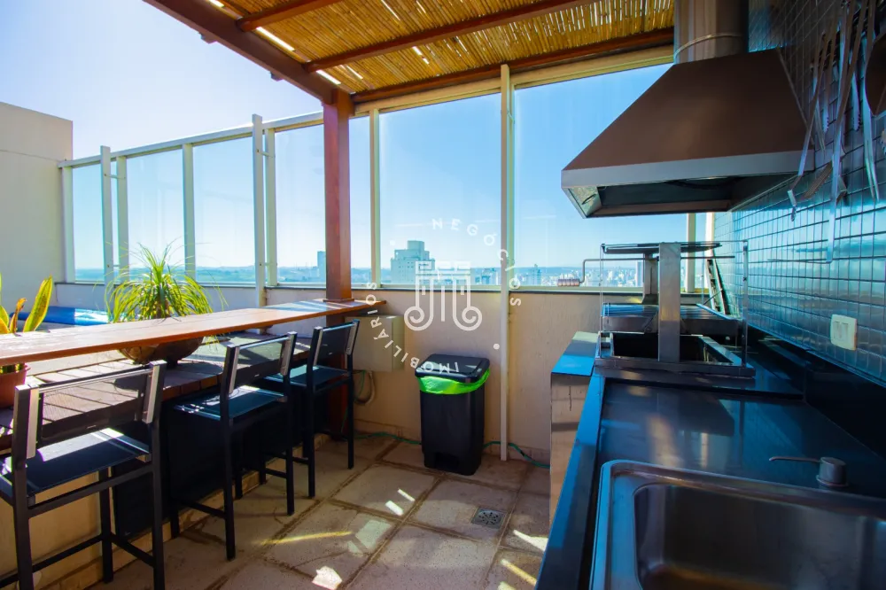 Diferenciais desta cobertura são 04 vagas cobertas, apenas 2 coberturas por andar, vista panorâmica de todos os ambientes, todo o revestimento de piso da cobertura é de mármore travertino, bancadas e pias de silestone e ônix, marcenaria em todos os ambientes, ar condicionado em todos os ambientes, 02 cozinhas equipadas e completas, som ambiente em todos os andares na área social e iluminação em led.