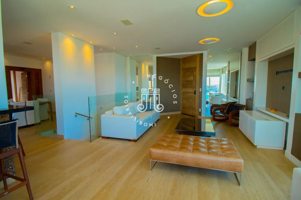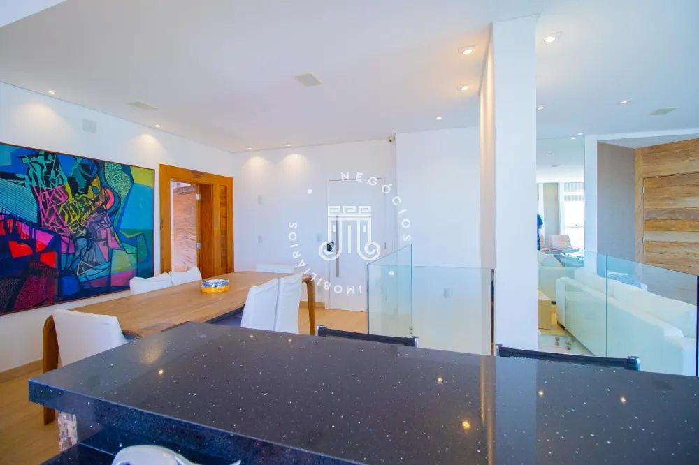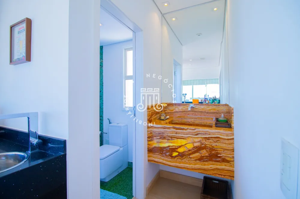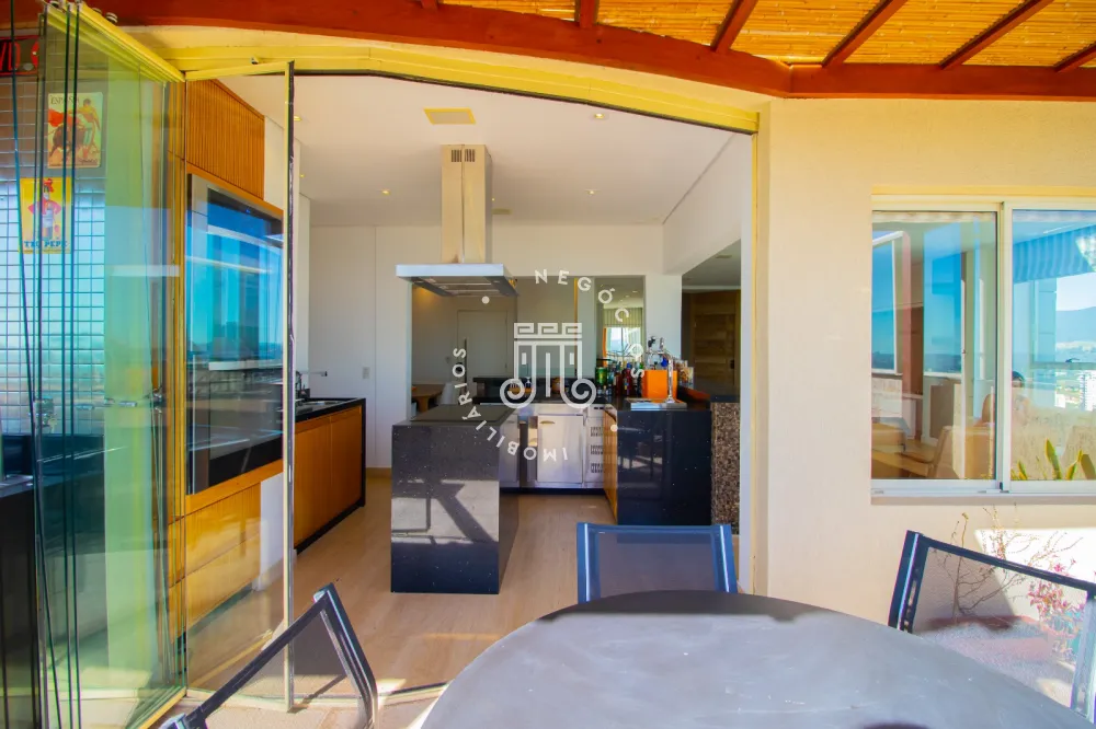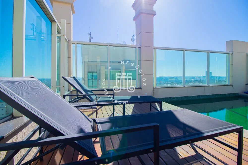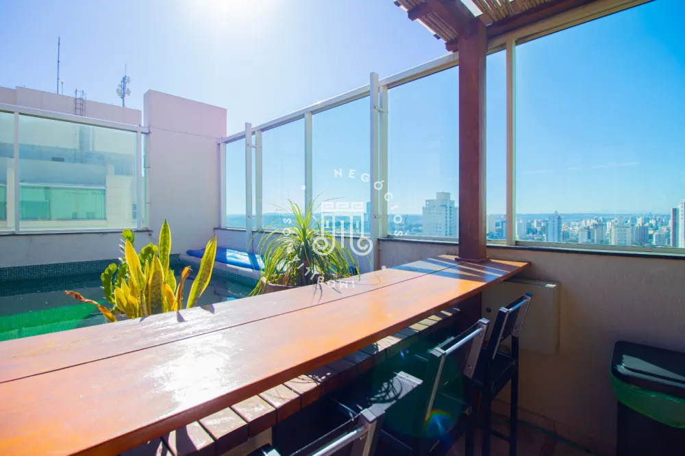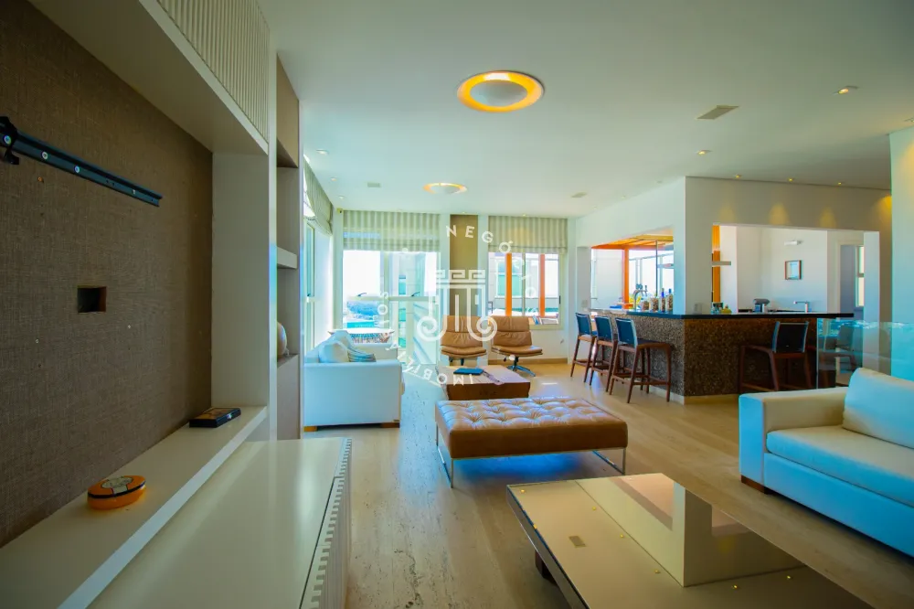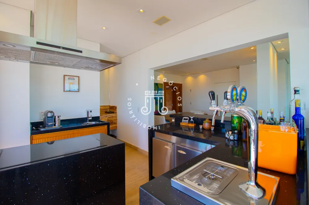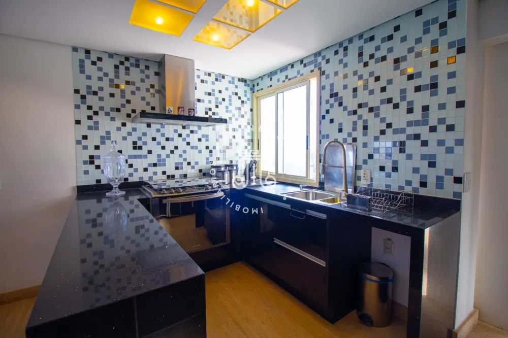 Diferenciais desta cobertura são 04 vagas cobertas, apenas 2 coberturas por andar, vista panorâmica de todos os ambientes, todo o revestimento de piso da cobertura é de mármore travertino, bancadas e pias de silestone e ônix, marcenaria em todos os ambientes, ar condicionado em todos os ambientes, 02 cozinhas equipadas e completas, som ambiente em todos os andares na área social e iluminação em led.
