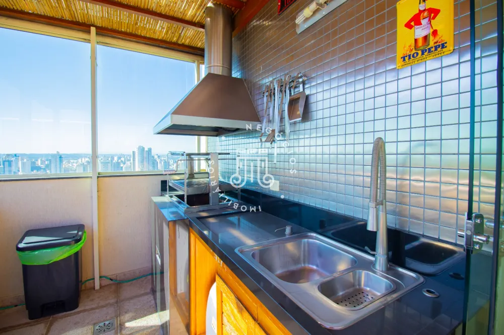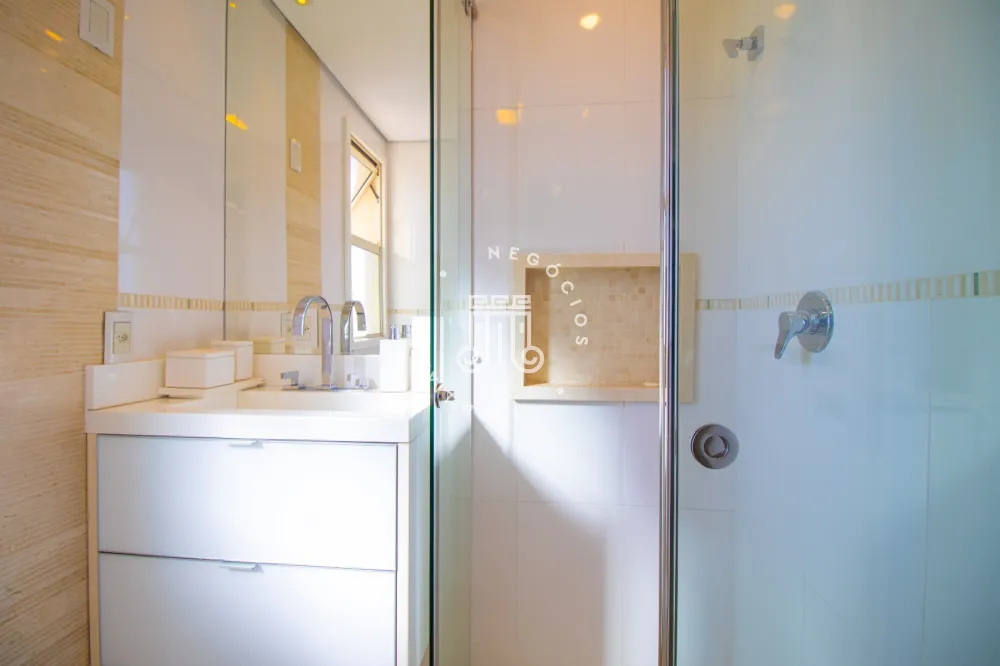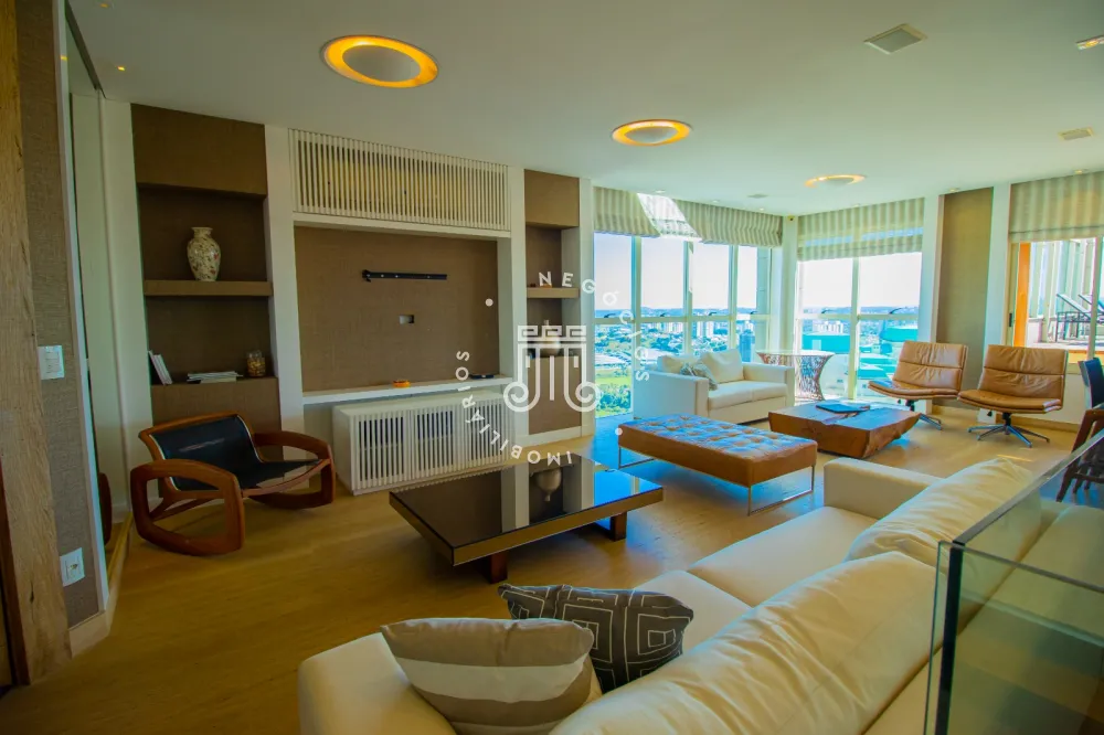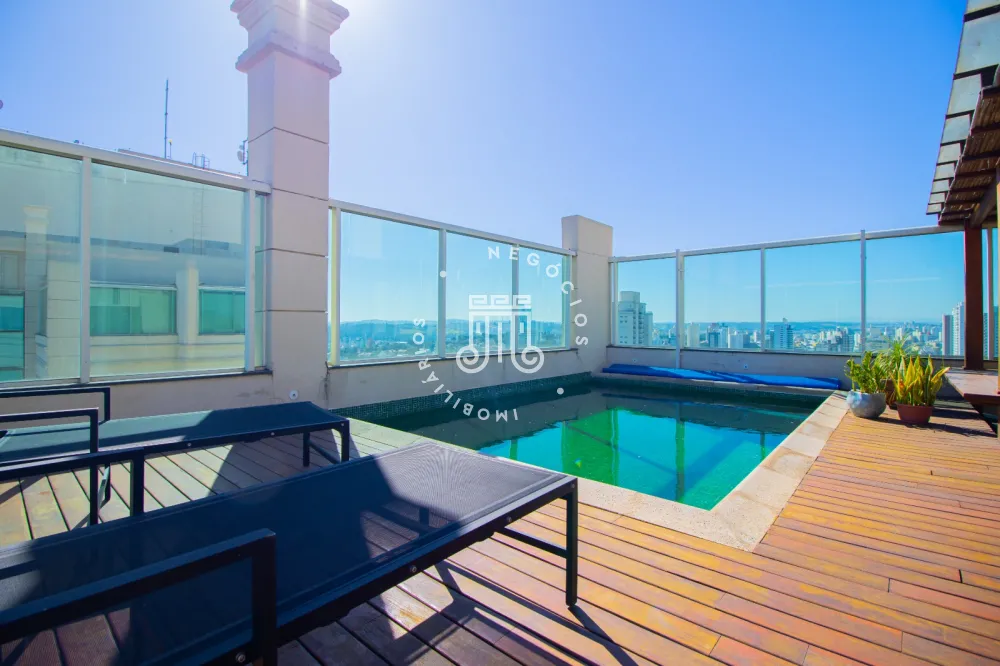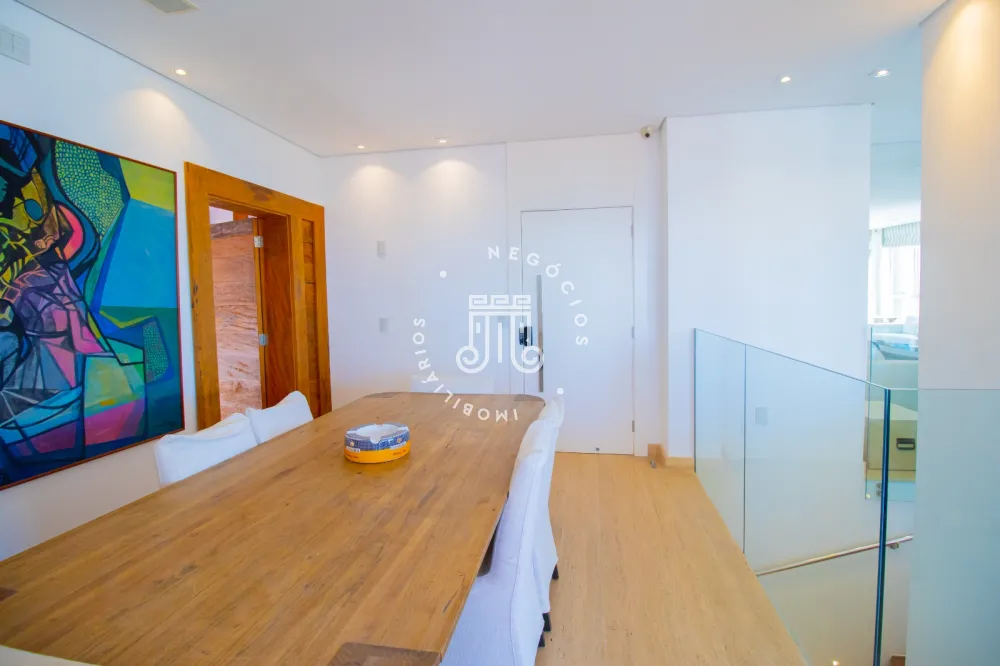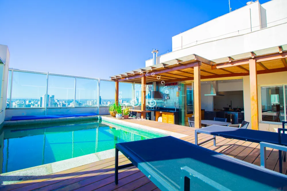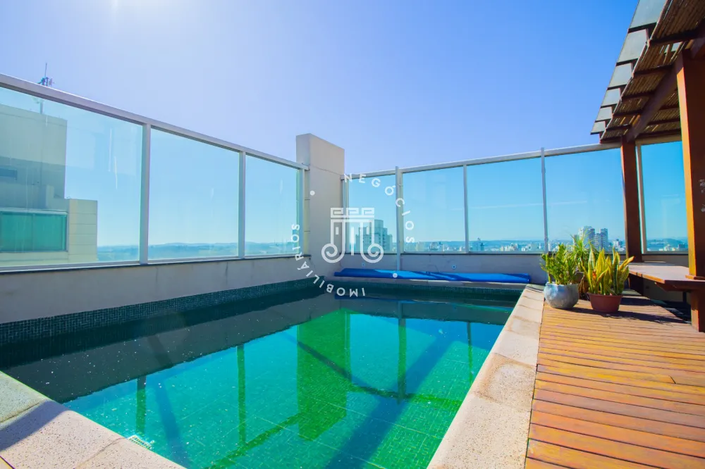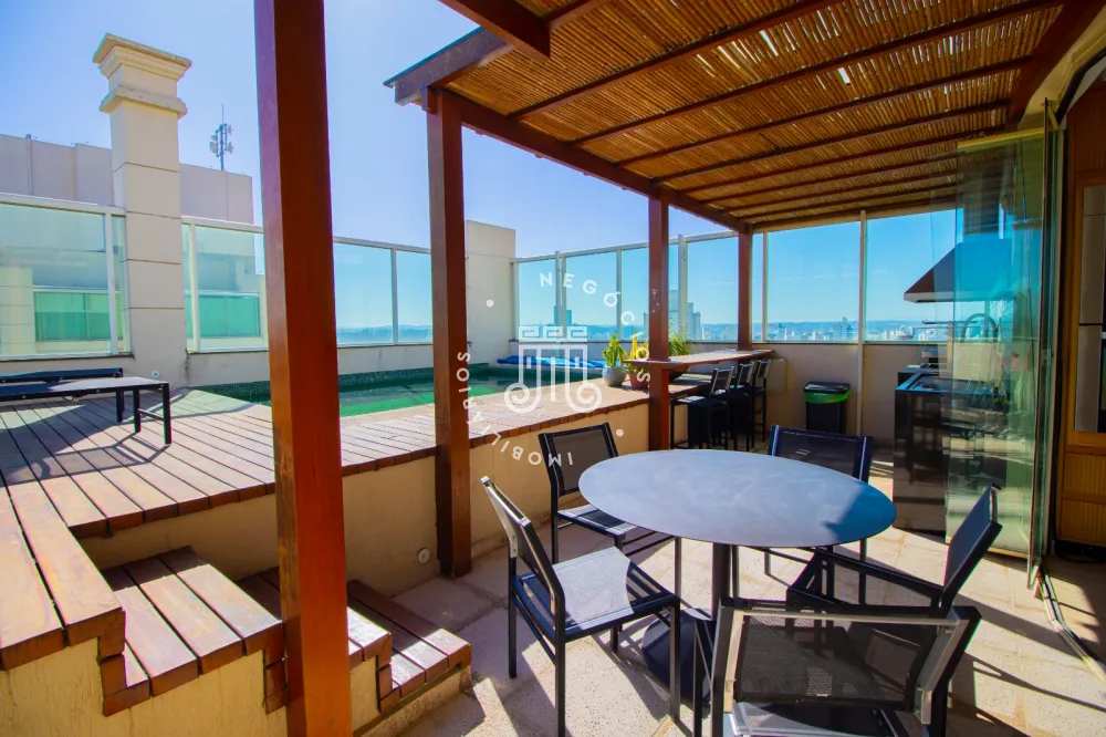 Diferenciais desta cobertura são 04 vagas cobertas, apenas 2 coberturas por andar, vista panorâmica de todos os ambientes, todo o revestimento de piso da cobertura é de mármore travertino, bancadas e pias de silestone e ônix, marcenaria em todos os ambientes, ar condicionado em todos os ambientes, 02 cozinhas equipadas e completas, som ambiente em todos os andares na área social e iluminação em led.