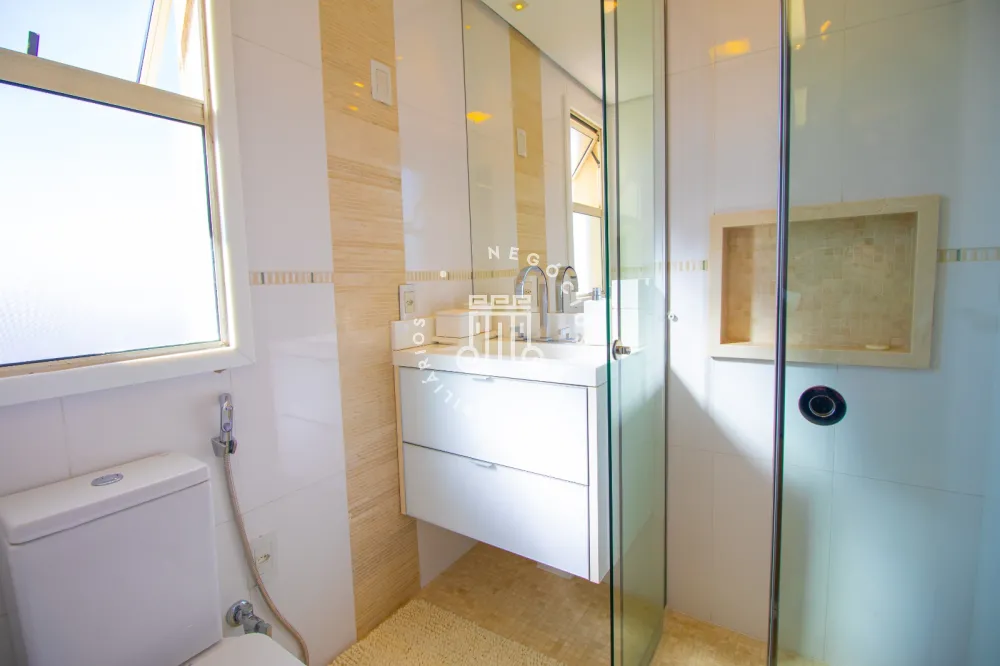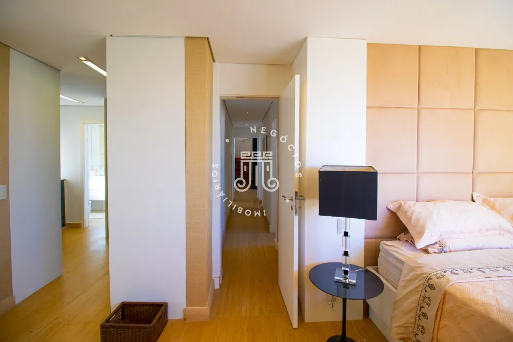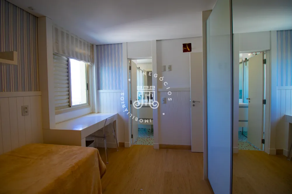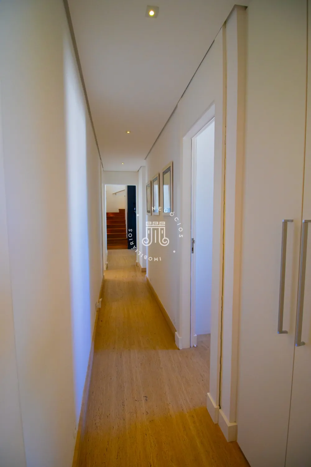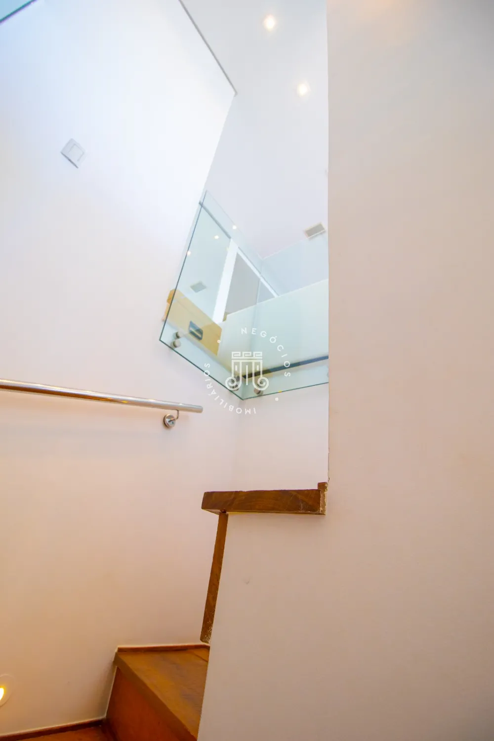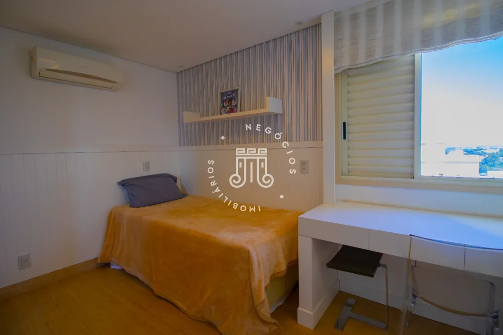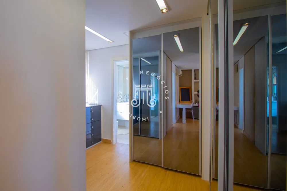 Piso inferior com entrada de serviço, cozinha completa, suíte de serviço completa, sala de jantar com planejados, sala de tv ampla e com telão (telão e projetor já instalados), 04 suítes espaçosas repleta de planejados e com ar condicionado, suíte máster com closet e banheiro ele e ela, adega e lavanderia com dependência completa de serviço.