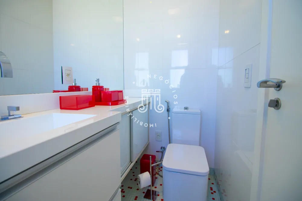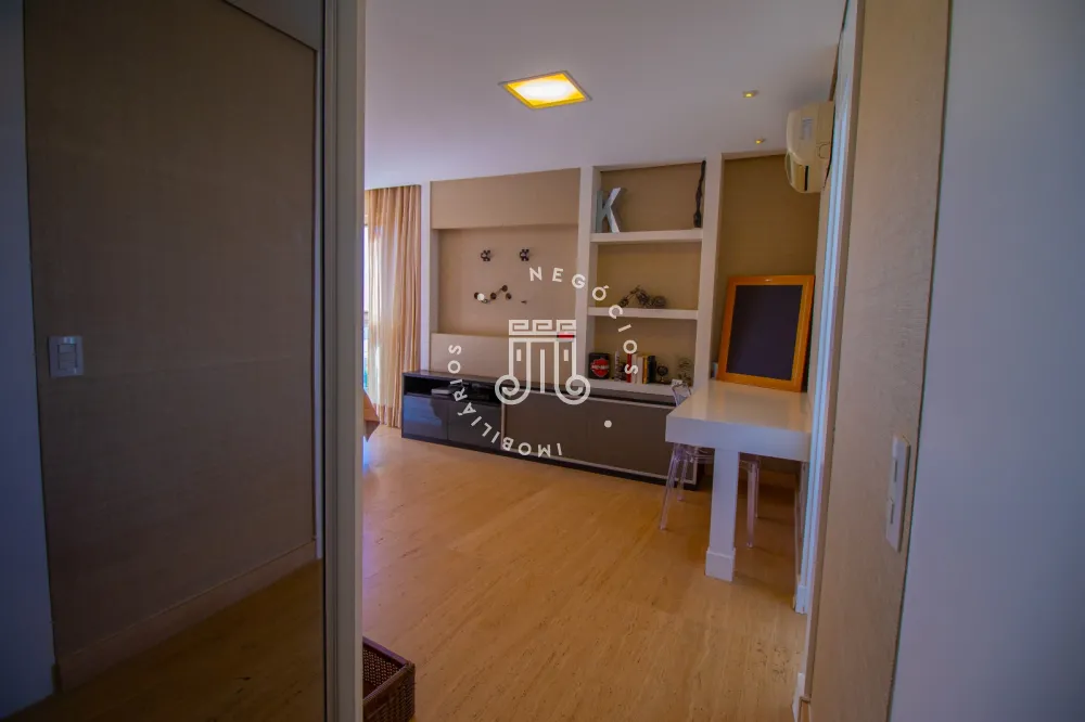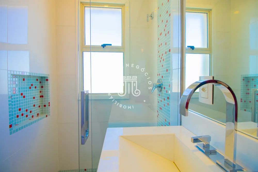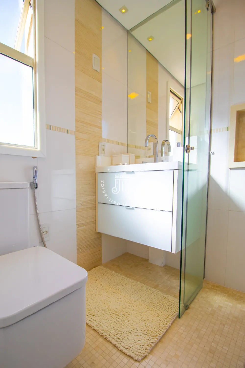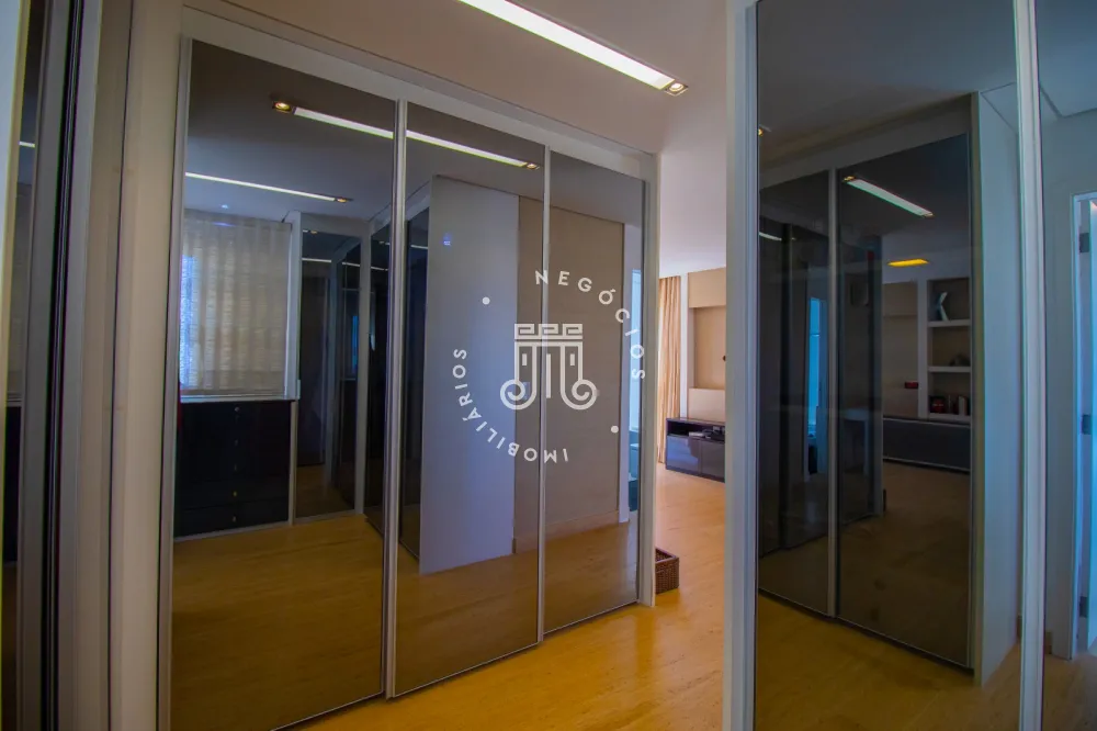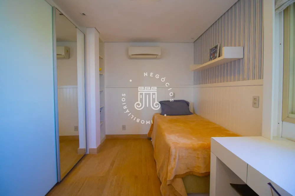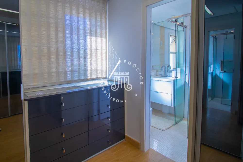 Piso inferior com entrada de serviço, cozinha completa, suíte de serviço completa, sala de jantar com planejados, sala de tv ampla e com telão (telão e projetor já instalados), 04 suítes espaçosas repleta de planejados e com ar condicionado, suíte máster com closet e banheiro ele e ela, adega e lavanderia com dependência completa de serviço.