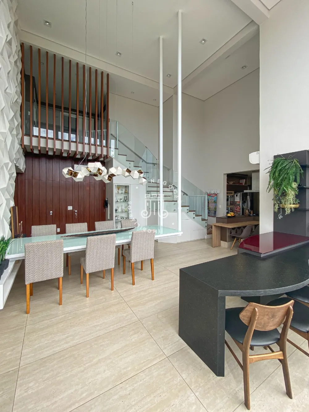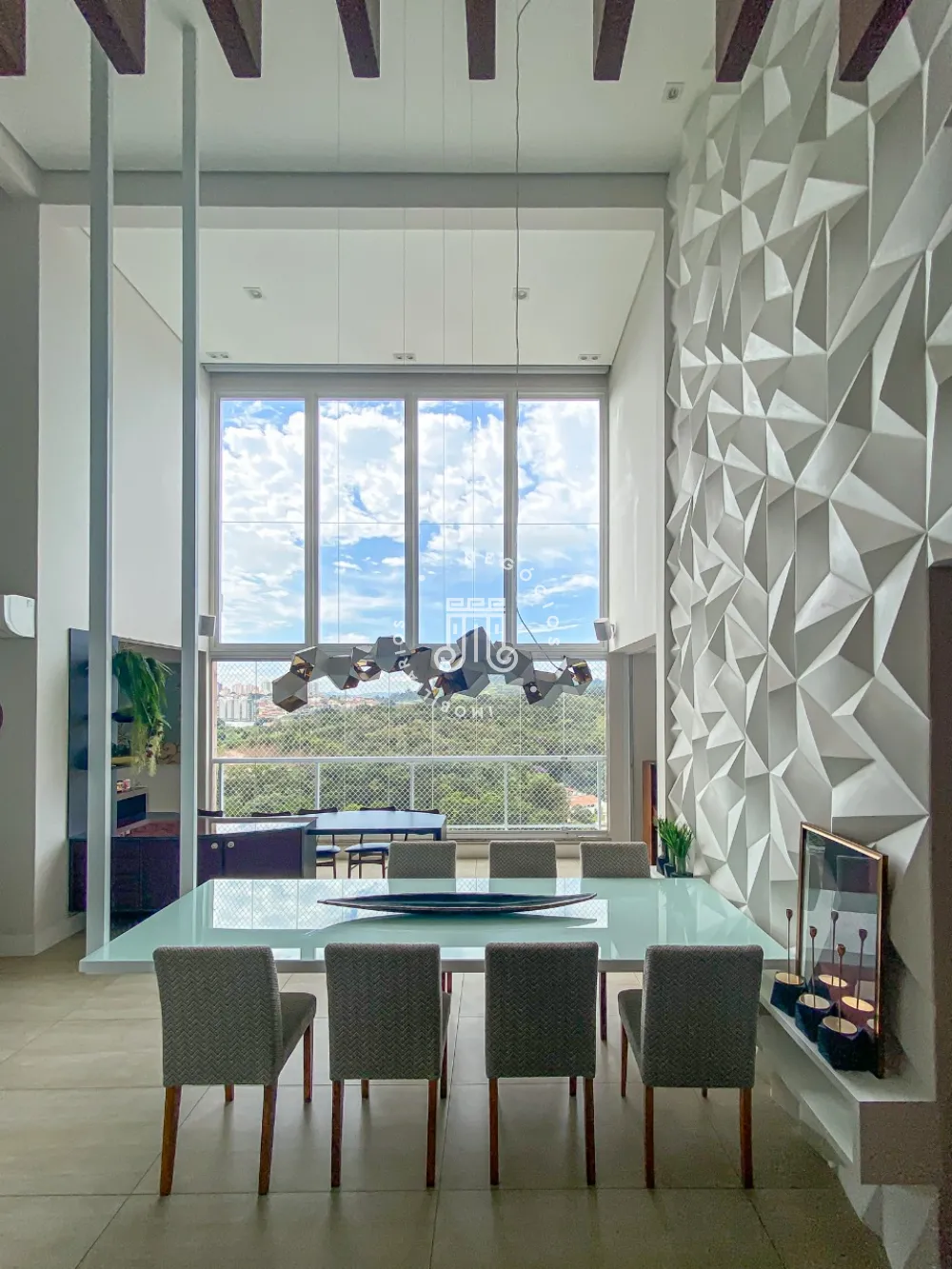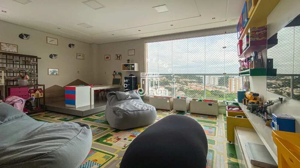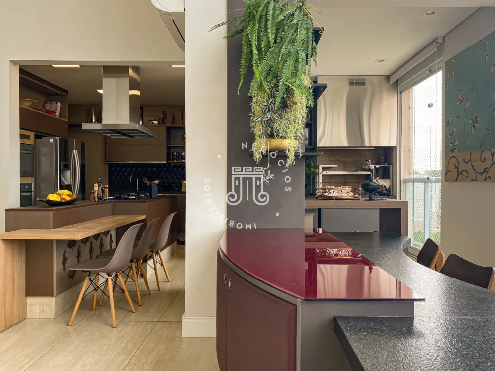Sala espaçosa para 3 ambientes toda fechada em vidro, área de brinquedoteca, cozinha moderna planejada com mesa e ilha central equipada com eletrodomésticos de última geração, área de churrasqueira, Lavabo, área de lavanderia com armários planejados, aquecedor a gás, dependência completa de serviço.