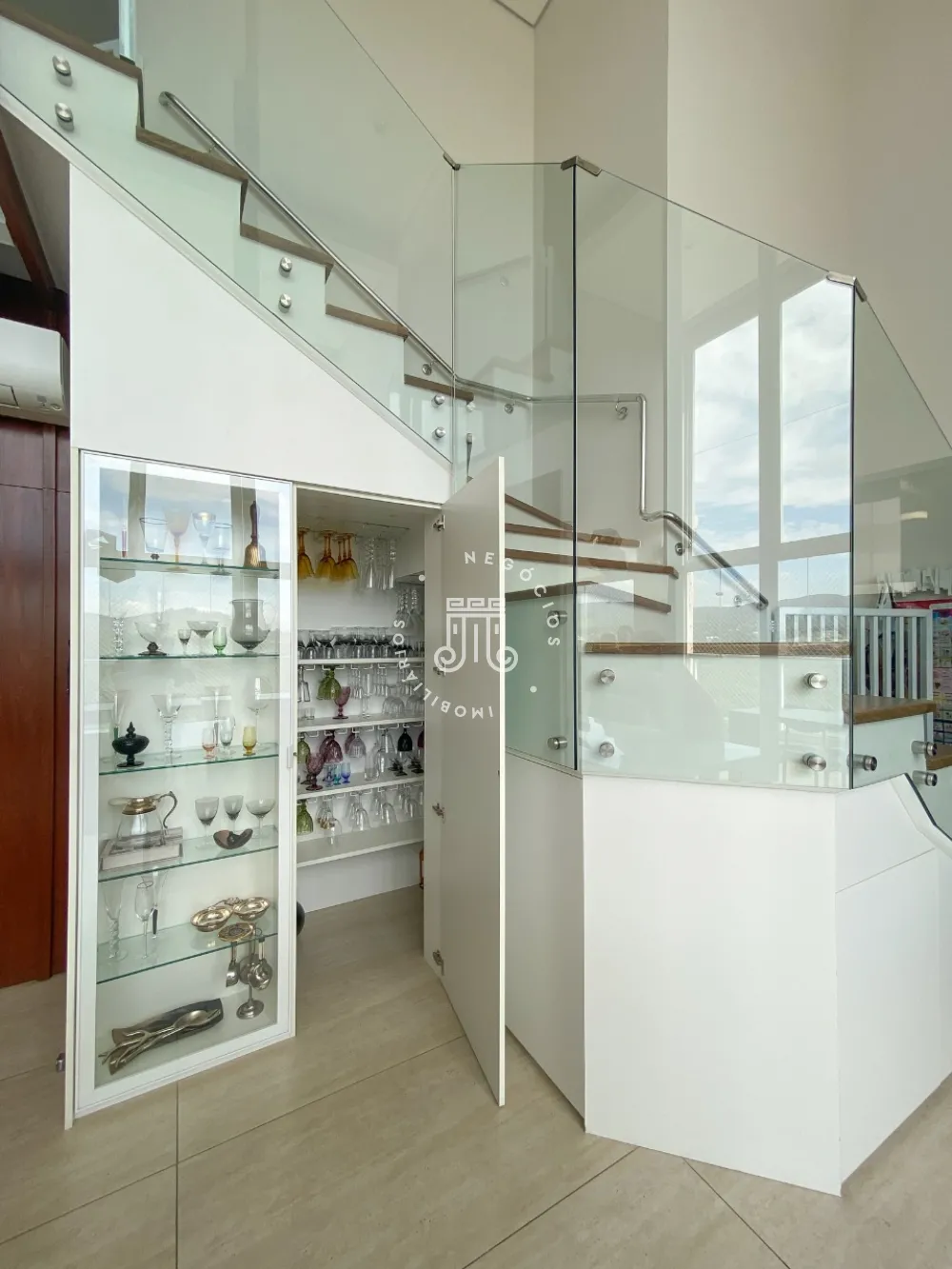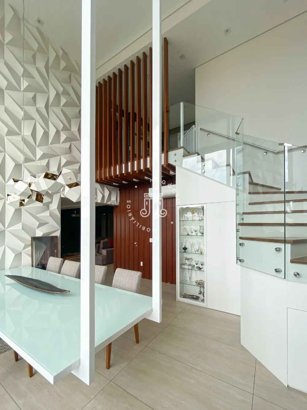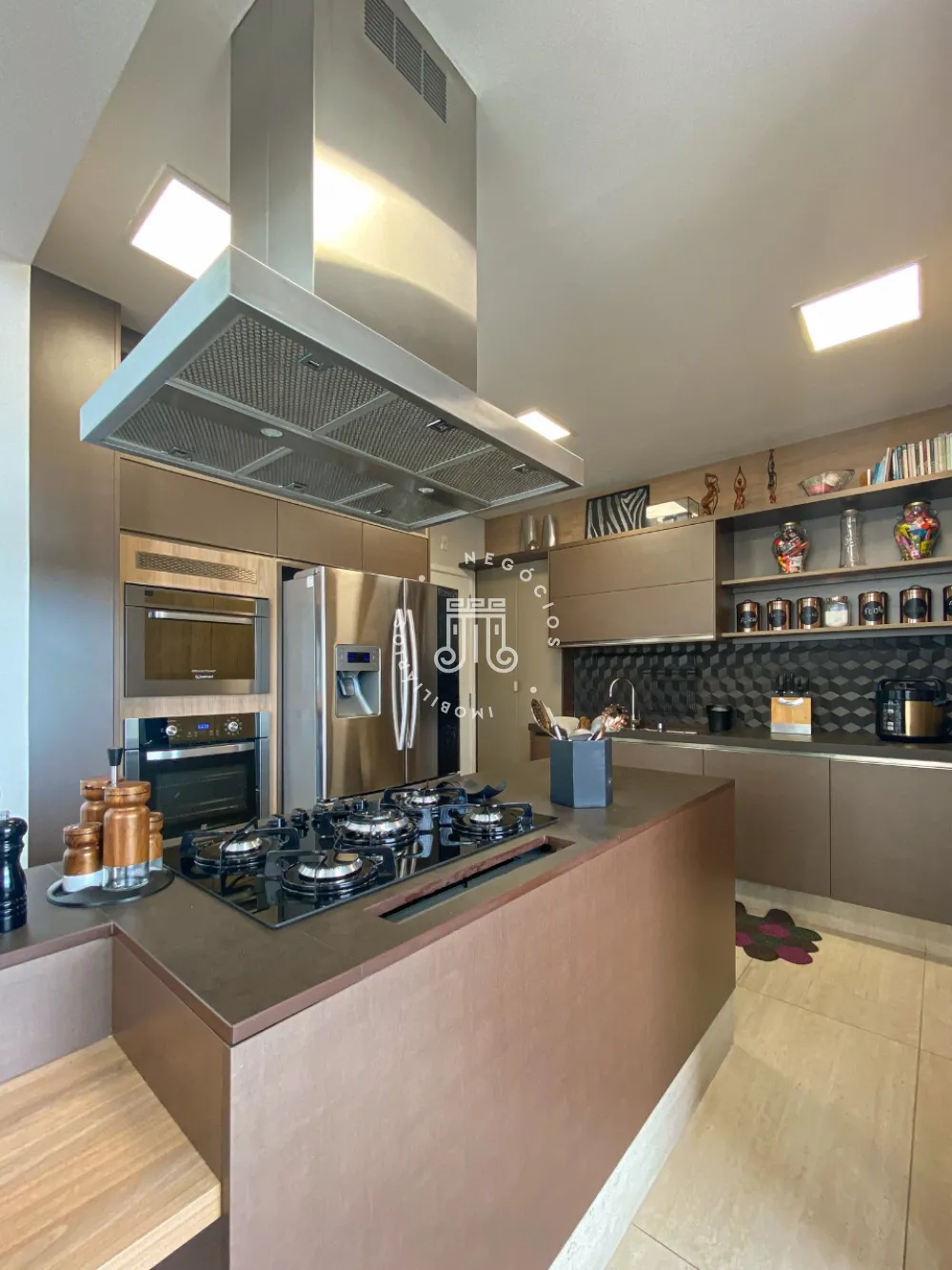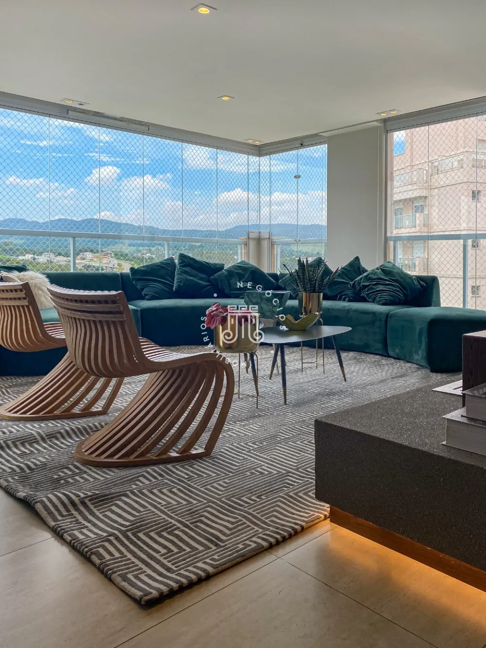 Sala espaçosa para 3 ambientes toda fechada em vidro, área de brinquedoteca, cozinha moderna planejada com mesa e ilha central equipada com eletrodomésticos de última geração, área de churrasqueira, Lavabo, área de lavanderia com armários planejados, aquecedor a gás, dependência completa de serviço.