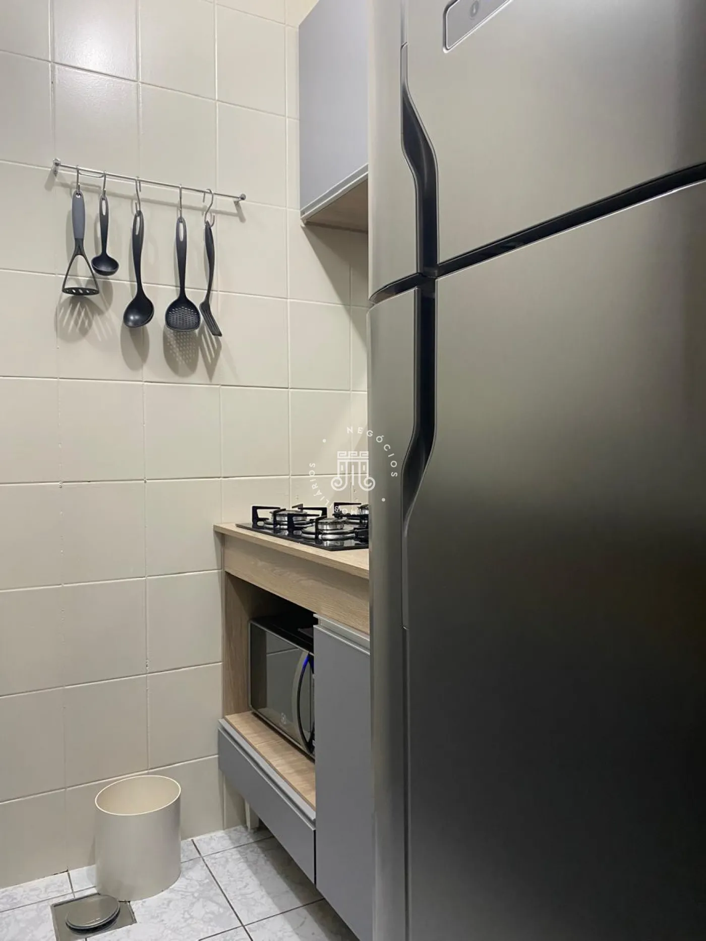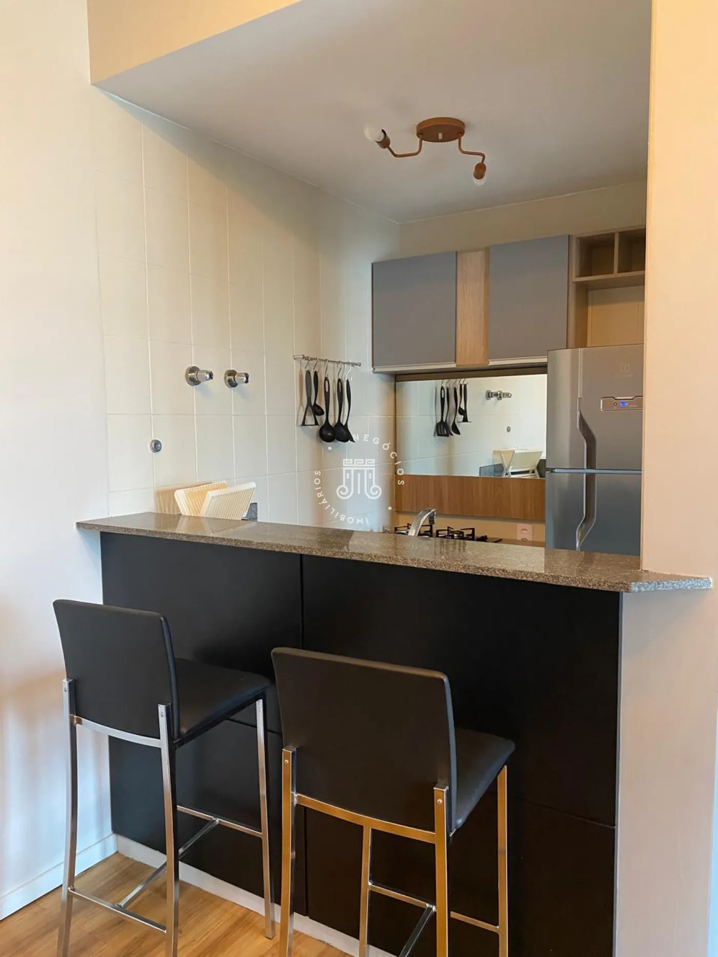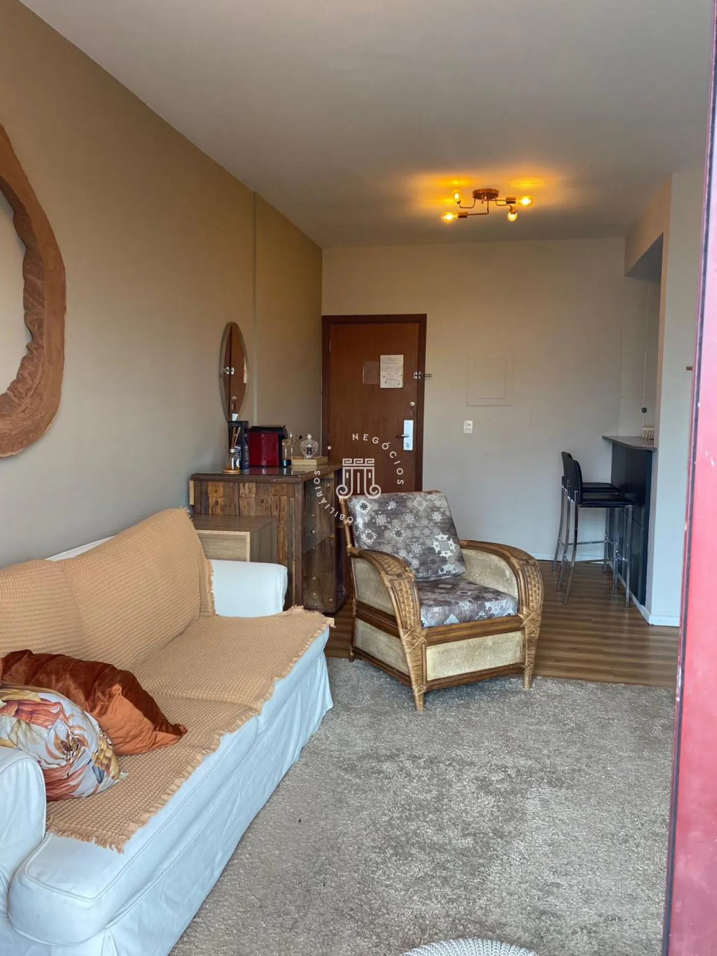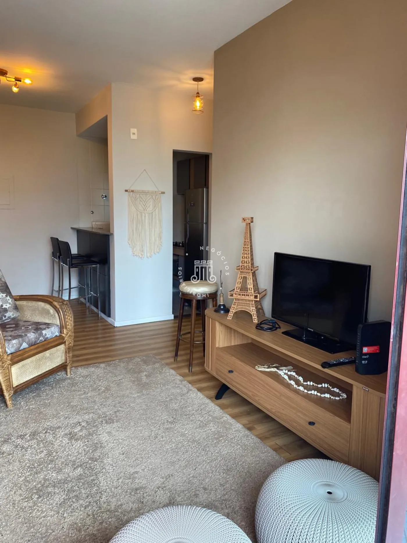 Flat, contendo 1 dormitório com cama, armario, sala com ar condicionado, rack televisão, sofá, poltrona, cozinha com geladeira, fogão cooktop, forno, microondas, maquina lava e seca, dormitório, com armario, cama e televisão.