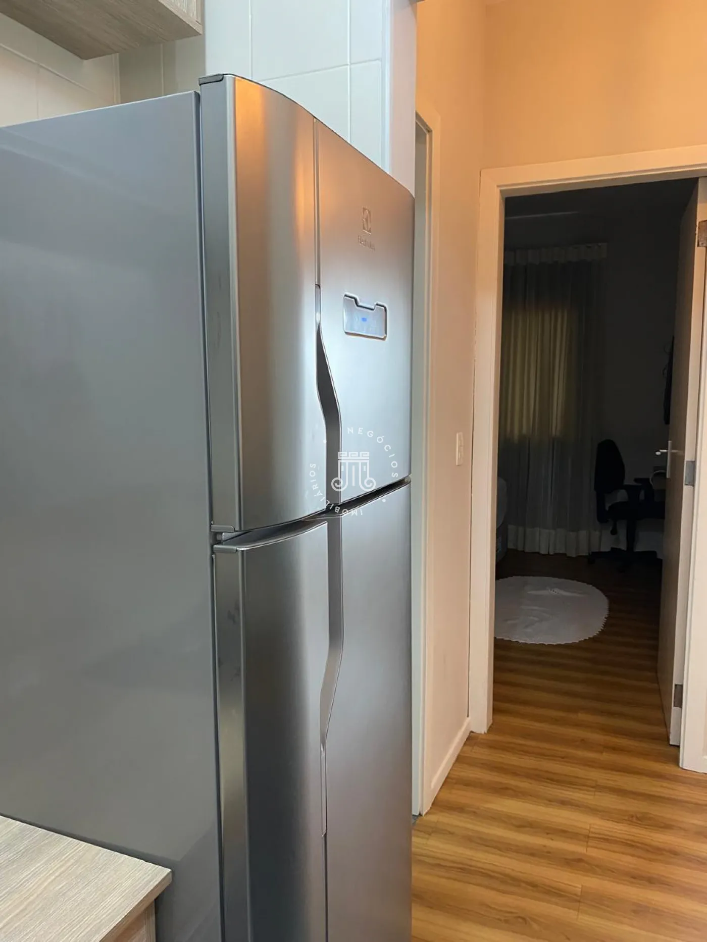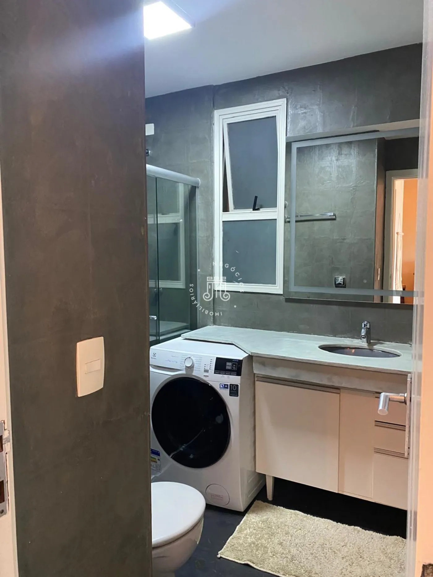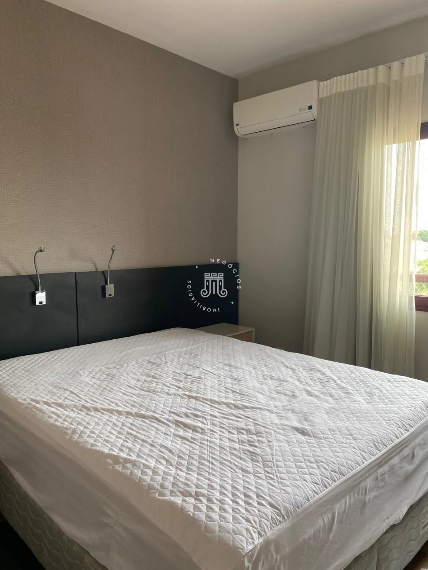 Flat, contendo 1 dormitório com cama, armario, sala com ar condicionado, rack televisão, sofá, poltrona, cozinha com geladeira, fogão cooktop, forno, microondas, maquina lava e seca, dormitório, com armario, cama e televisão.