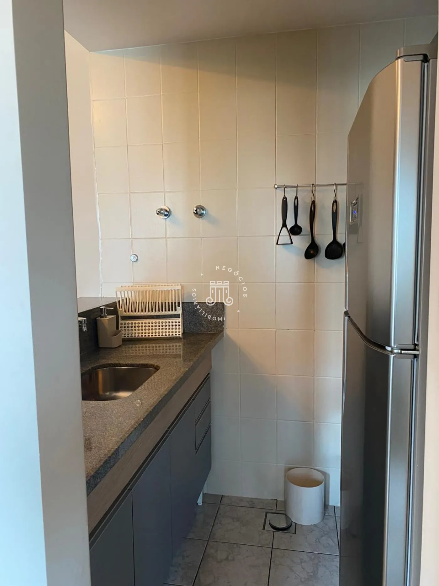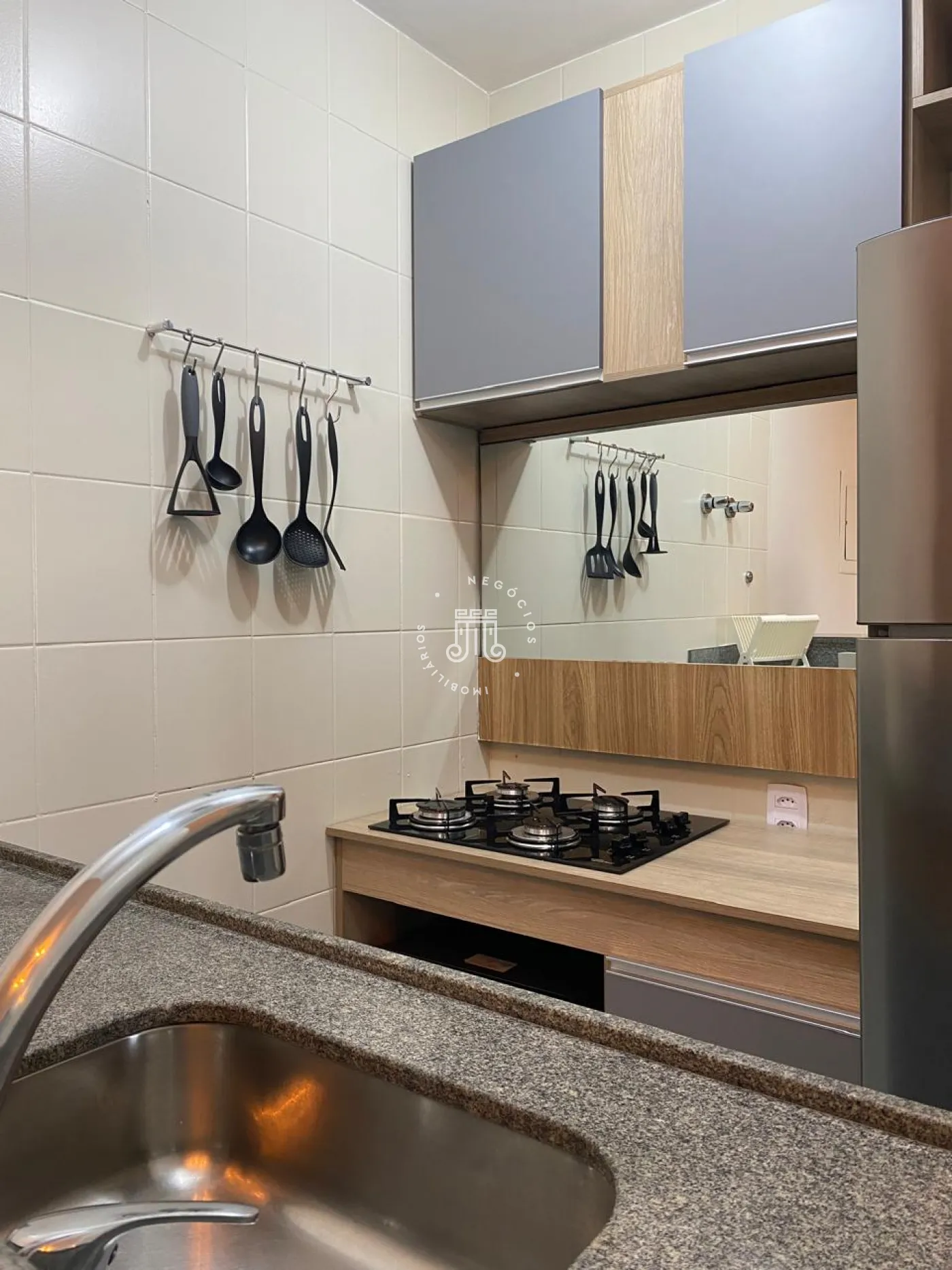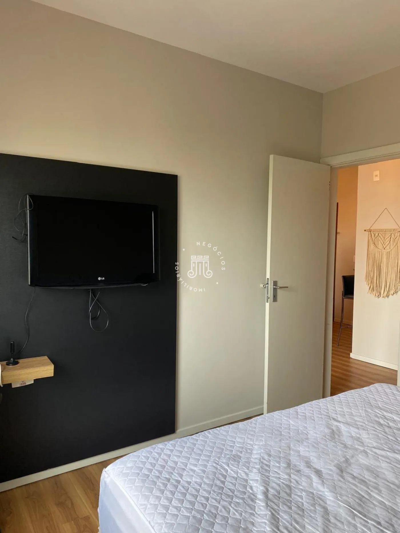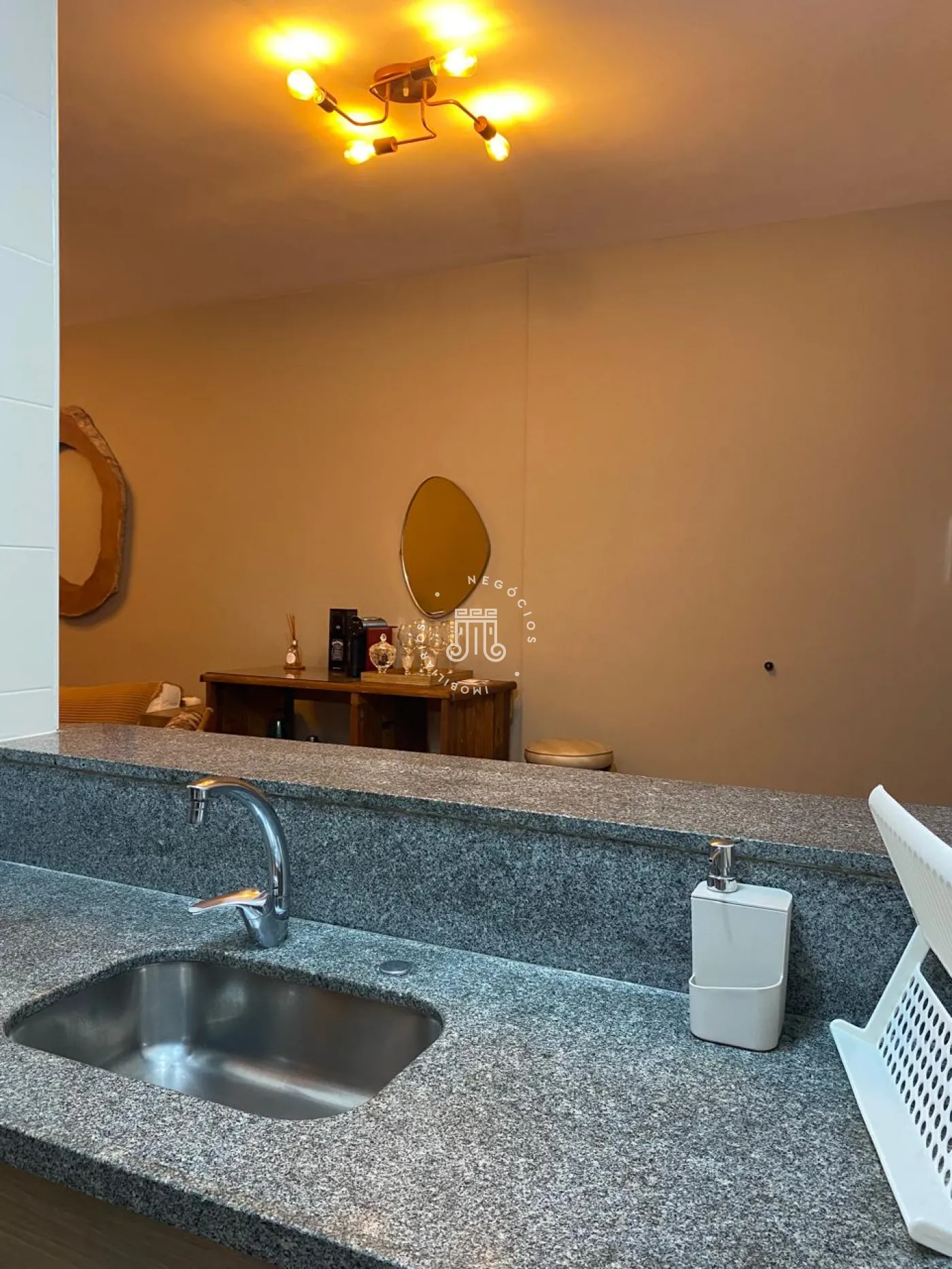 Flat, contendo 1 dormitório com cama, armario, sala com ar condicionado, rack televisão, sofá, poltrona, cozinha com geladeira, fogão cooktop, forno, microondas, maquina lava e seca, dormitório, com armario, cama e televisão.