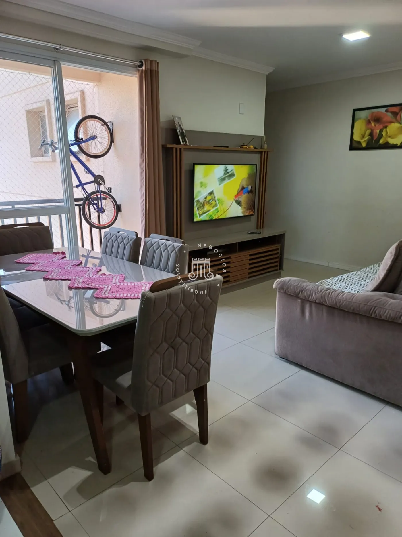Apartamento 77 metros, com 3 quartos, com planejados, sendo 1 suite com box de vidro, banheiro social com box de vidro, sala para 2 ambientes com varanda, cozinha planejada, área de serviço, 2 vagas de garagem descobertas. Sol da manhã.