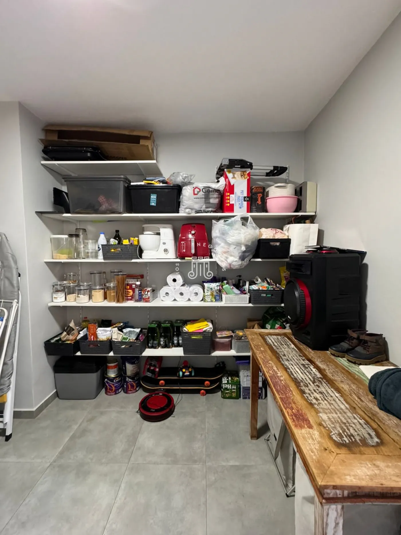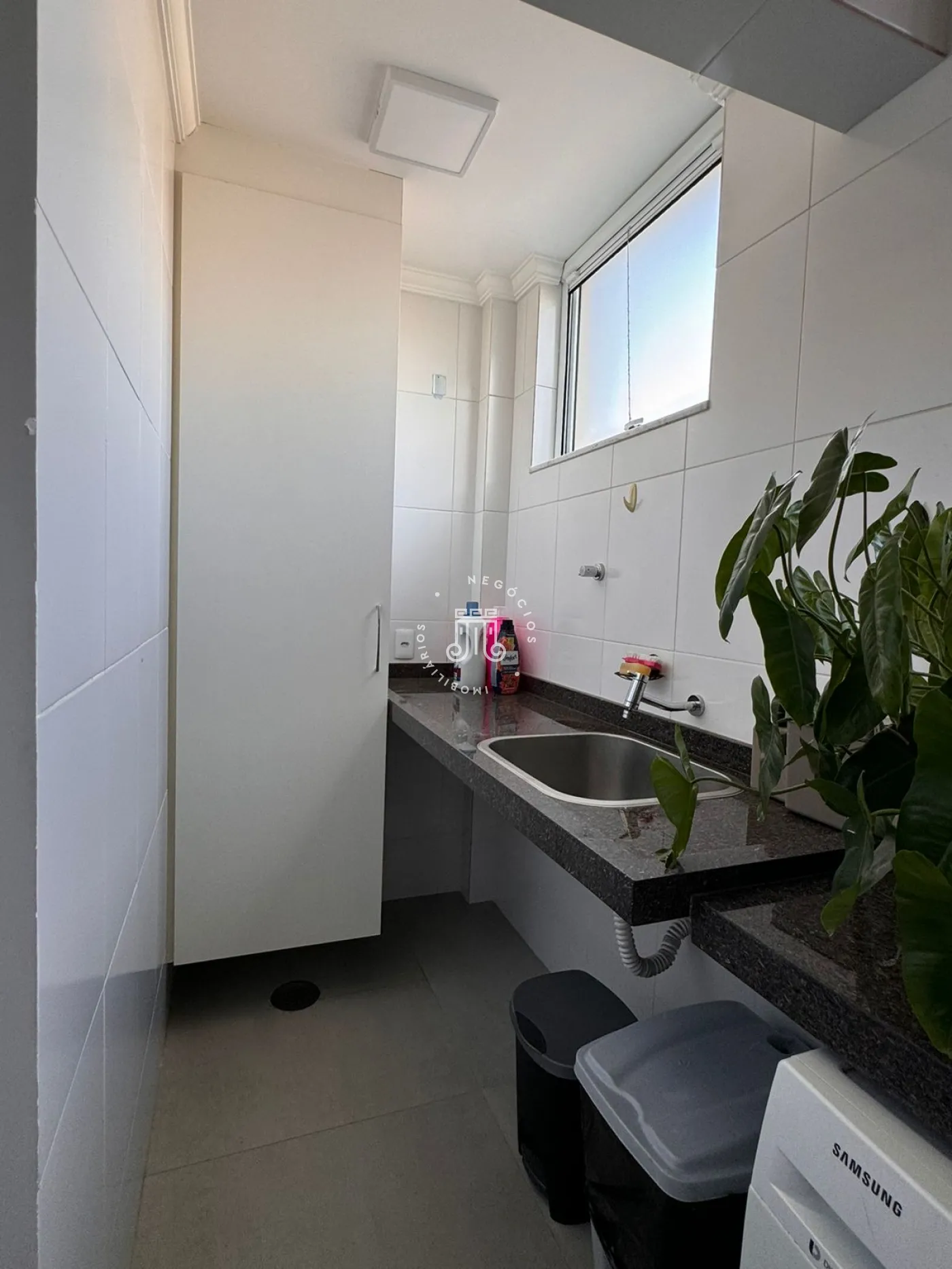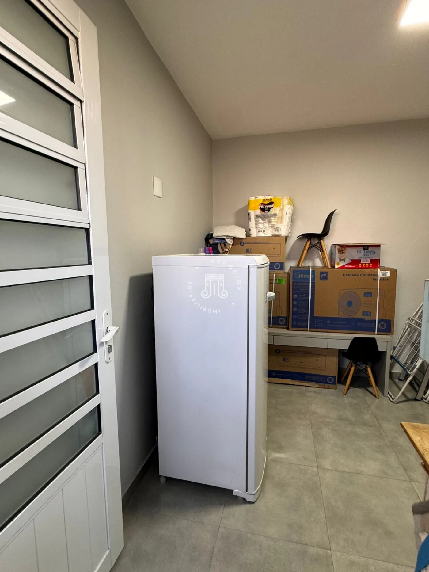 O apartamento possui duas portas de entrada, uma para a sala e outra para a cozinha, lavanderia espaçosa com armário vertical. Quarto/despensa com prateleiras, ideal para organização.