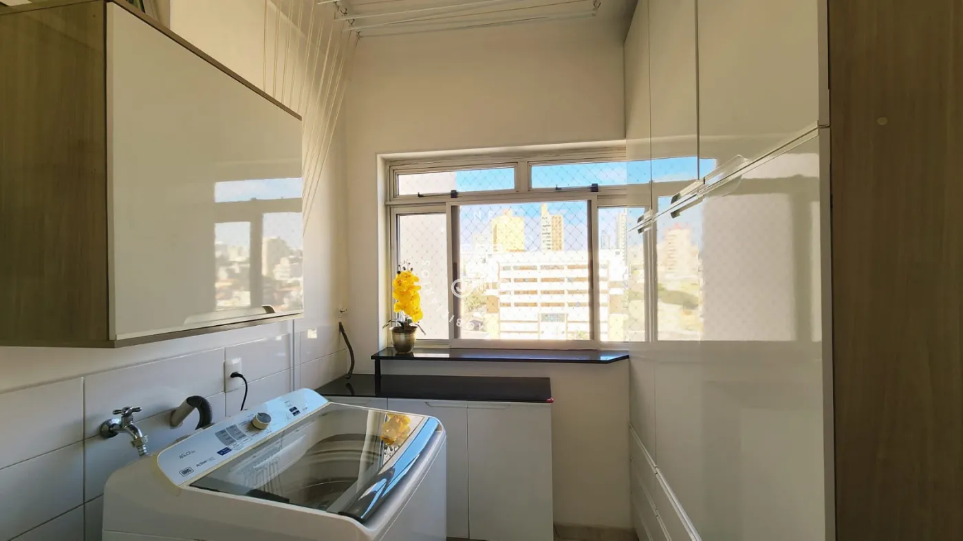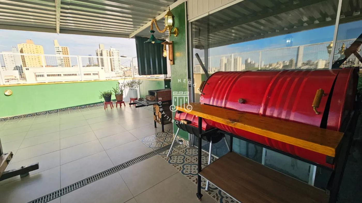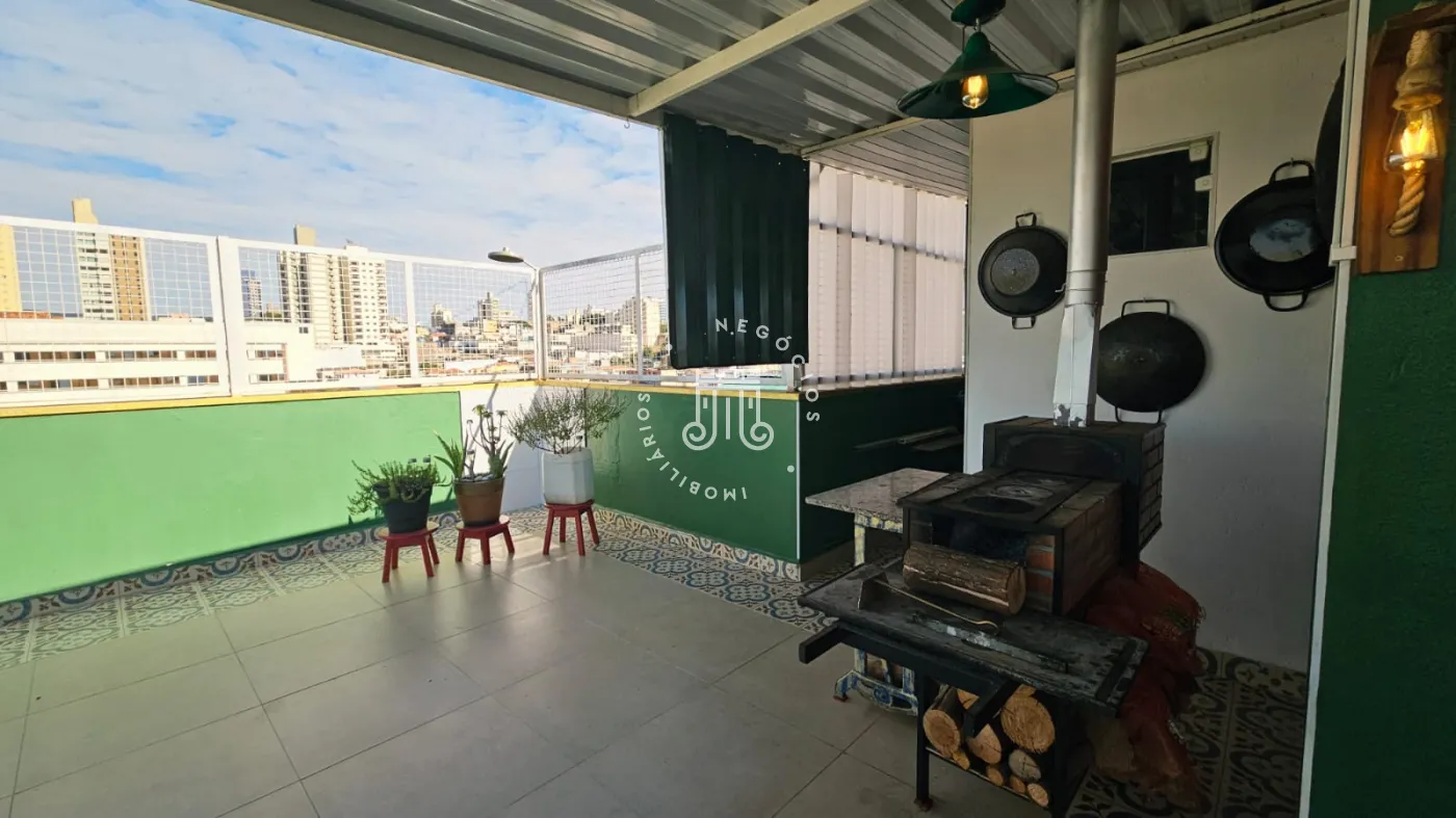 Imóvel com 93 metros quadrados de área útil, distribuídos em três quartos, sendo uma suíte, dois banheiros, sala, cozinha com armários, lavanderia, além de uma vaga de garagem. O apartamento possui terraço privativo na cobertura, também com 93 metros quadrados, com churrasqueira e acesso por escada.