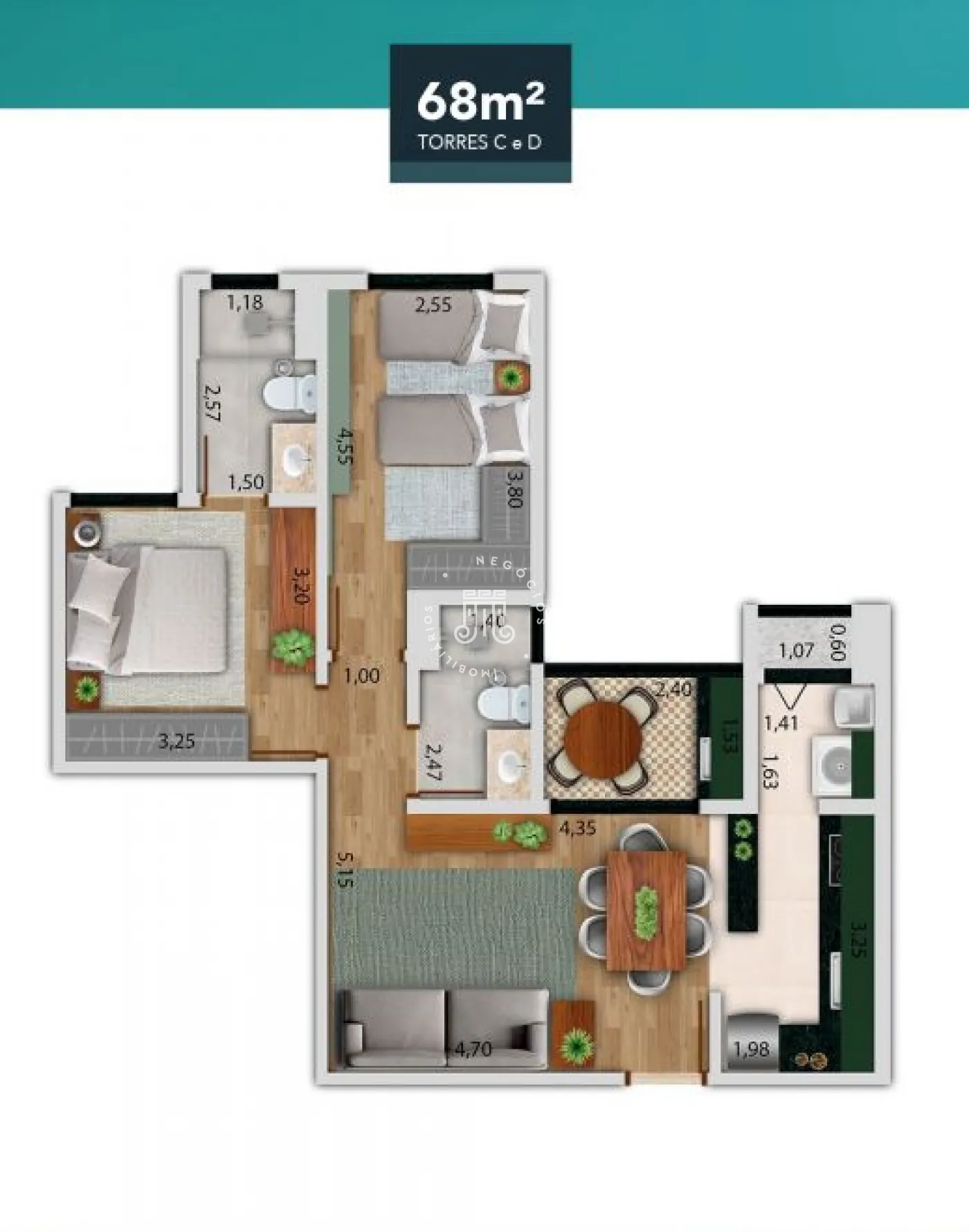 Imóvel com sol da manhã possui dois quartos sendo uma suíte, sala de estar, cozinha, área de serviço, um banheiro e uma vaga coberta.