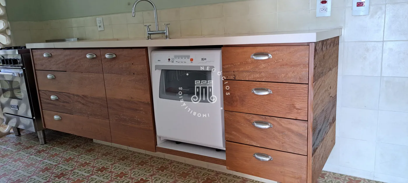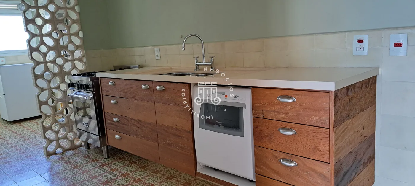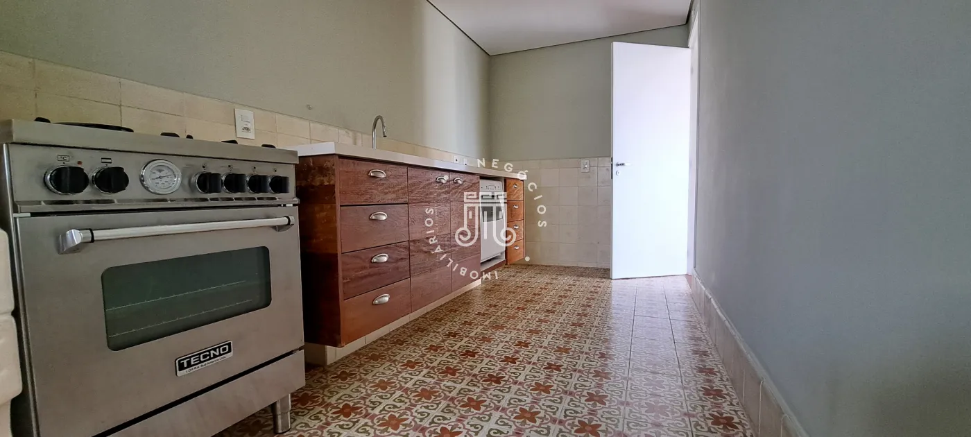Piso em madeira, cozinha com ladrilho hidráulico, pia com triturador e armários planejados em madeira.