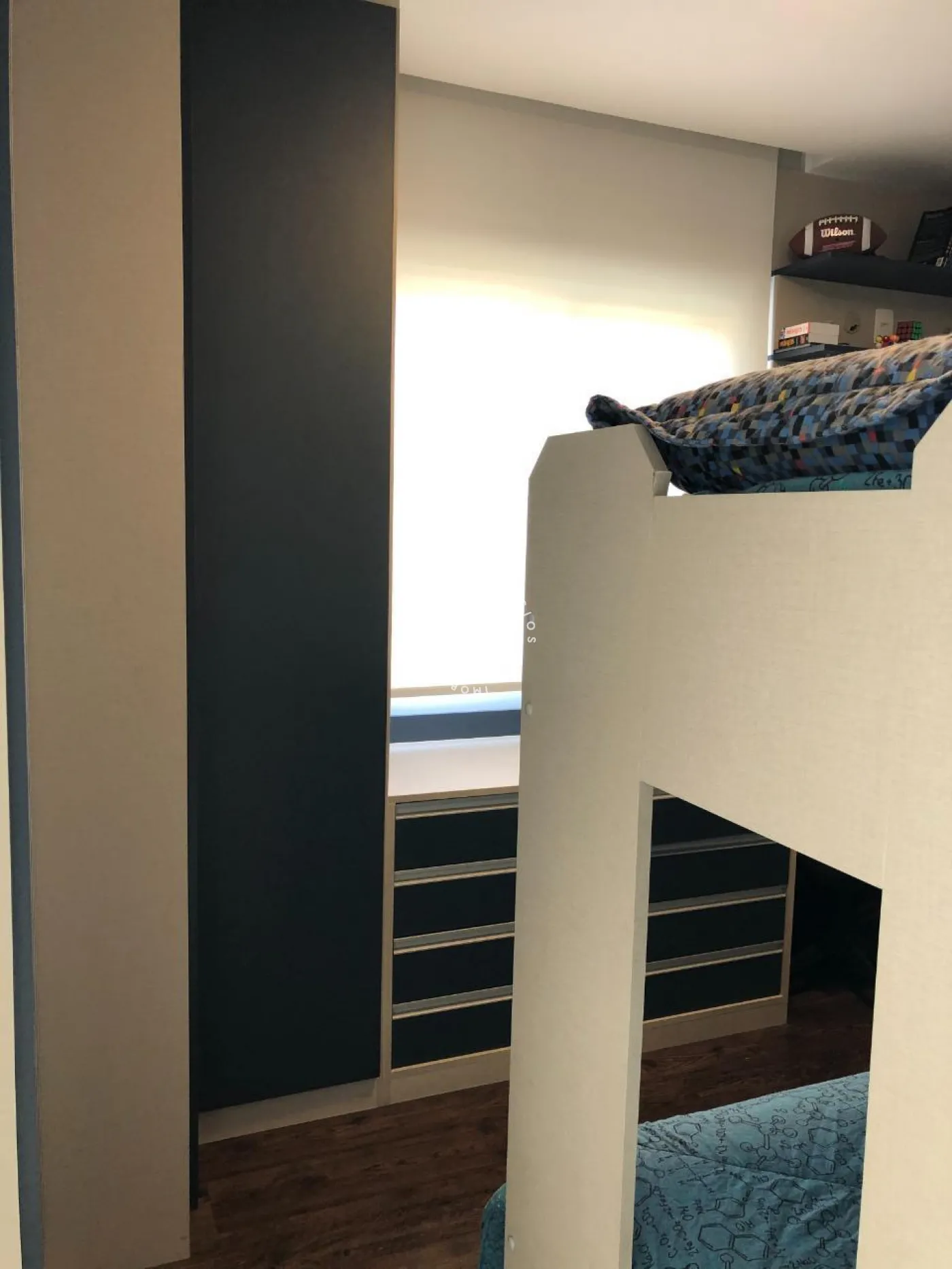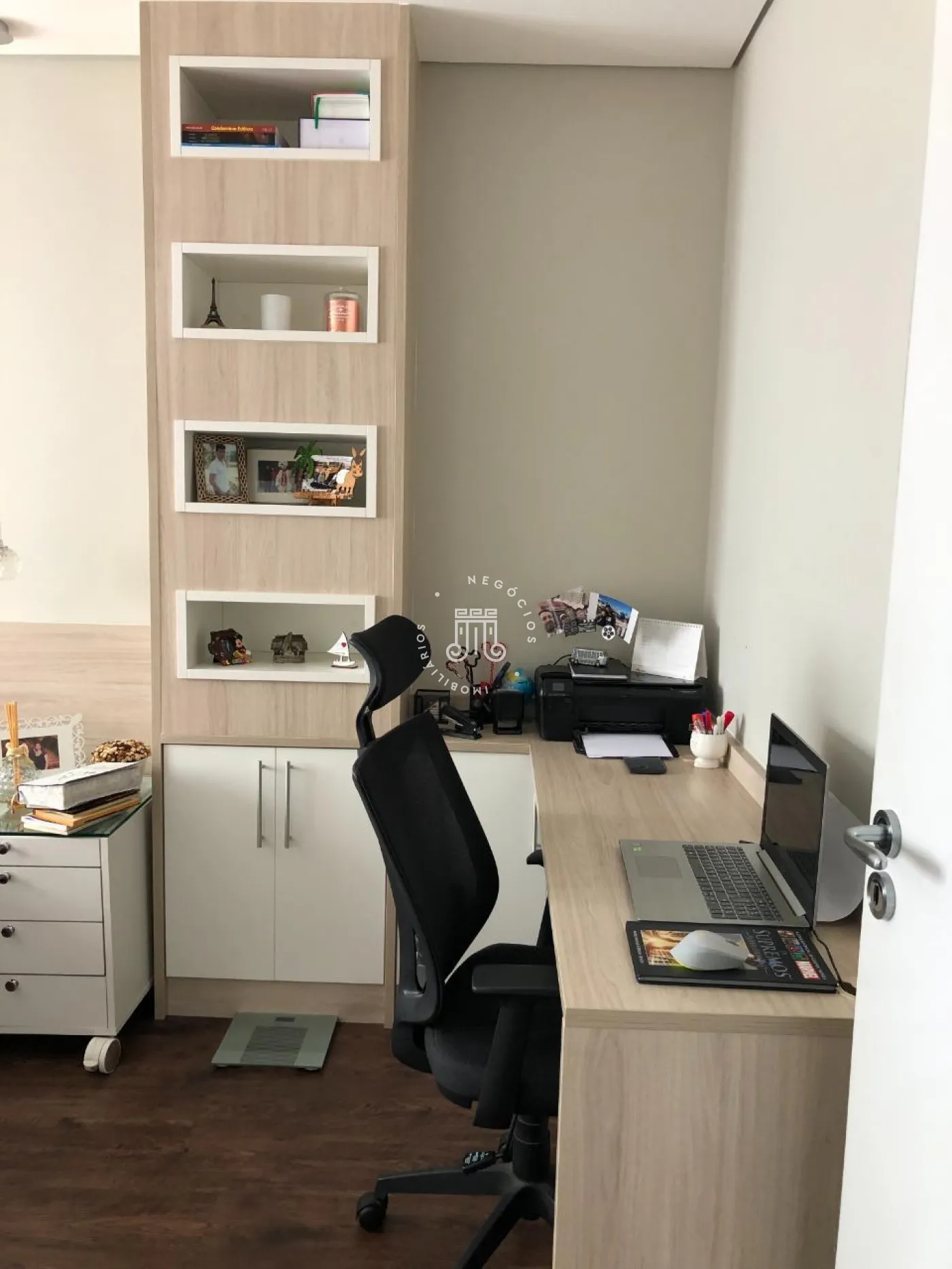 O imóvel possui três dormitórios, sendo uma suíte, um quarto de solteiro e um cômodo utilizado como closet. Na saída, há duas vagas fixas e cobertas. O espaço comum oferece cinema, piscina, quadra poliesportiva e área de jogos. As crianças dispõem de playgrounds, brinquedoteca e sala de balé. Há também espaço destinado a animais de estimação, sala de estudos e acesso à internet em área compartilhada.
