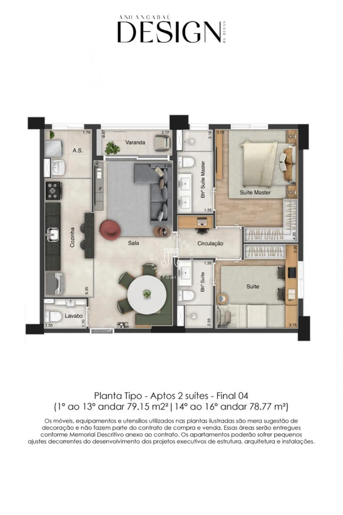 Dispõe de cozinha prática e bem organizada, além de área de serviço independente. Na área íntima, são duas suítes, garantindo privacidade e comodidade para os moradores, além de lavabo que atende perfeitamente às áreas sociais.