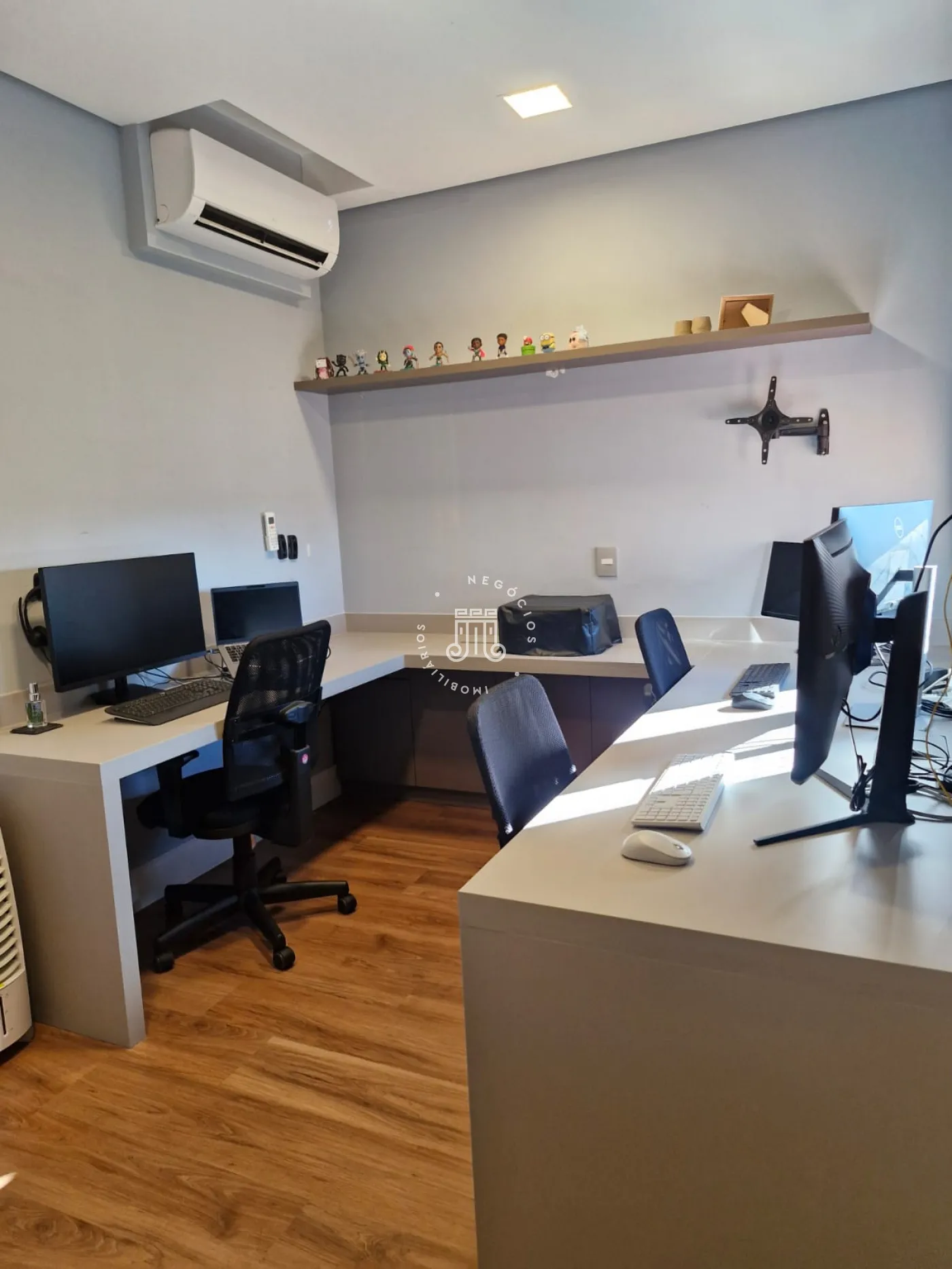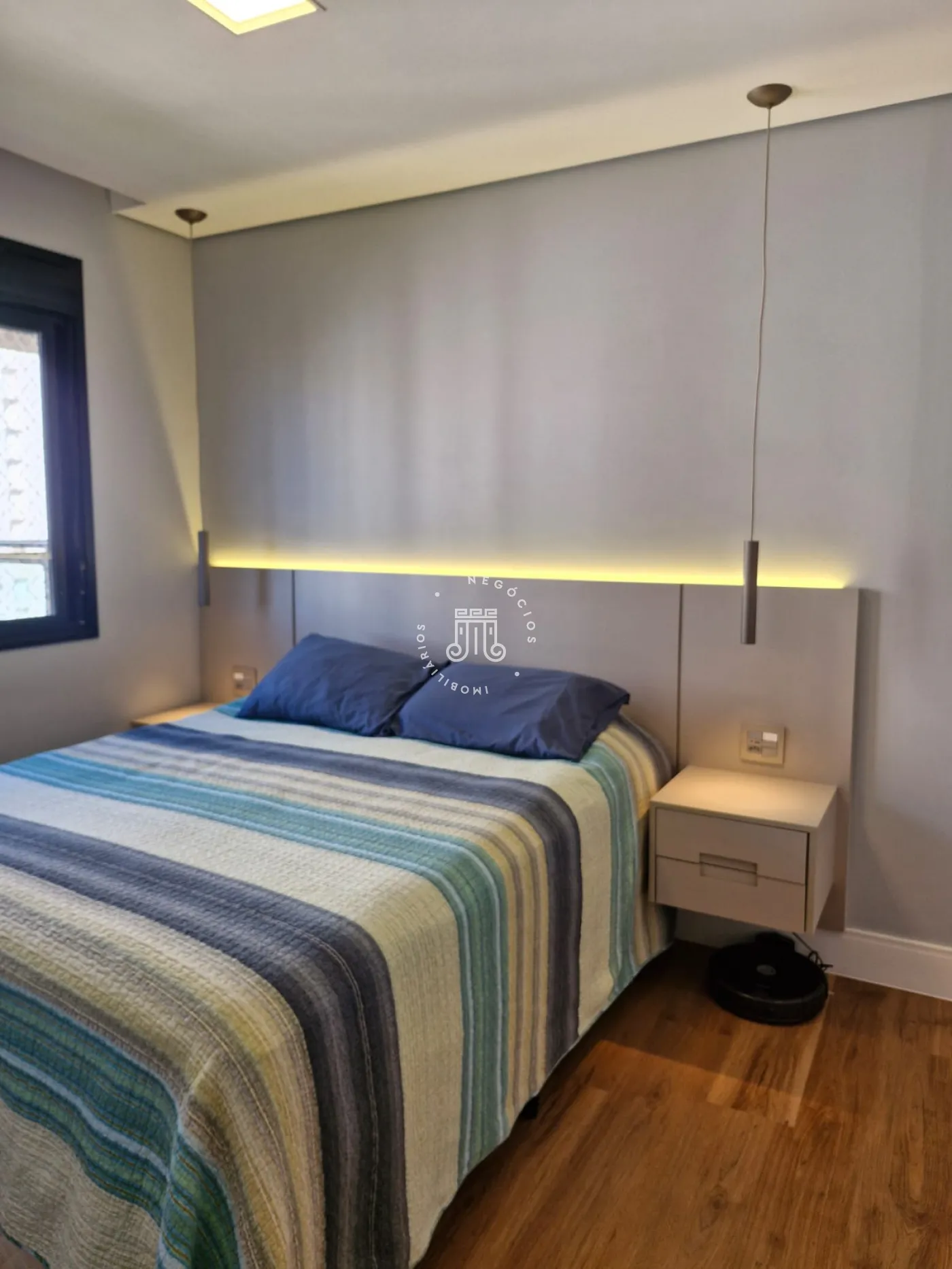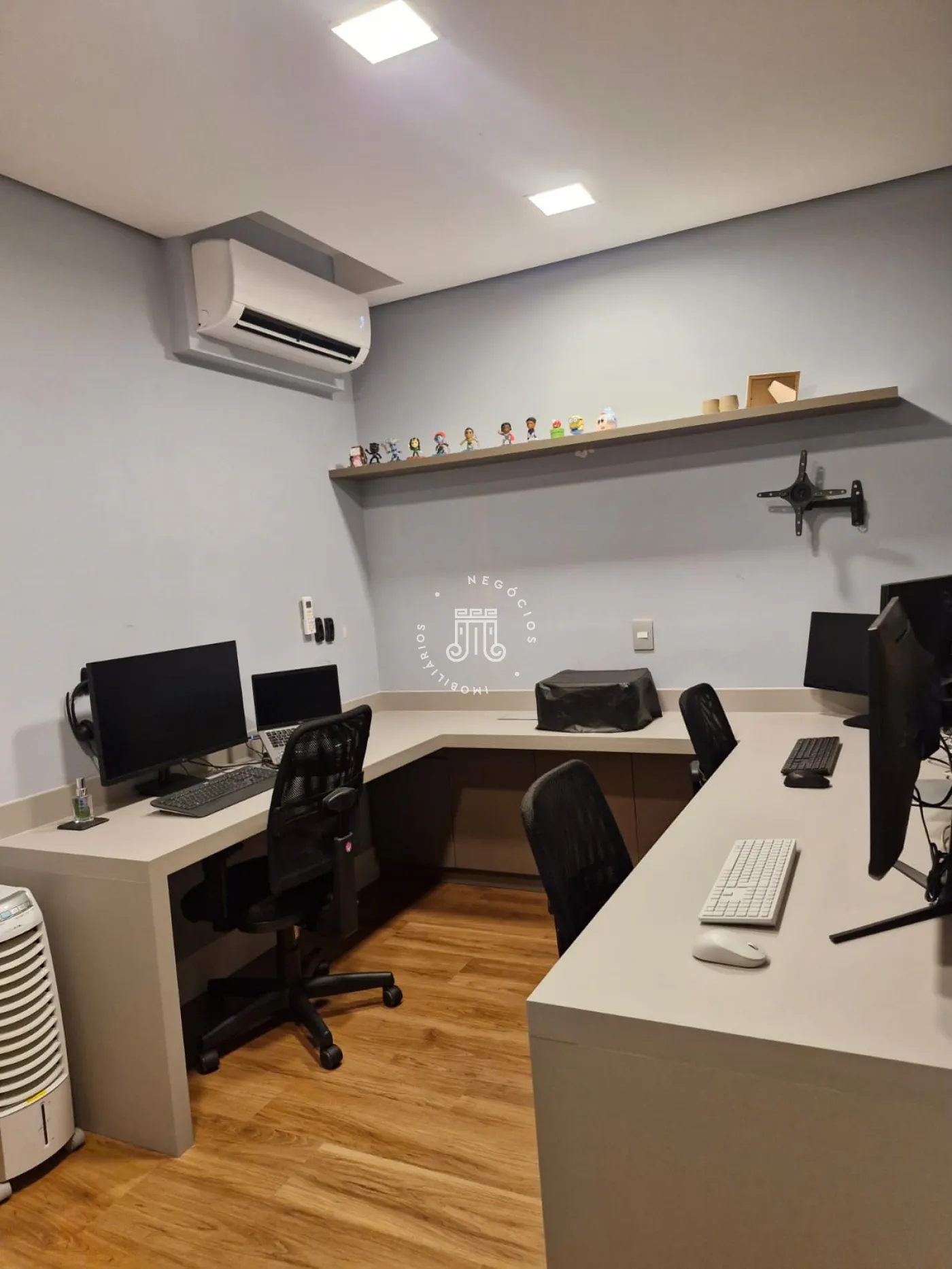 O imóvel possui: 03 suítes sendo 1 máster com closet todas com armários planejados, sala ampliada em piso porcelanato, lavabo, varanda com fechamento de vidro, cozinha americana com armários planejados cooktop, forno e coifa embutidos, área de serviço, 03 pontos de ar condicionado com infraestrutura e 03 vagas cobertas + depósito.