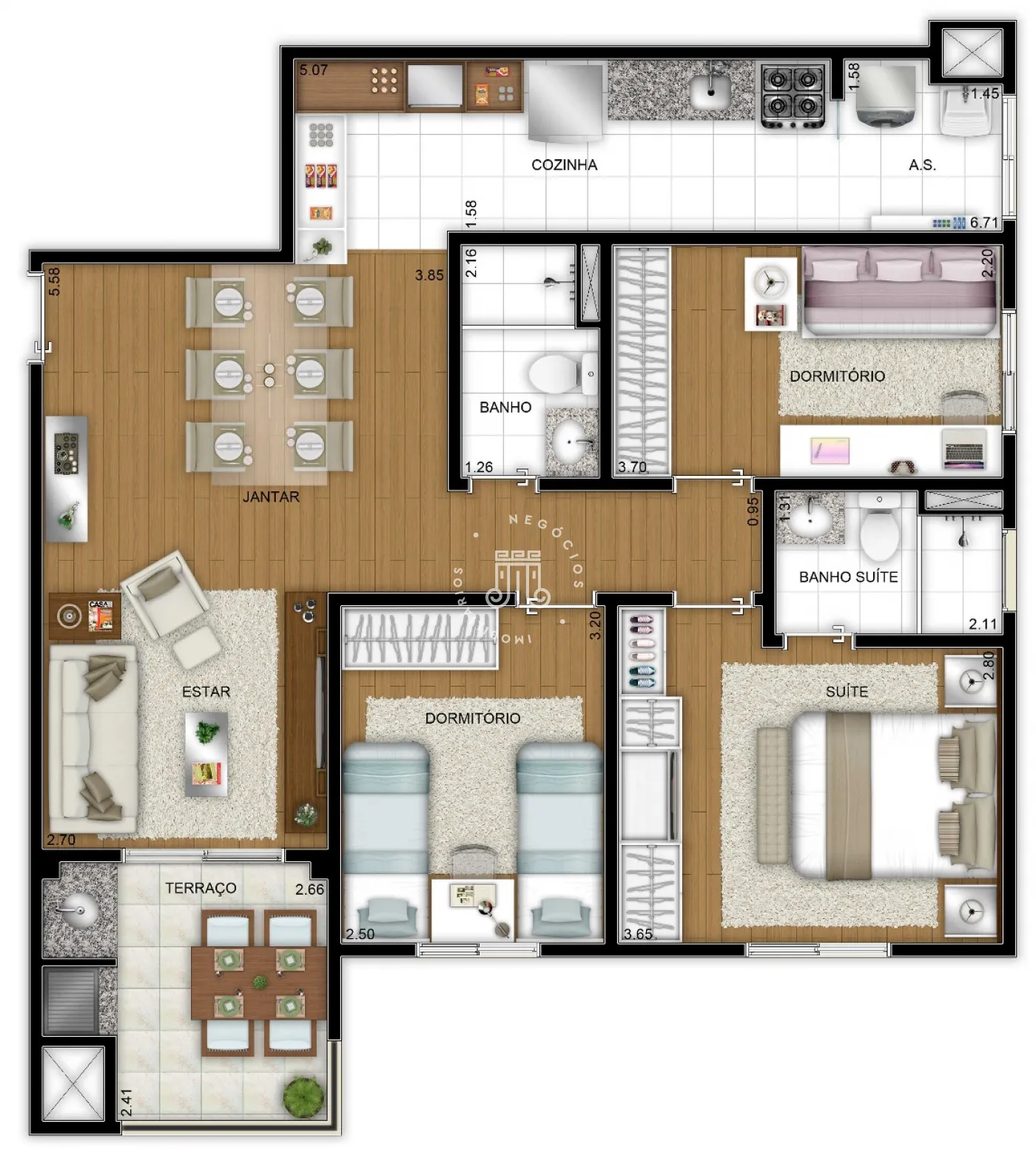 Apartamento com 3 dormitórios, sendo 1 suíte, todos com armários planejados, banheiro social, sala 2 ambientes integrada com espaço gourmet, fechamento em vidro, pia com armário, churrasqueira, cozinha com armários planejados, bancada e pia novas em granito, cooktop e depurador, torre com forno e microondas, área de serviço, acabamento em gesso, piso laminado, piso frio nas áreas úmidas, 2 vagas de garagem., sol da manhã.