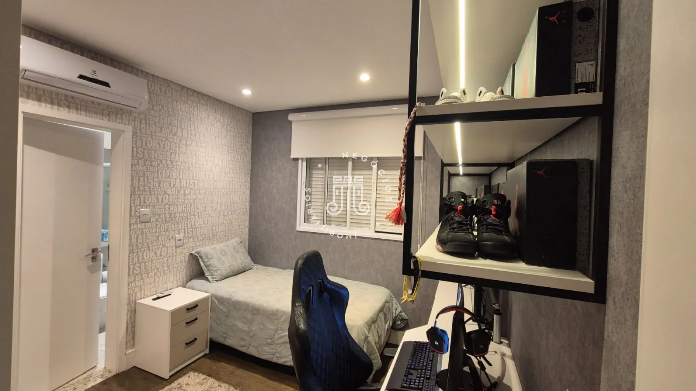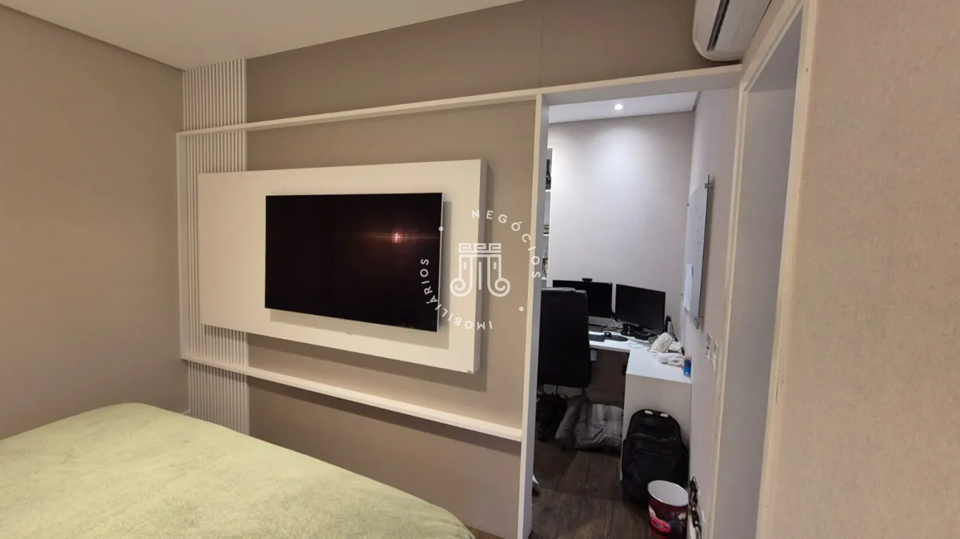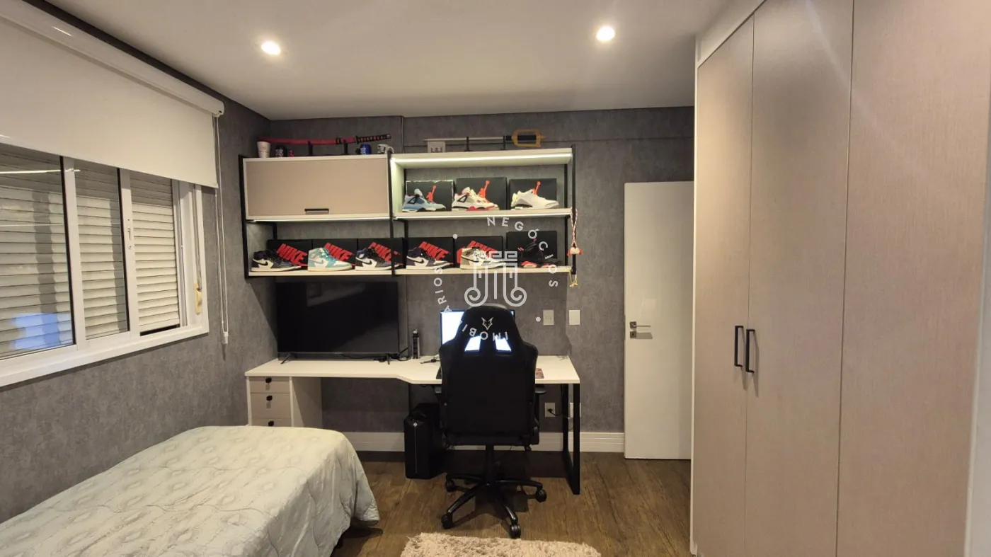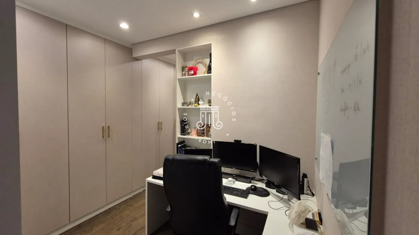 Imóvel possui quatro suítes todas com móveis planejados, todos os banheiros com box de vidro, escritório planejado, lavabo, área gourmet, área de serviço com armários planejados, banheiro de serviço, cozinha planejada com cooktop e forno embutido, sala ampla, sendo de jantar e TV. Todos os planejados, alguns móveis e eletrodomésticos ficam no apartamento.