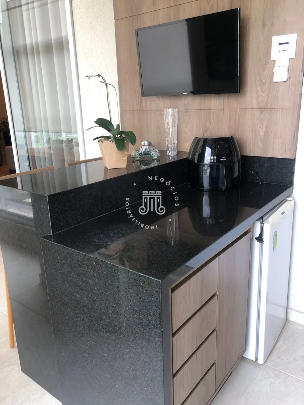 - Varanda gourmet com churrasqueira, armários planejados e fechamento em vidro.
