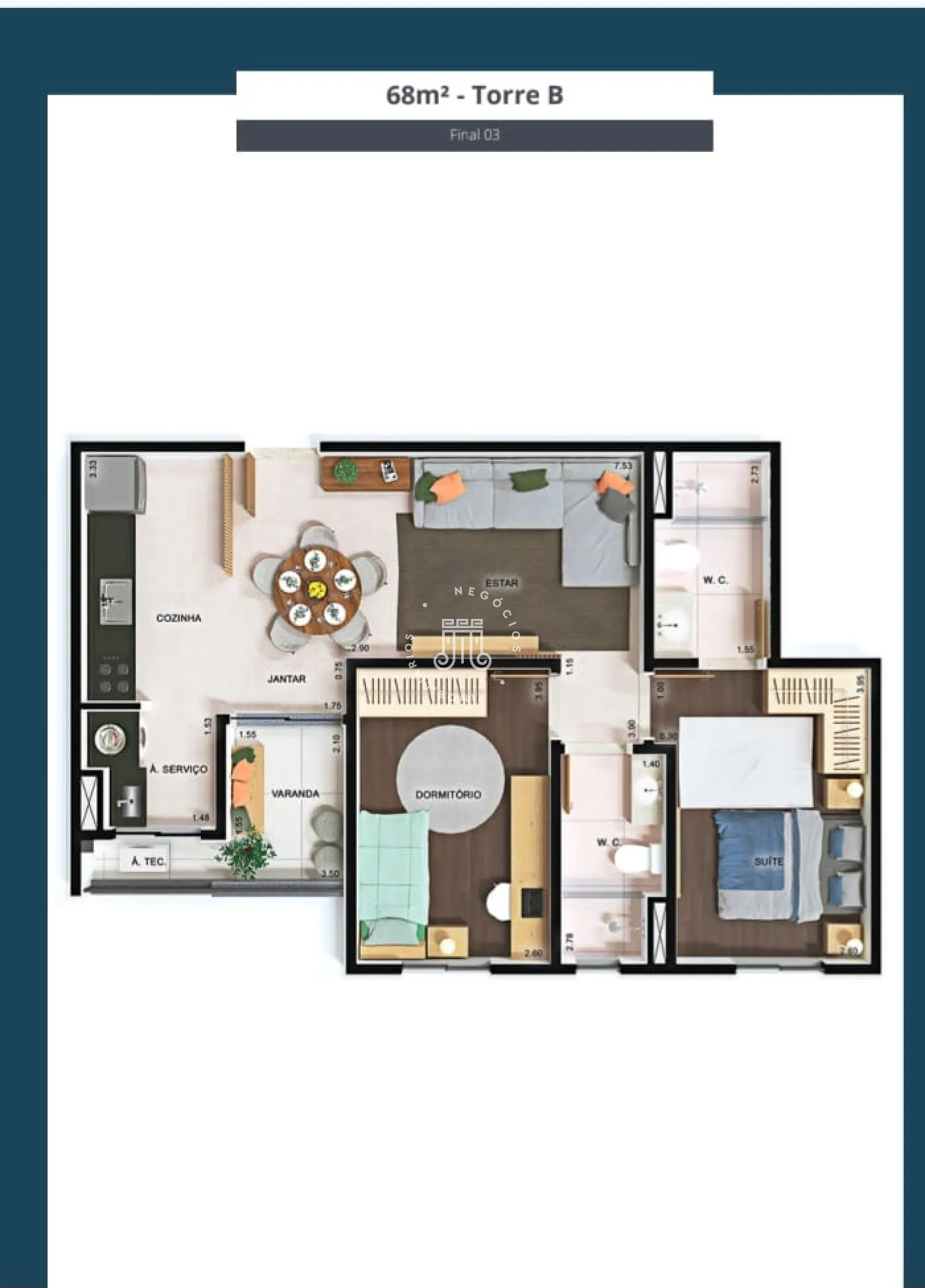Com 2 dormitórios, sendo 1 suíte, sala com 2 ambientes e sacada, cozinha, lavanderia, 1 vaga de garagem. Todo em piso cerâmico. Sol da manhã.