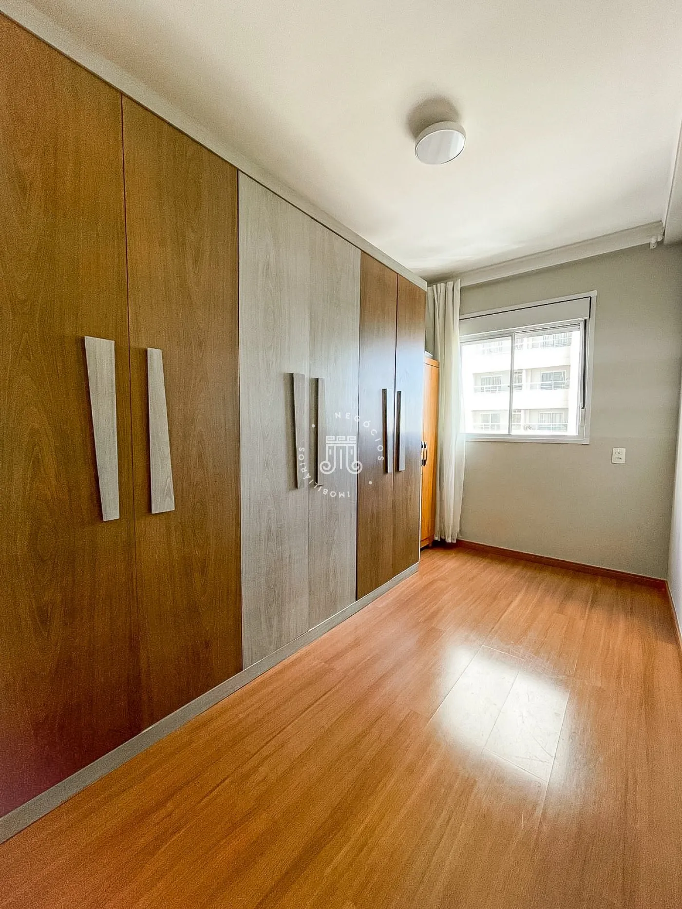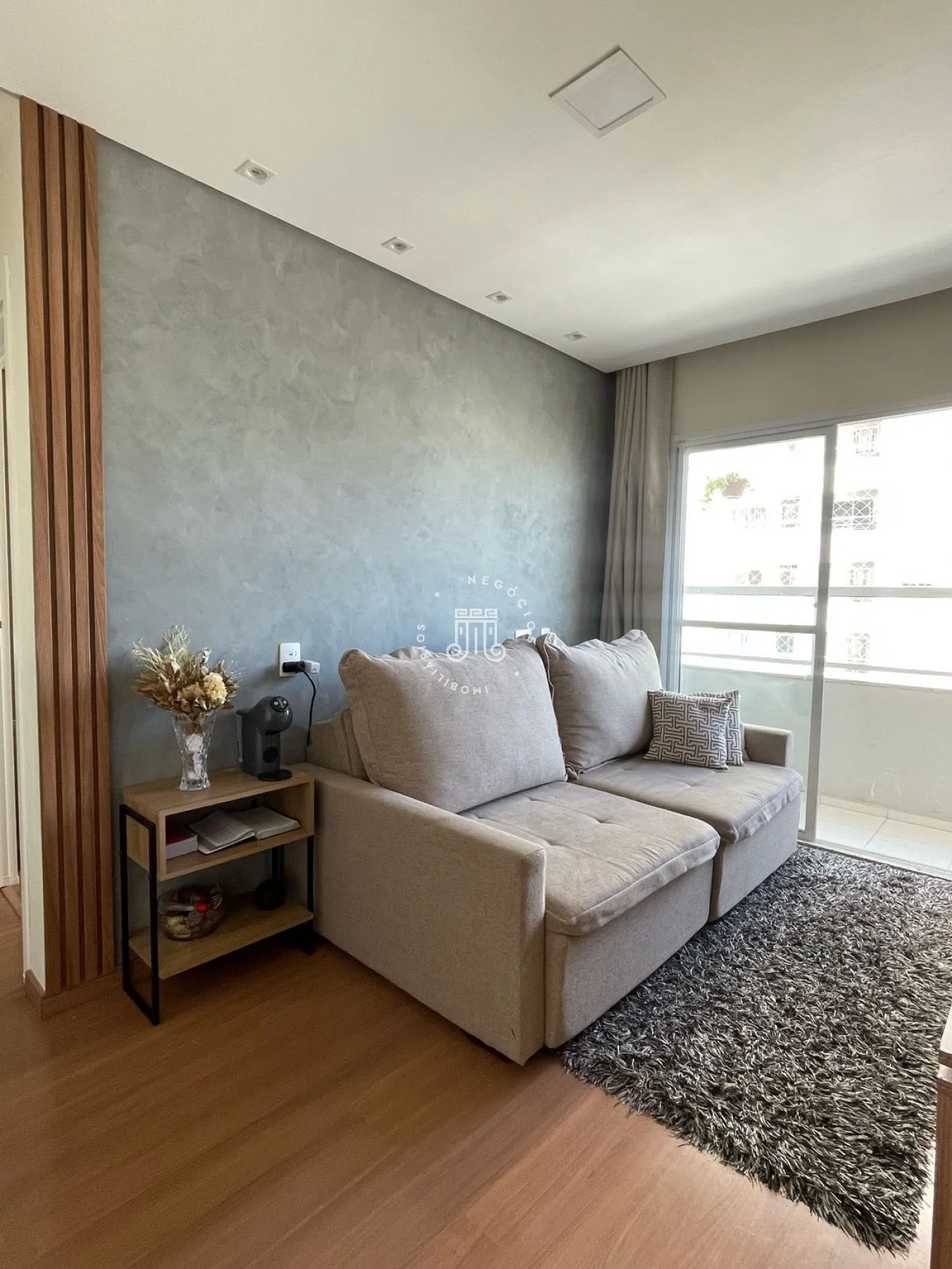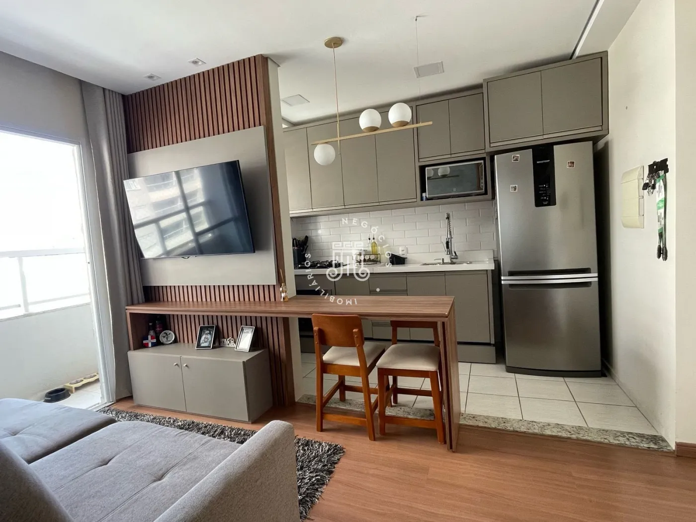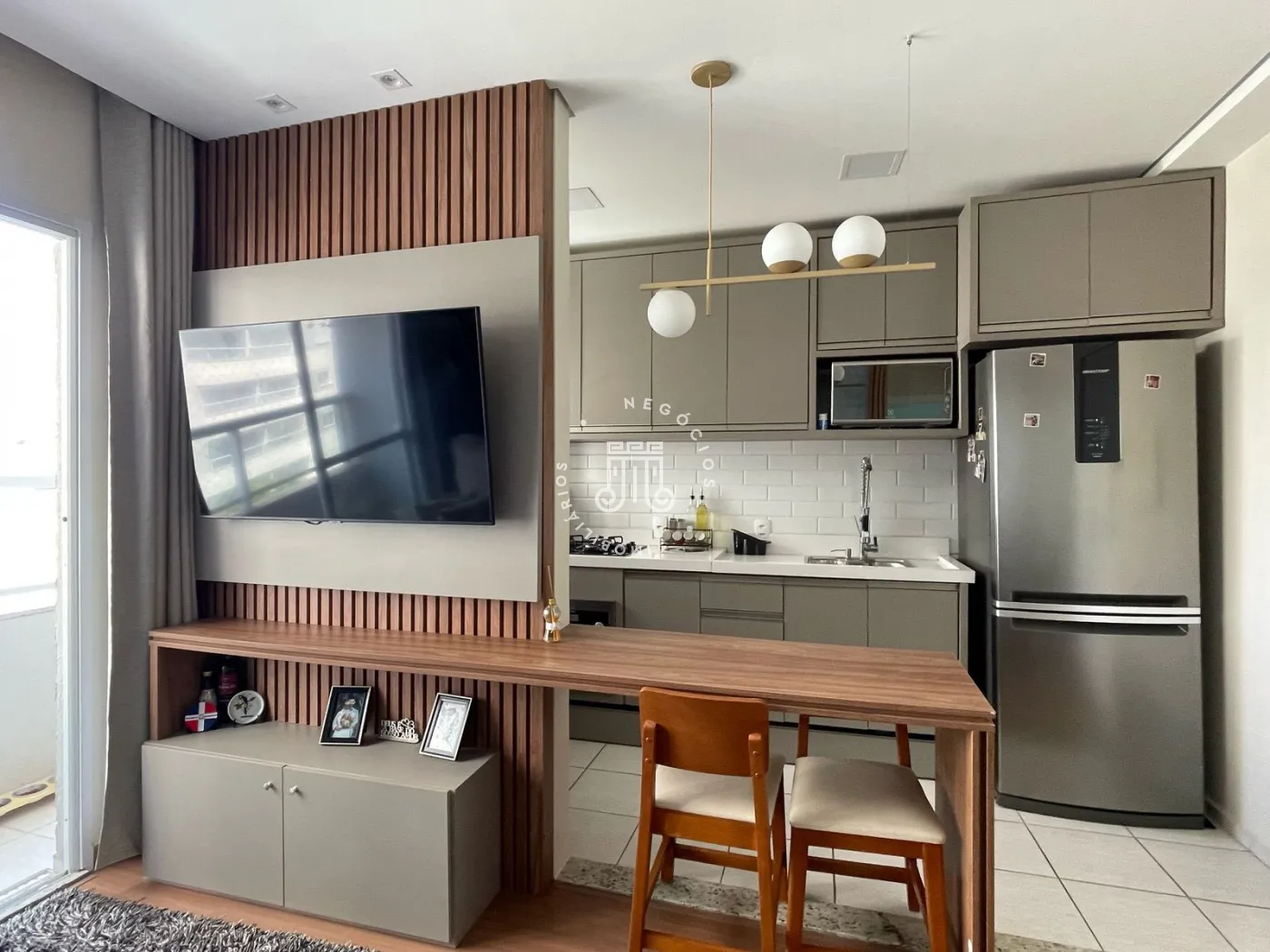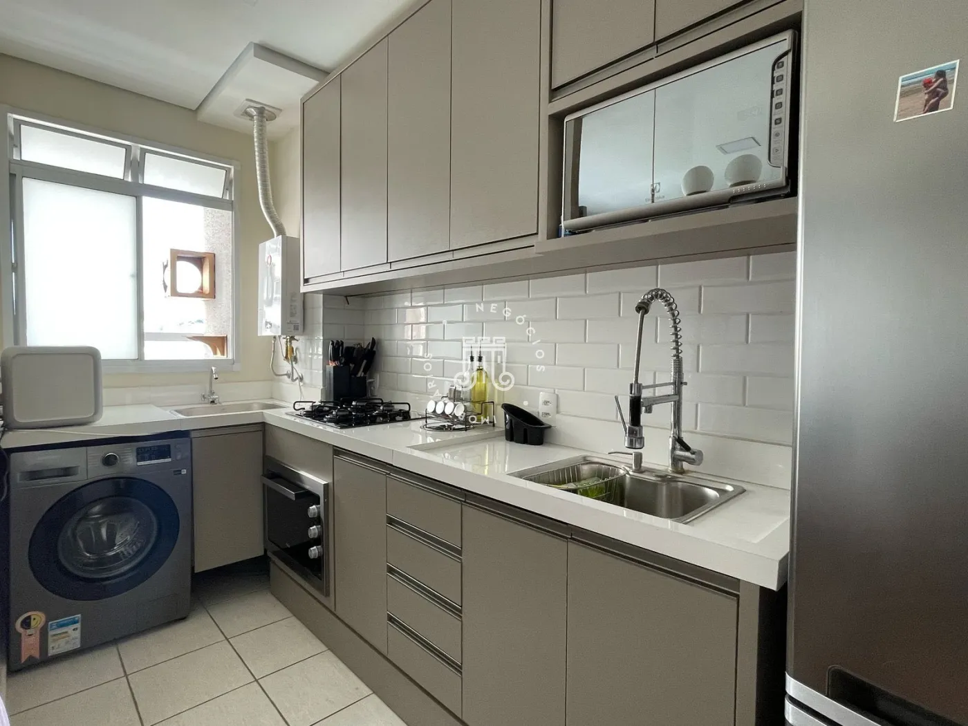 O imóvel possui dois dormitórios, sala de estar com varanda, cozinha com armários planejados e lustres, área de serviço integrada à cozinha e uma vaga de garagem.