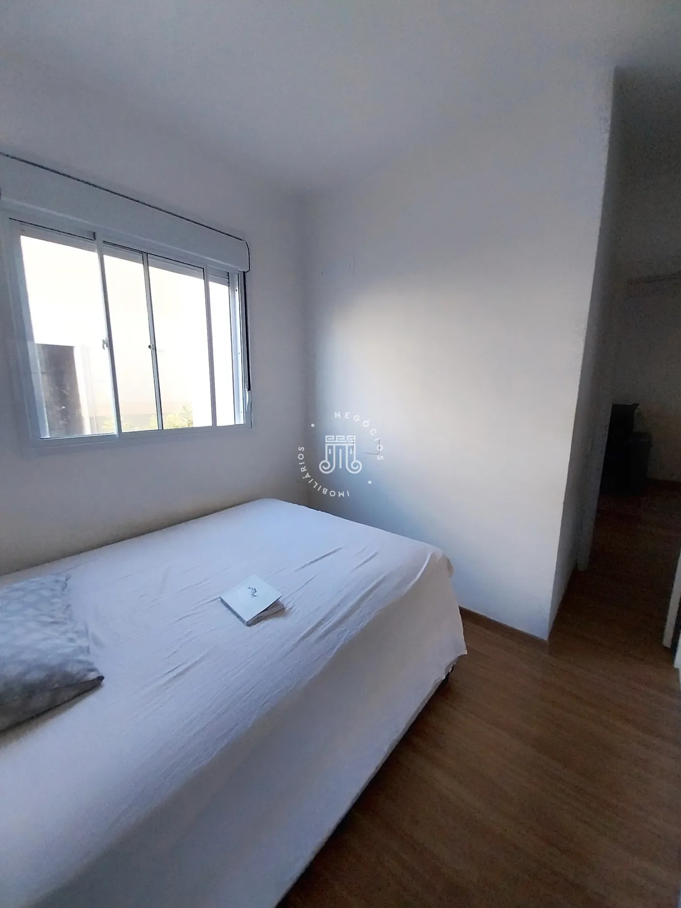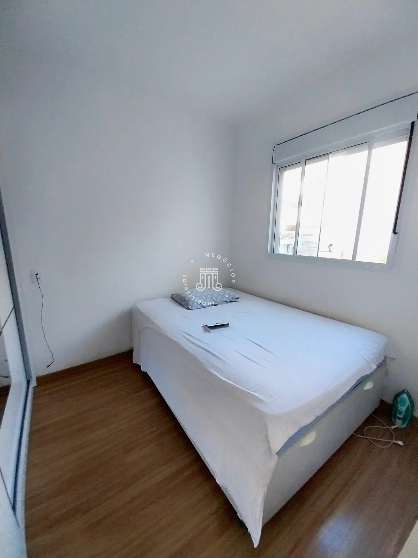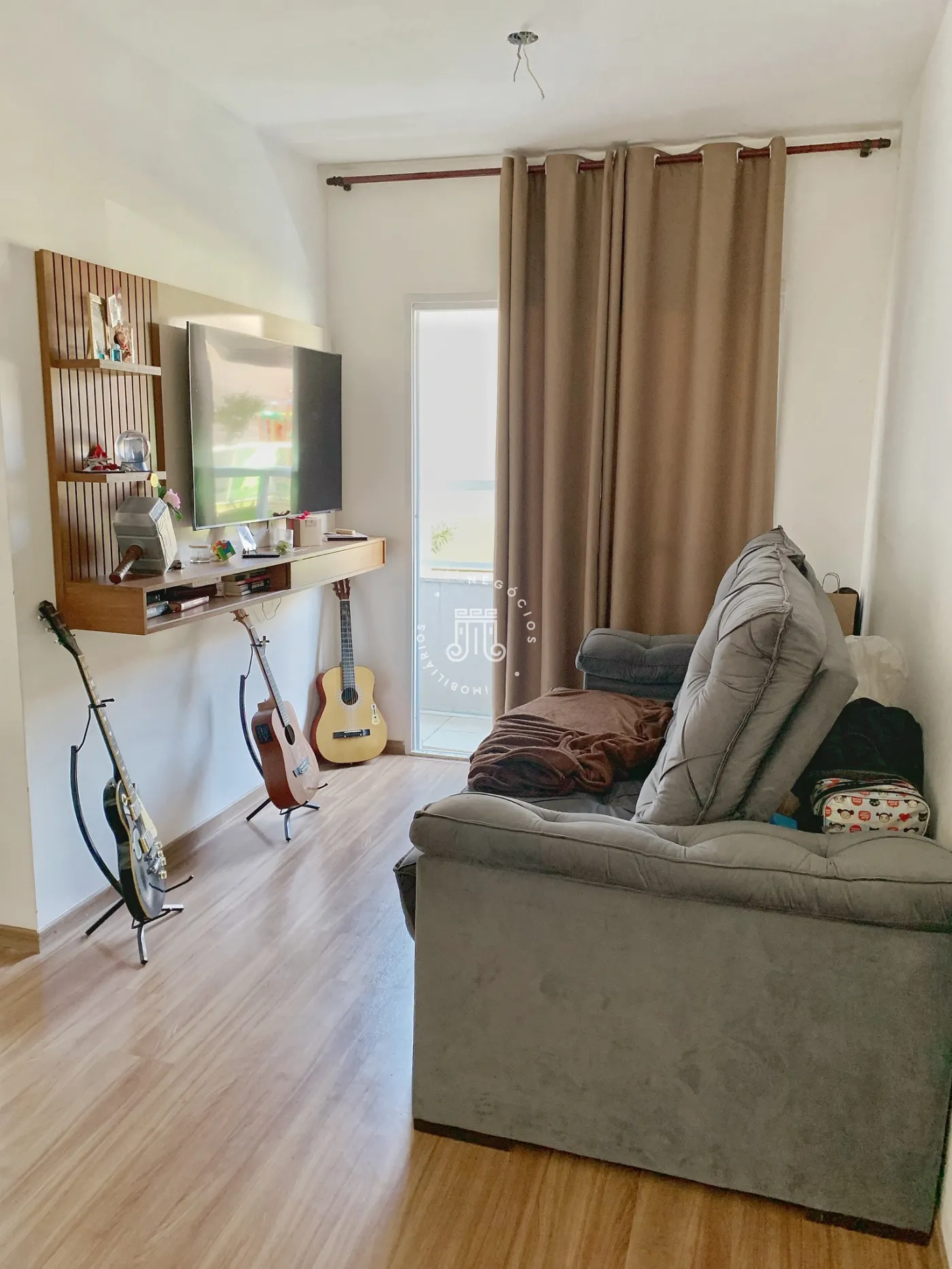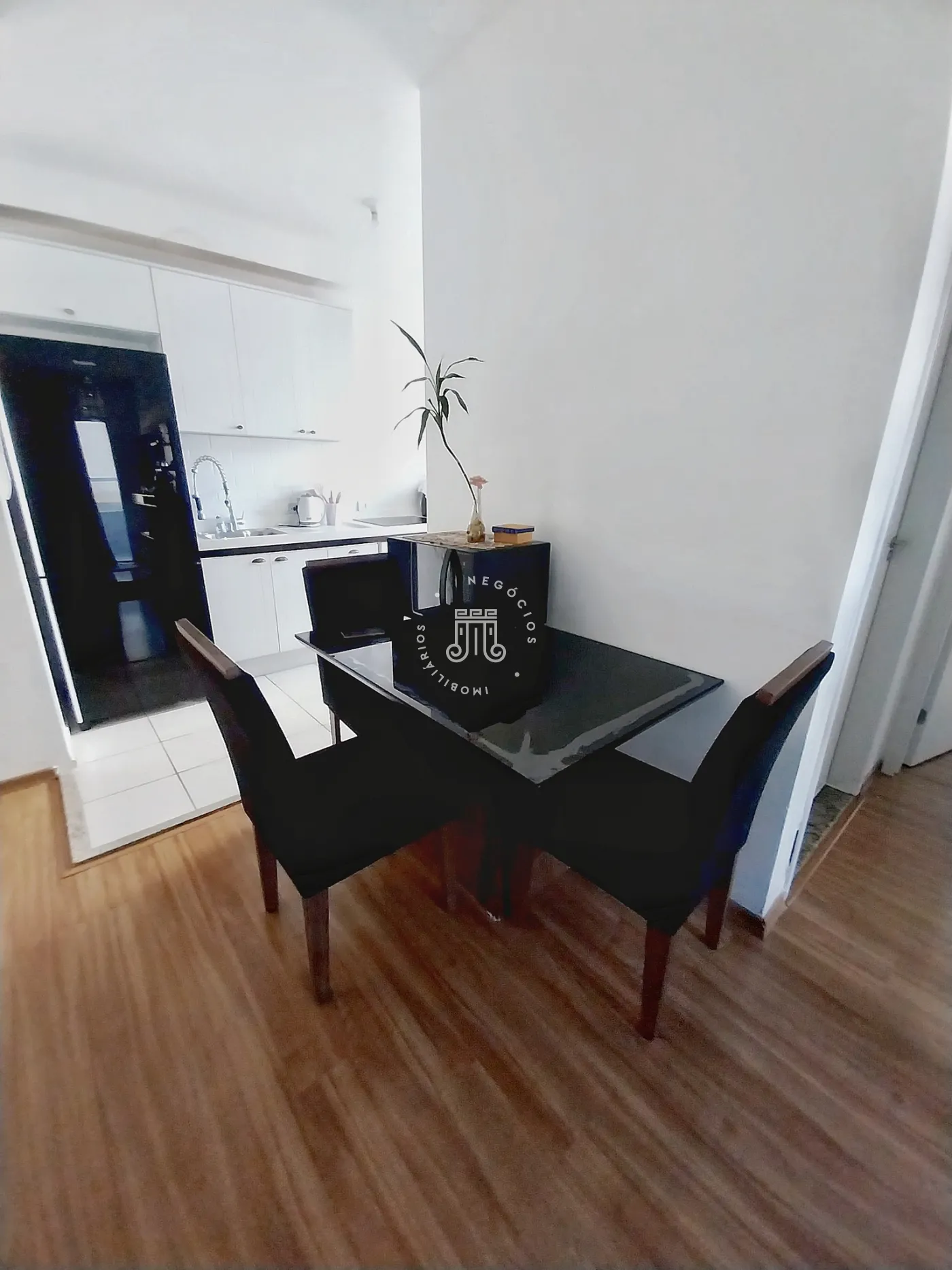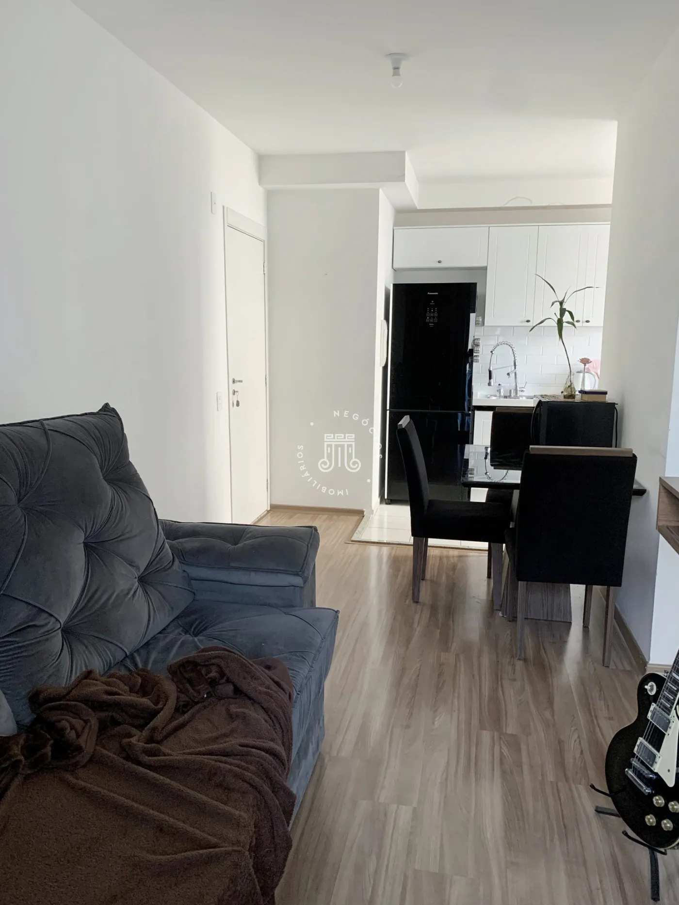 O imóvel possui dois dormitórios, sala de estar com varanda, cozinha com armários planejados, área de serviço integrada à cozinha e uma vaga de garagem.