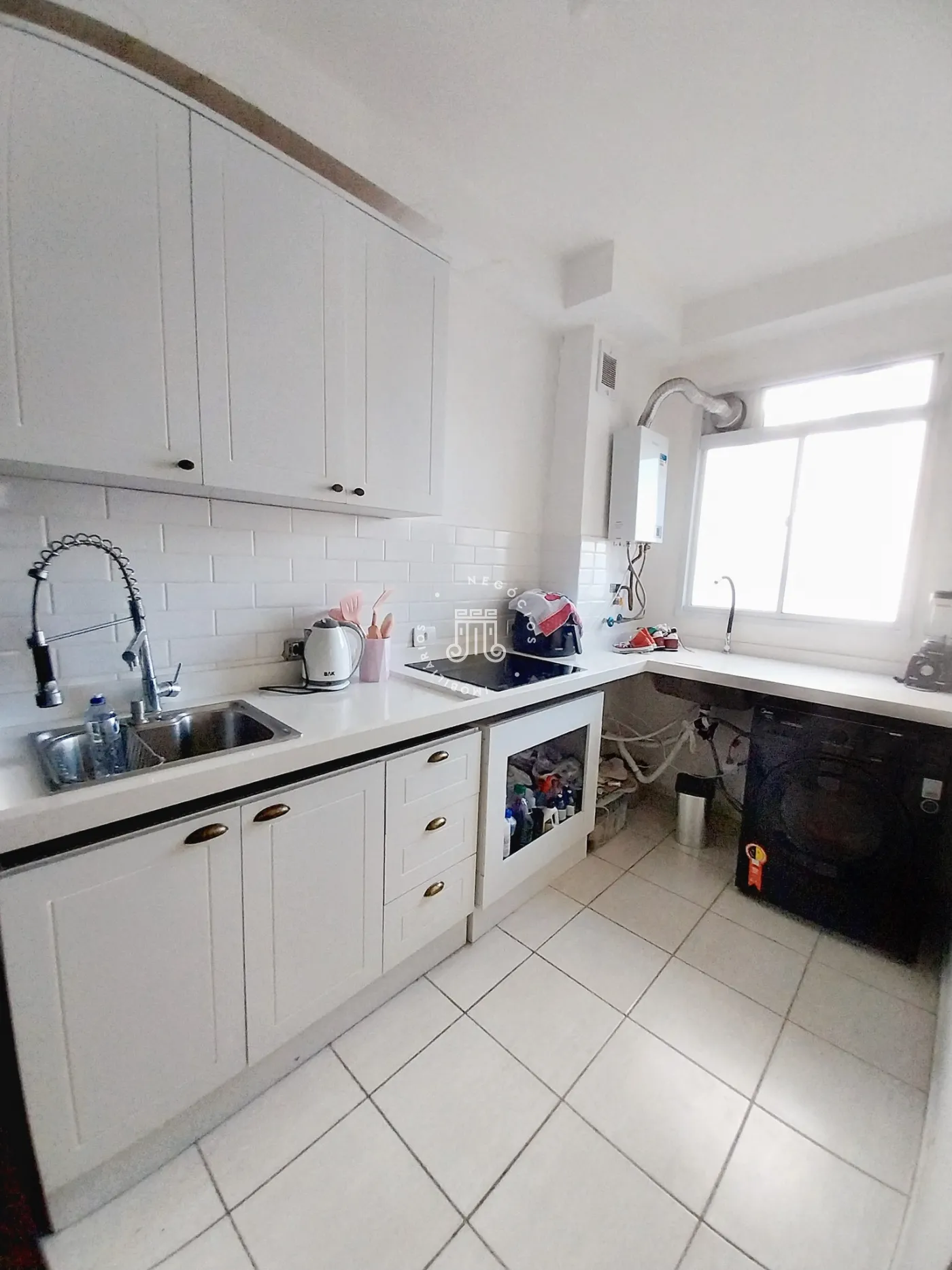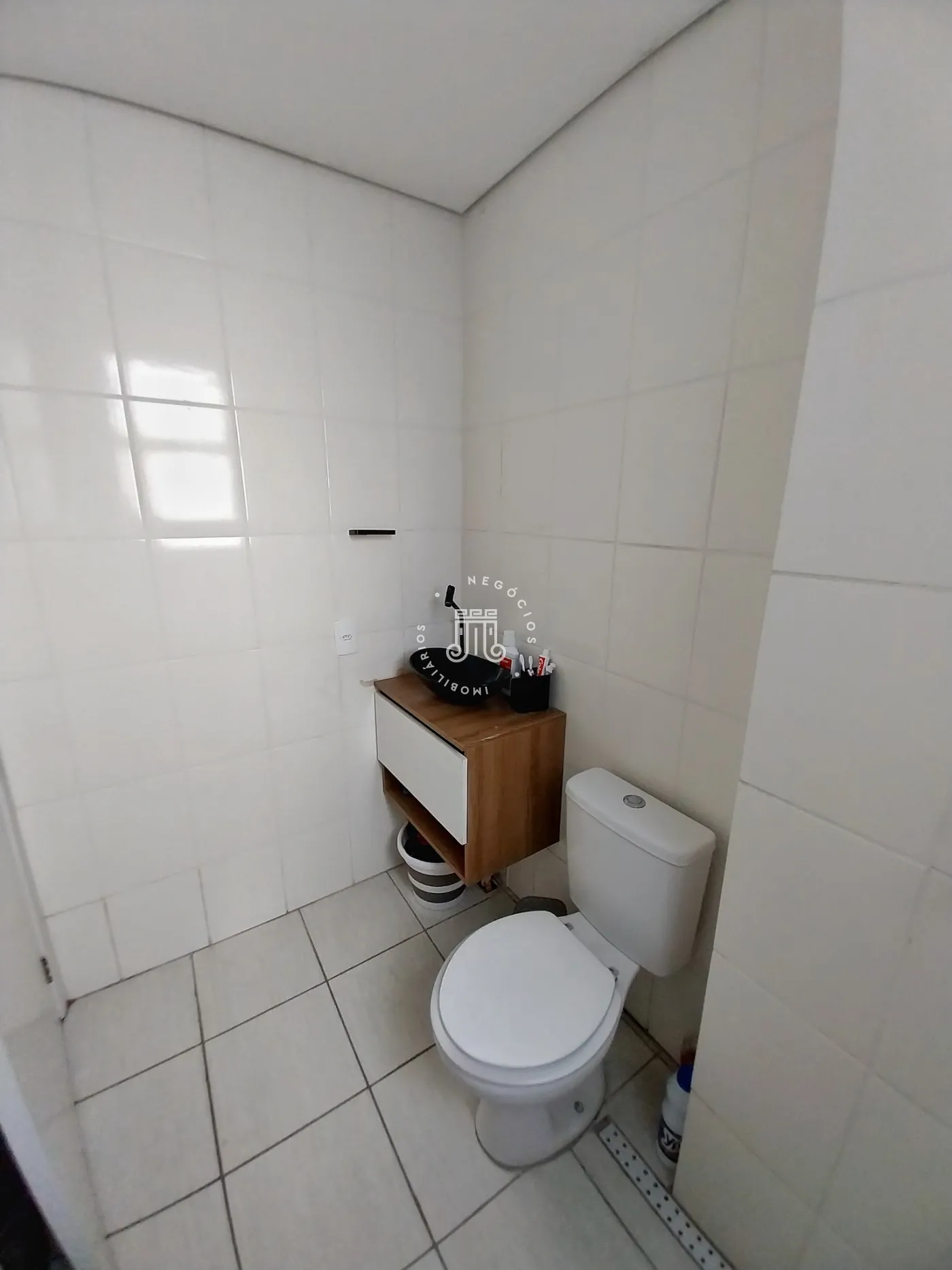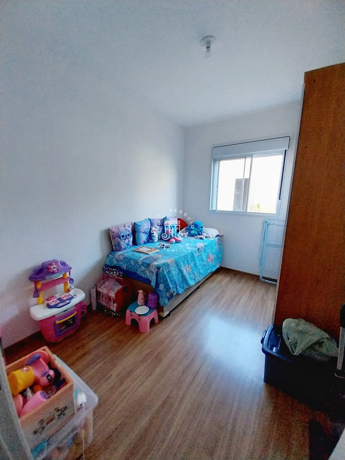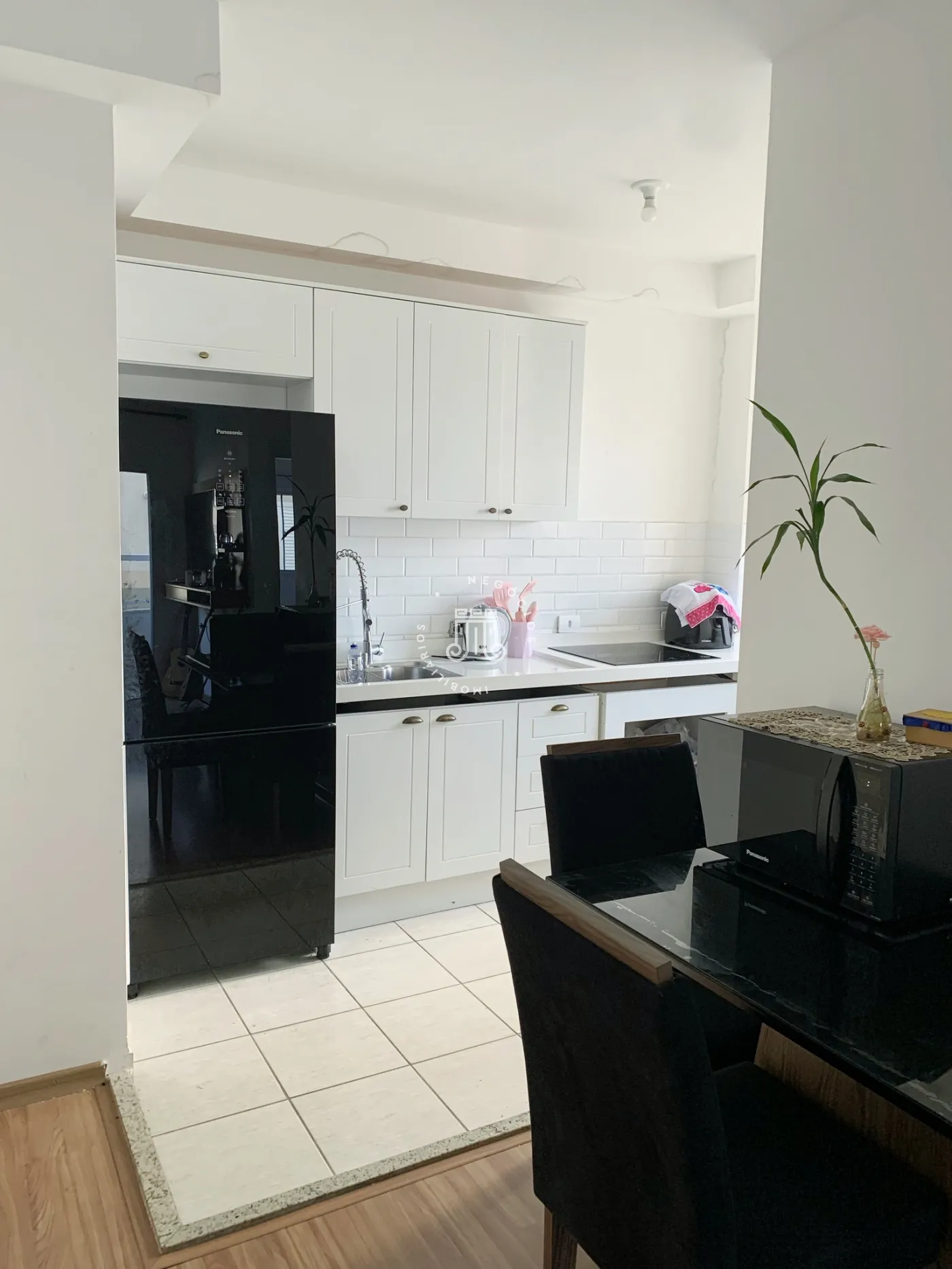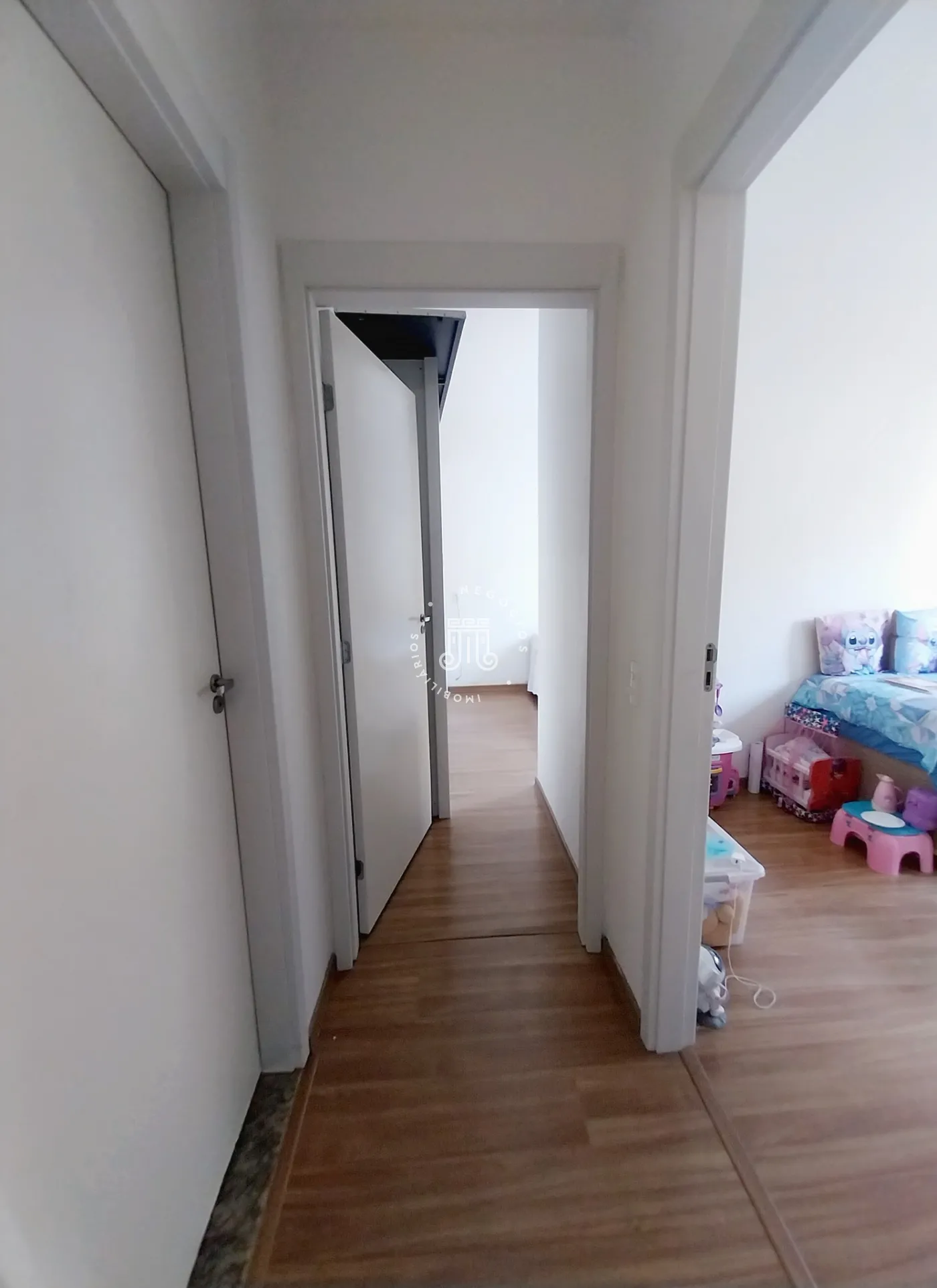 O imóvel possui dois dormitórios, sala de estar com varanda, cozinha com armários planejados, área de serviço integrada à cozinha e uma vaga de garagem.