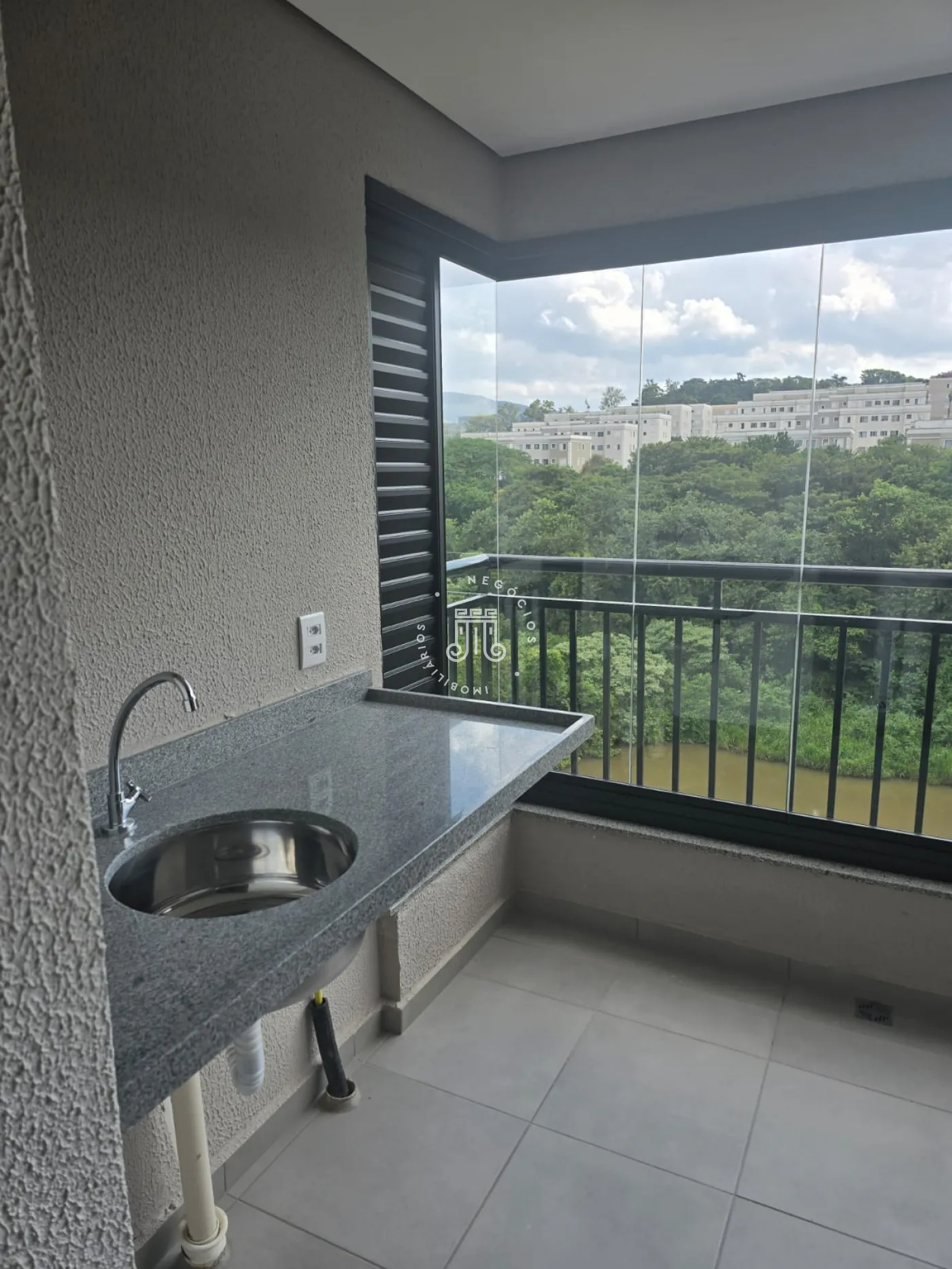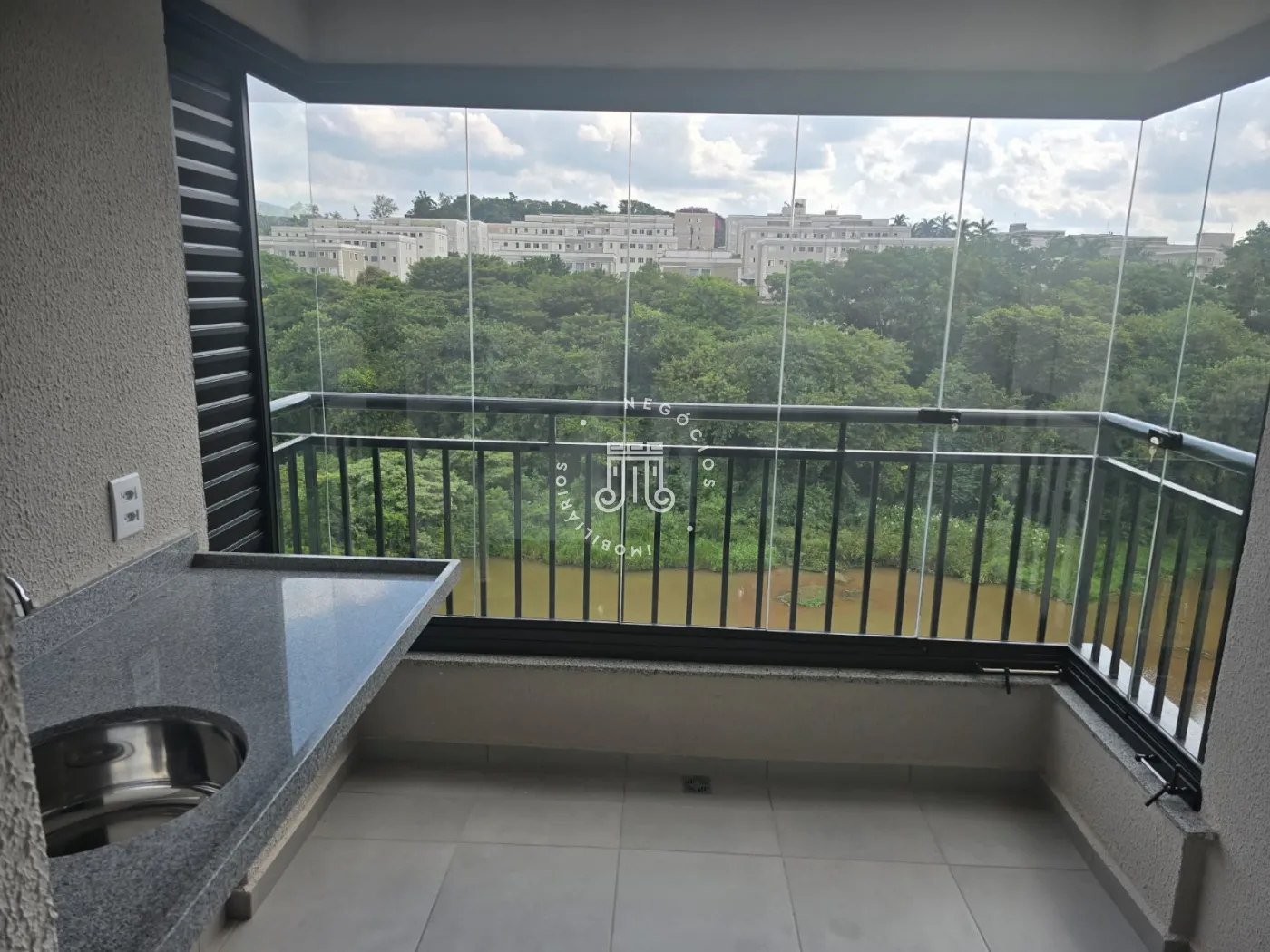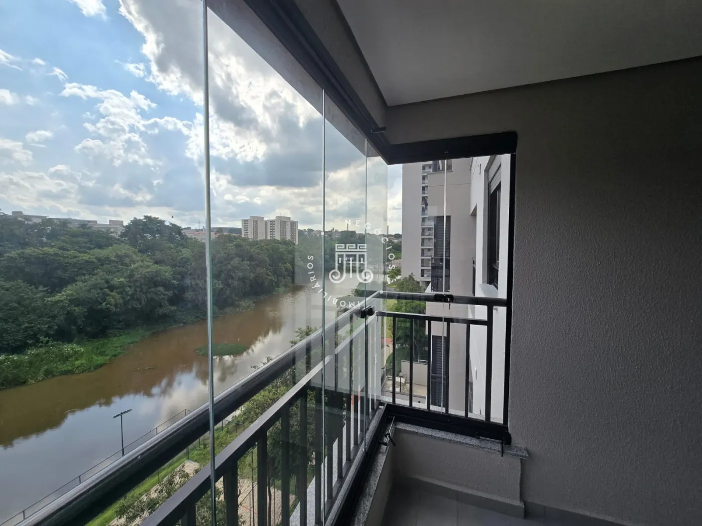 Apartamento no Residencial Belacqua com 68 M². O imóvel possui dois dormitórios, sendo uma suíte, e varanda gourmet com vista para o lago e sol da tarde. Os banheiros já têm box e a sacada é envidraçada.