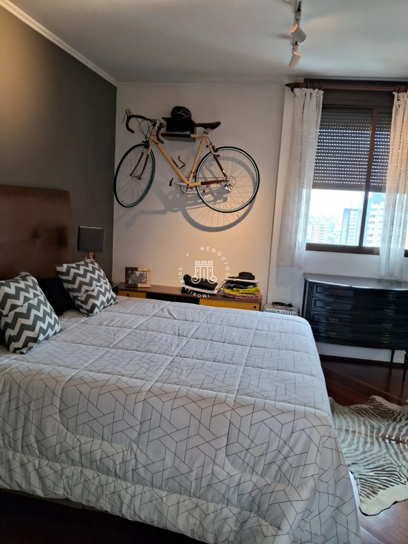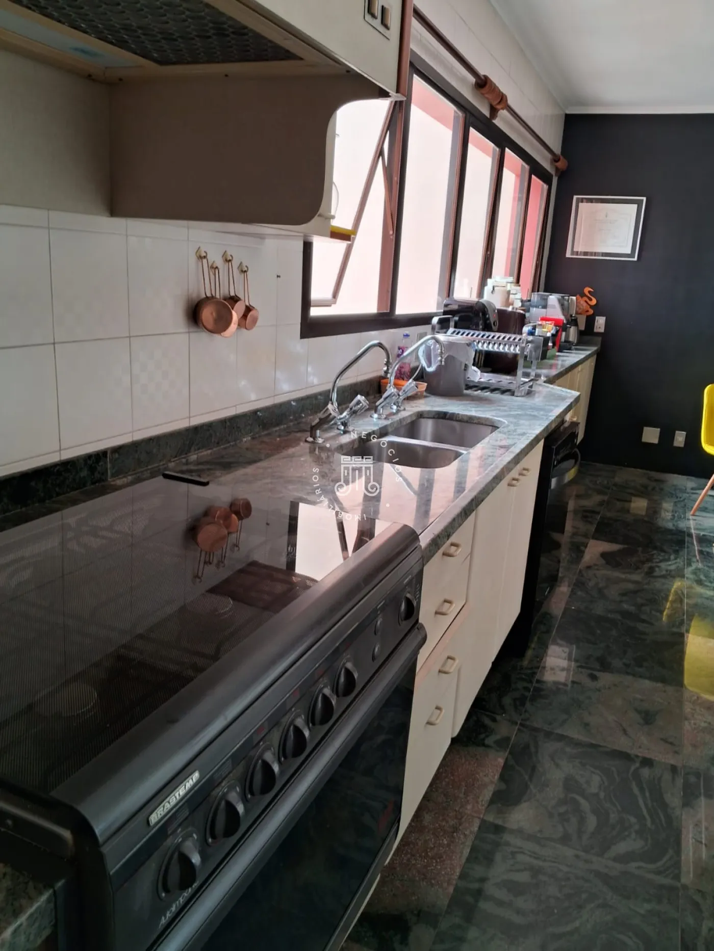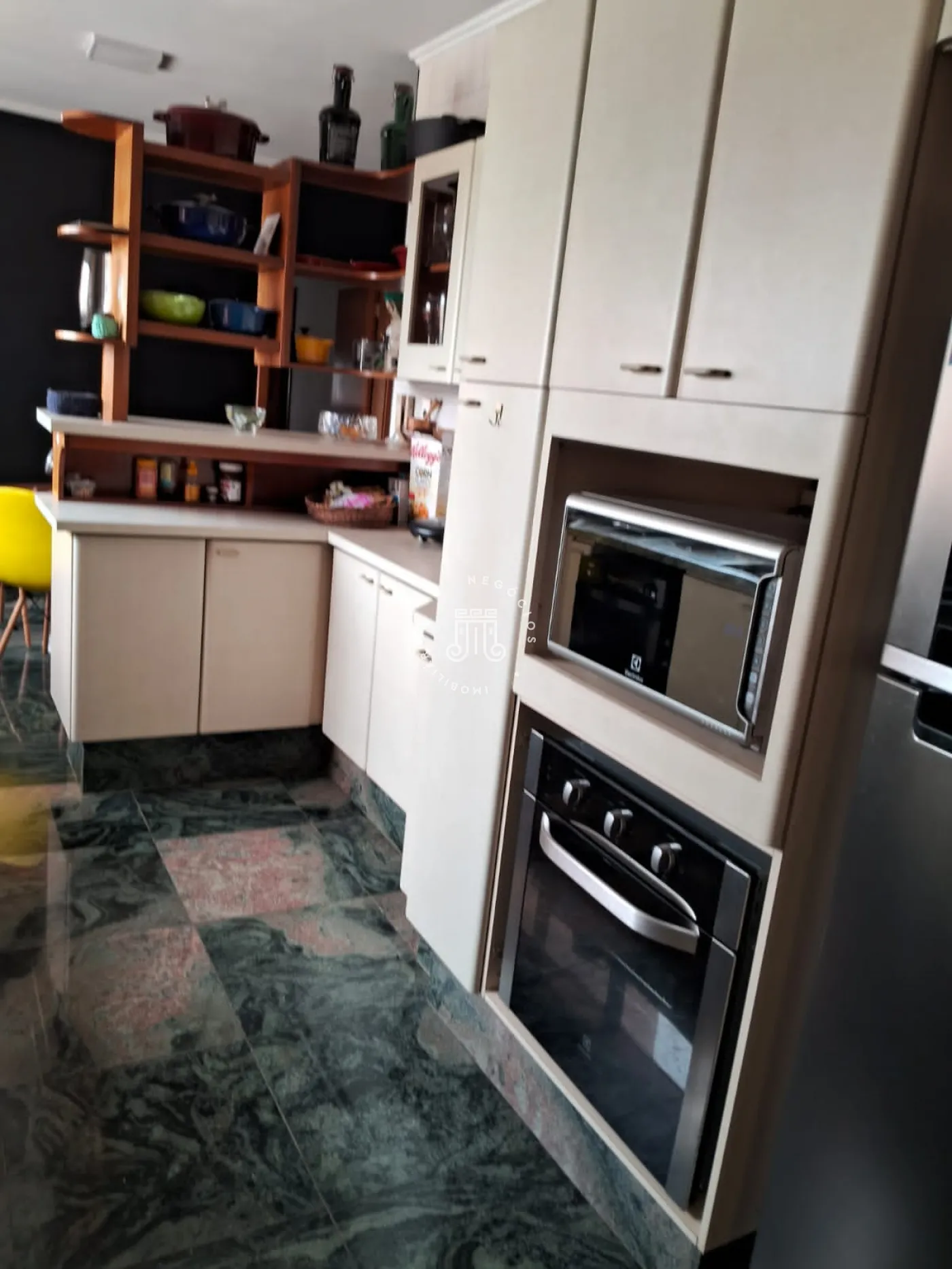 O apartamento possui três quartos com armários, sendo uma suíte com closet e banheira, além de banheiro social. A sala é distribuída em três ambientes, com piso de assoalho e sacada. O imóvel conta ainda com lavabo, escritório, copa, cozinha planejada, área de serviço, despensa e banheiro de serviço. São três vagas de garagem no subsolo. O prédio dispõe de gerador de energia e piscina. O condomínio está localizado em área com acesso a serviços, comércios e opções de transporte.