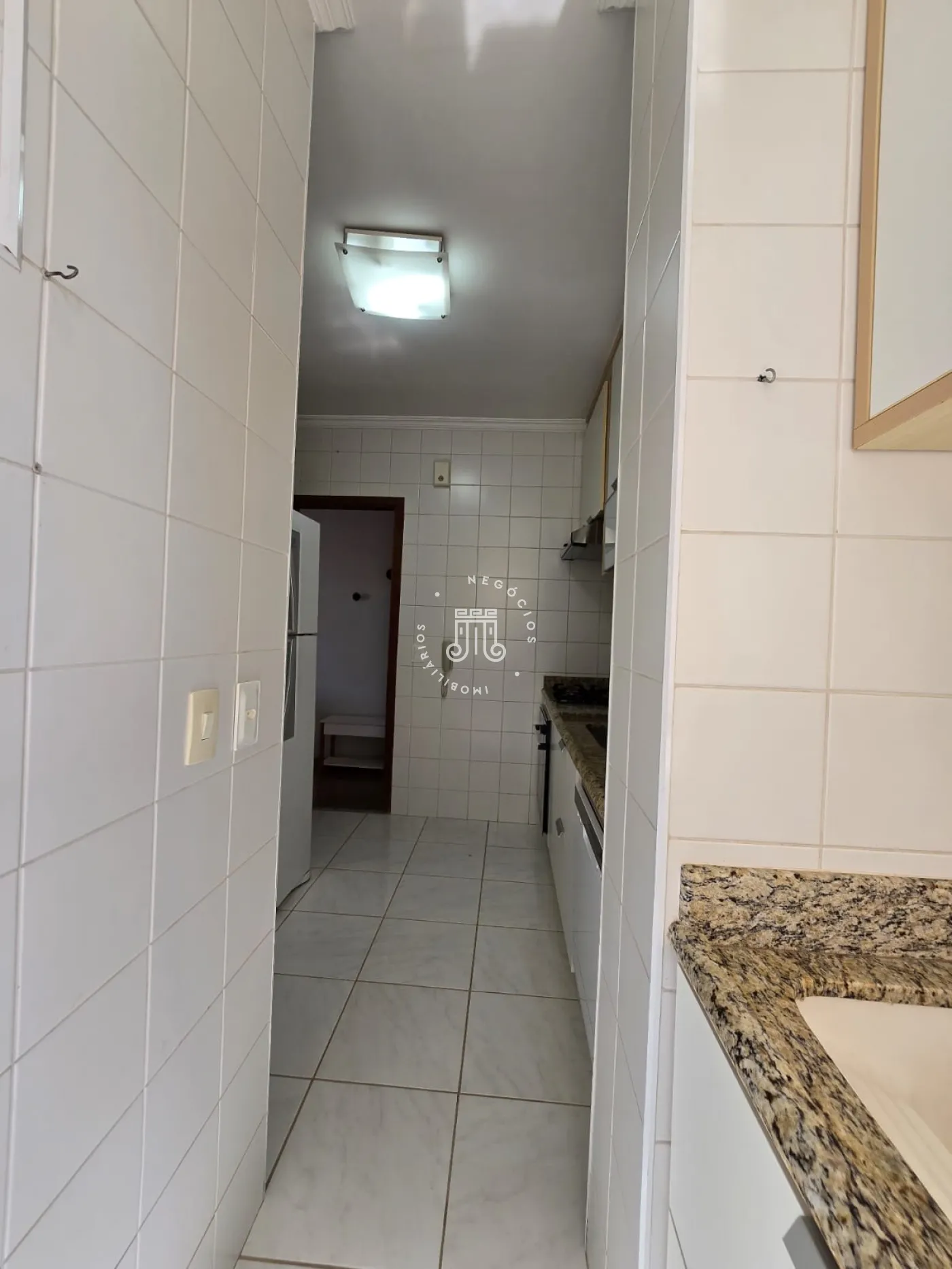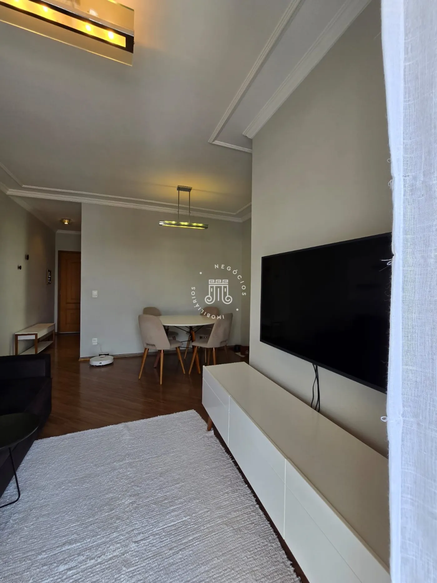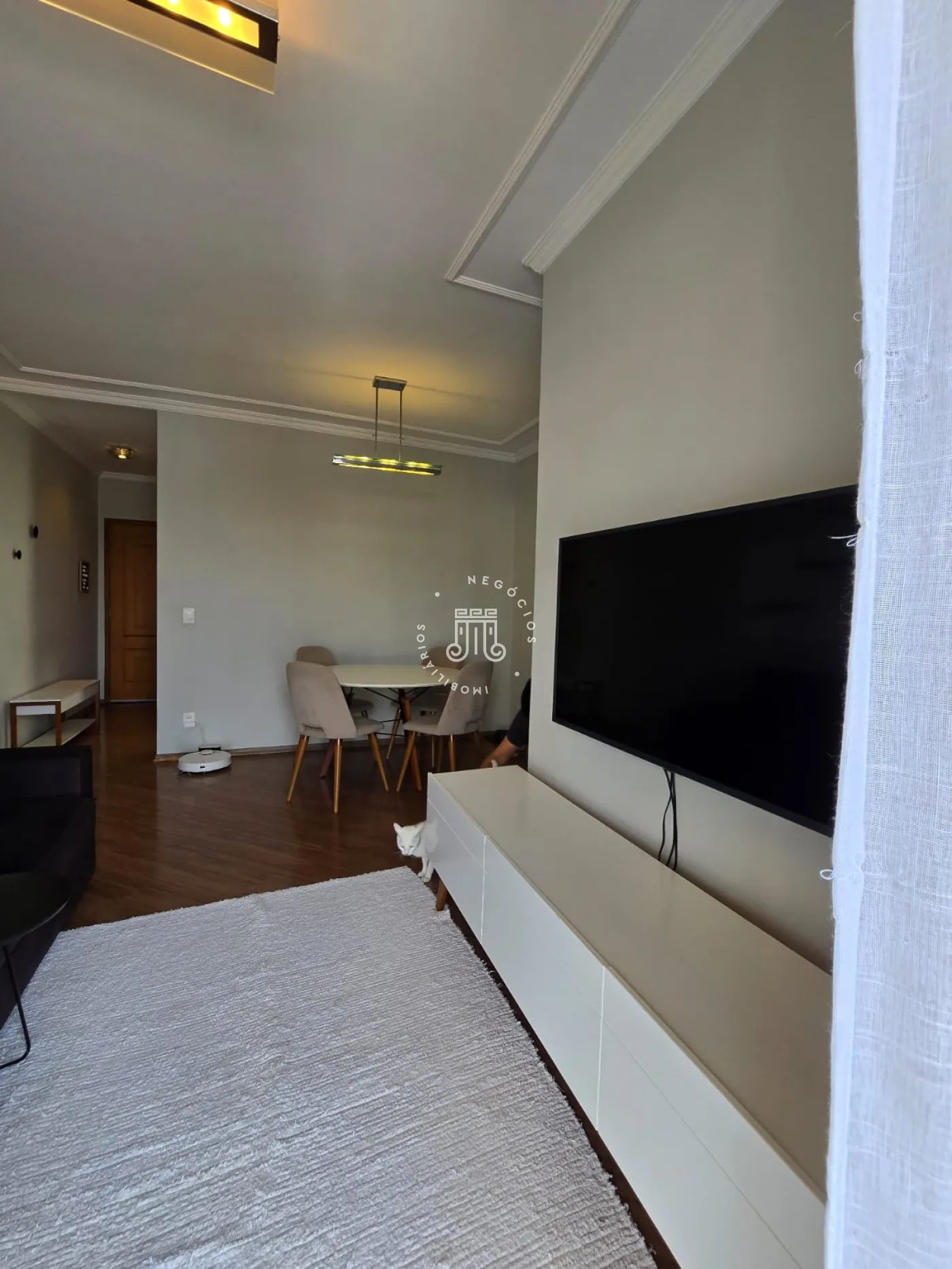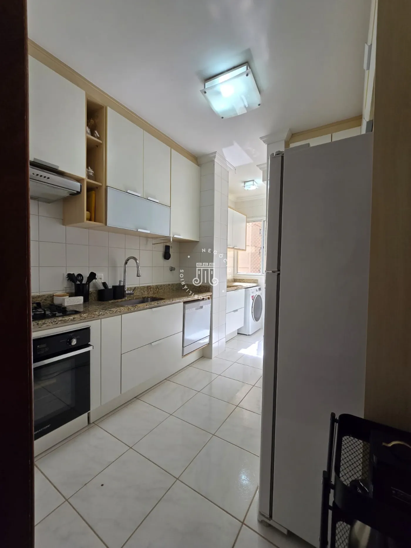 O imóvel tem 74 metros quadrados. Ele contém três dormitórios, sendo um deles uma suíte com planejados, um banheiro social, cozinha com armários, lavanderia, varanda, sala para dois ambientes e uma vaga de garagem coberta.
