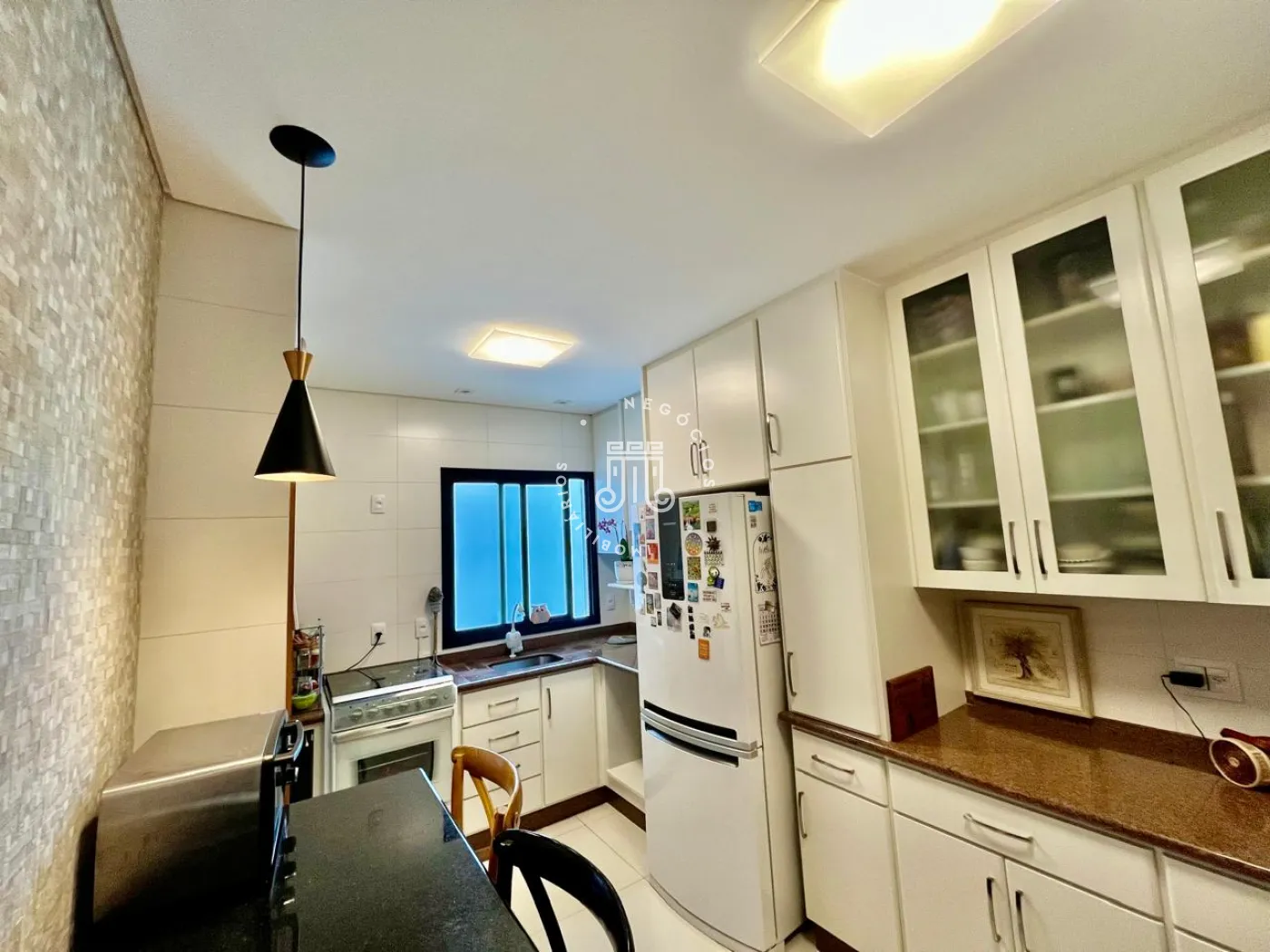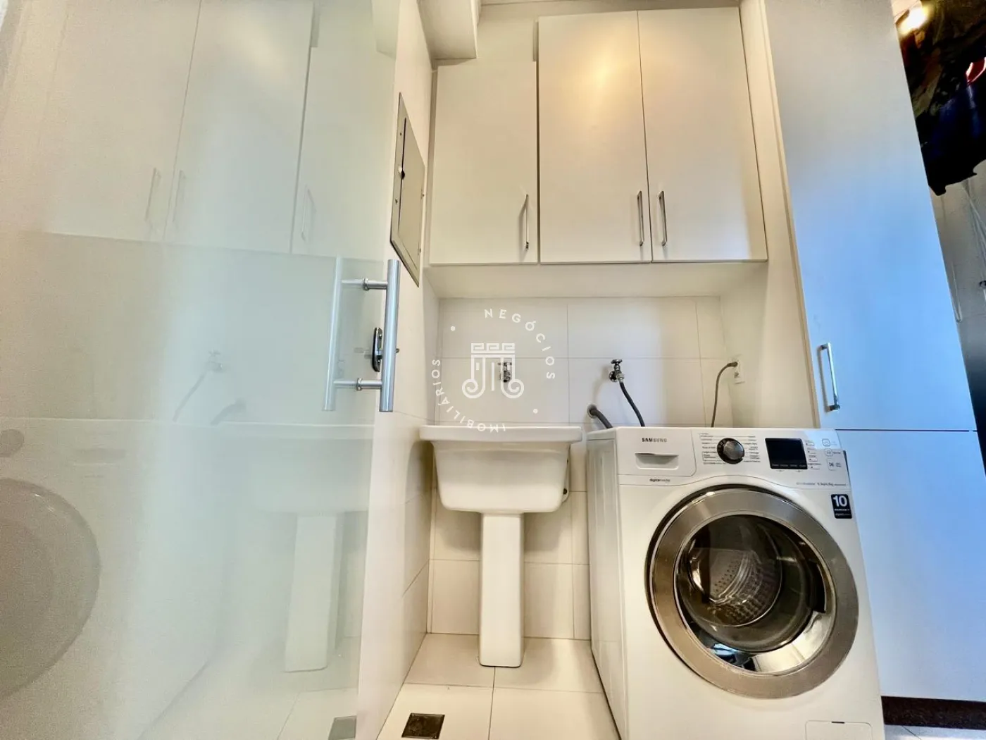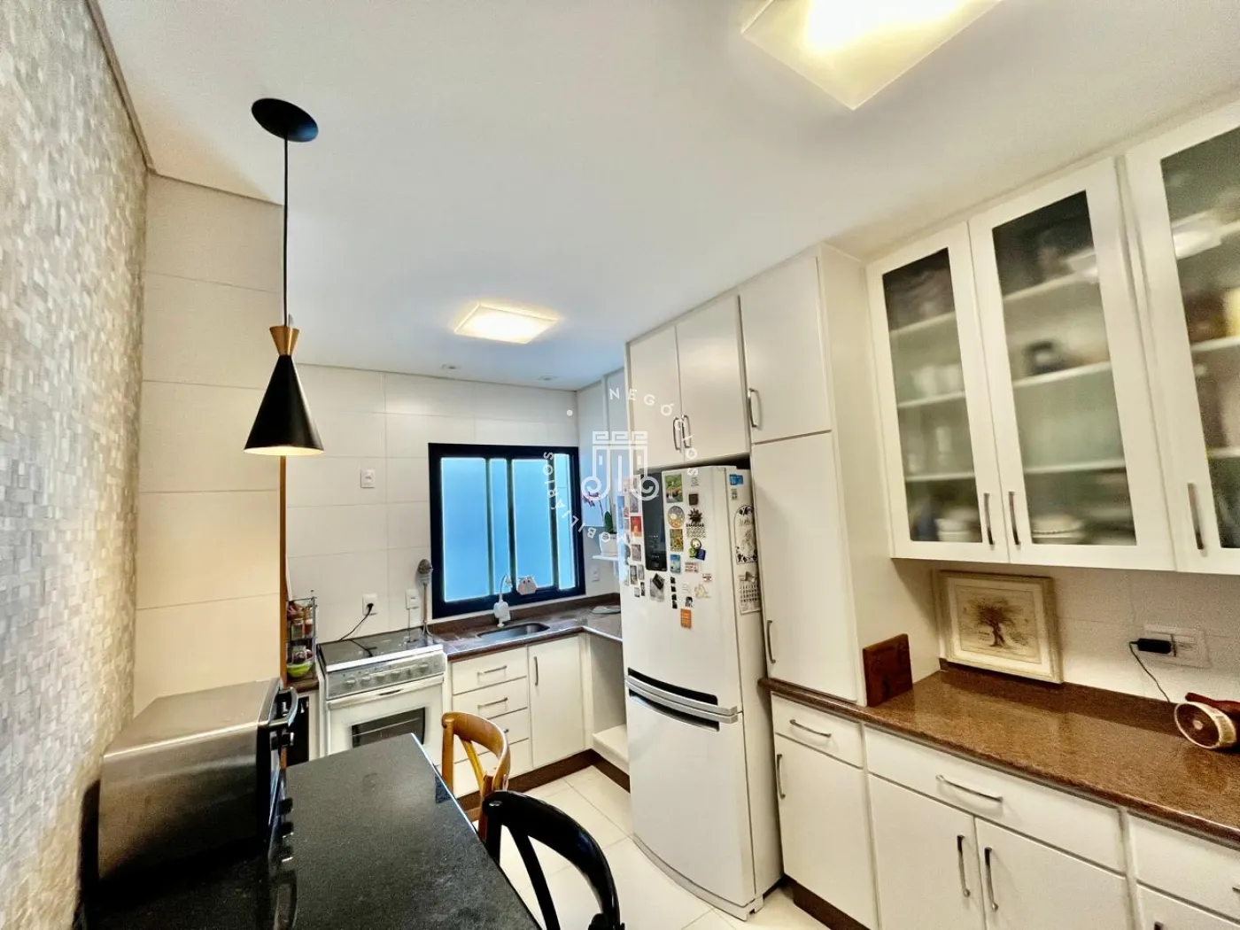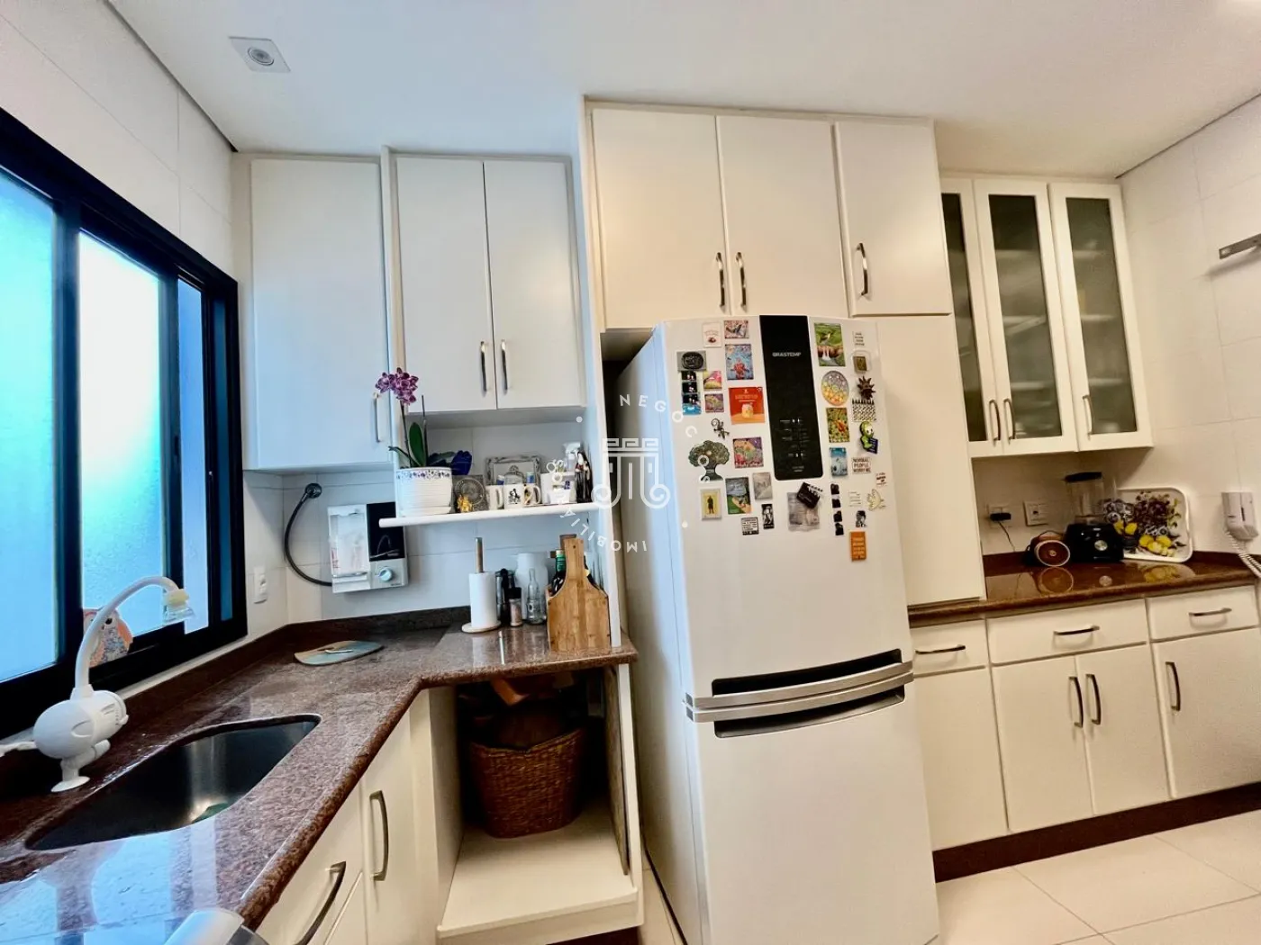 A cozinha possui armários planejados, e a área de serviço comporta equipamentos adicionais, como freezer. Os banheiros e a cozinha têm revestimento em porcelanato, e o sistema de aquecimento a gás atende chuveiros e torneiras. As instalações elétrica e hidráulica passaram por revisão.