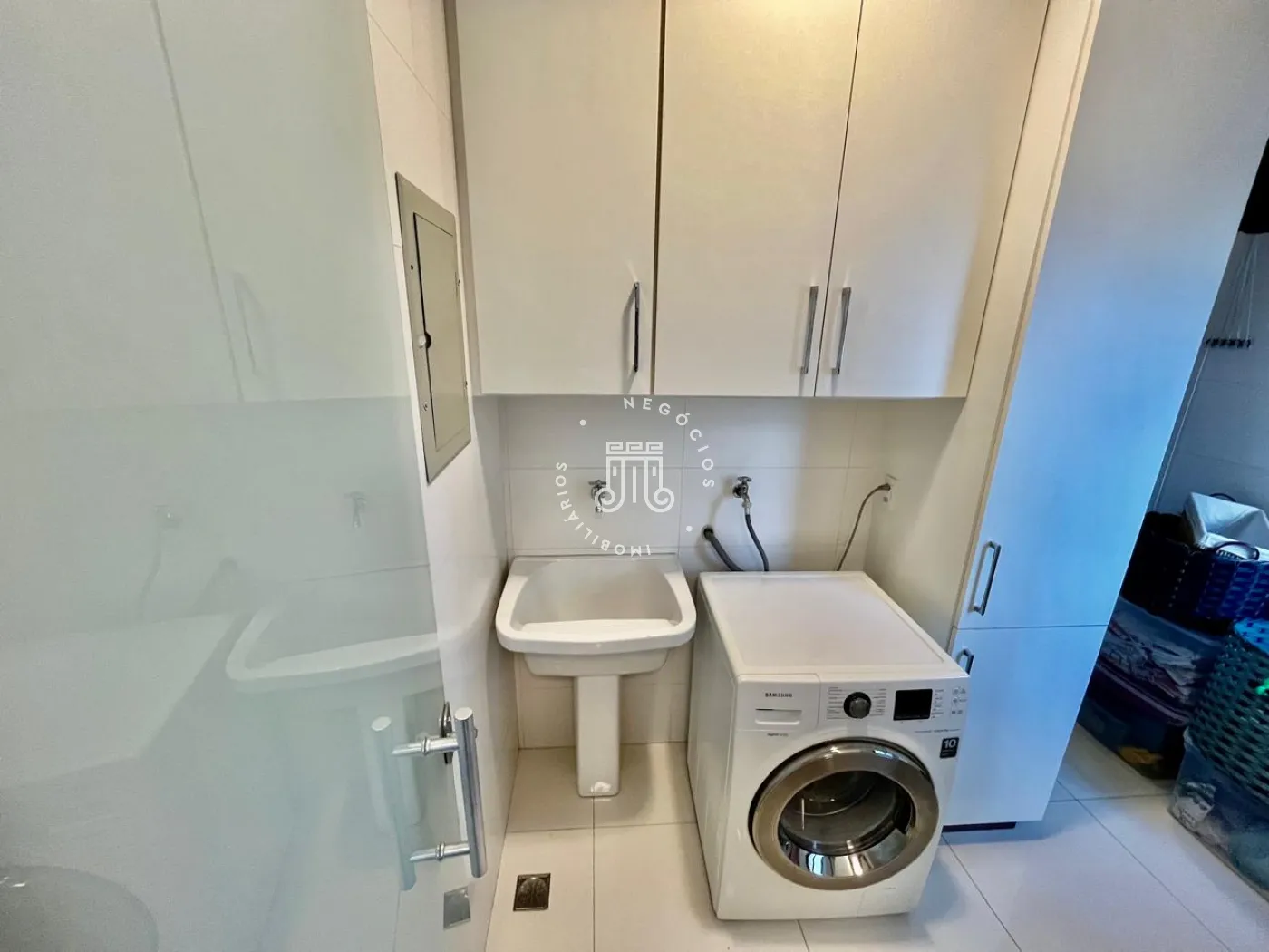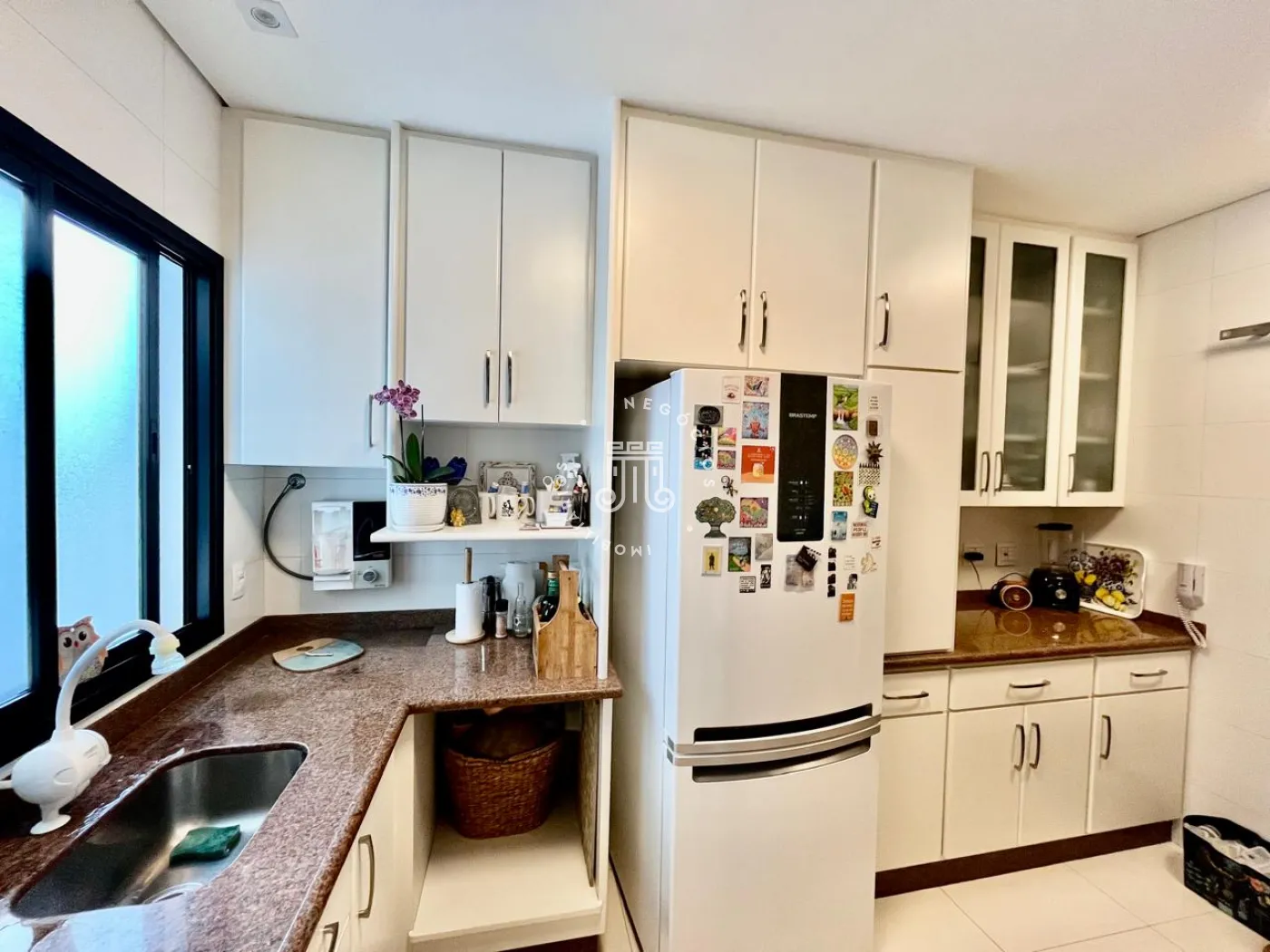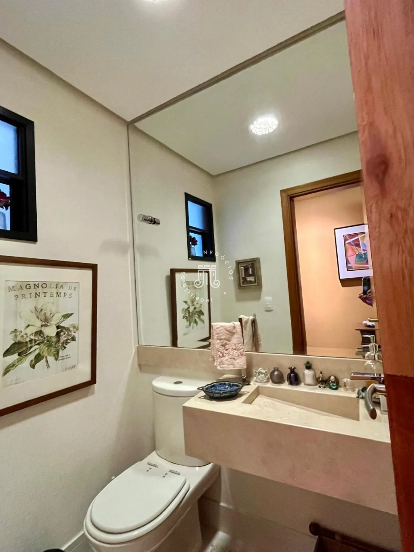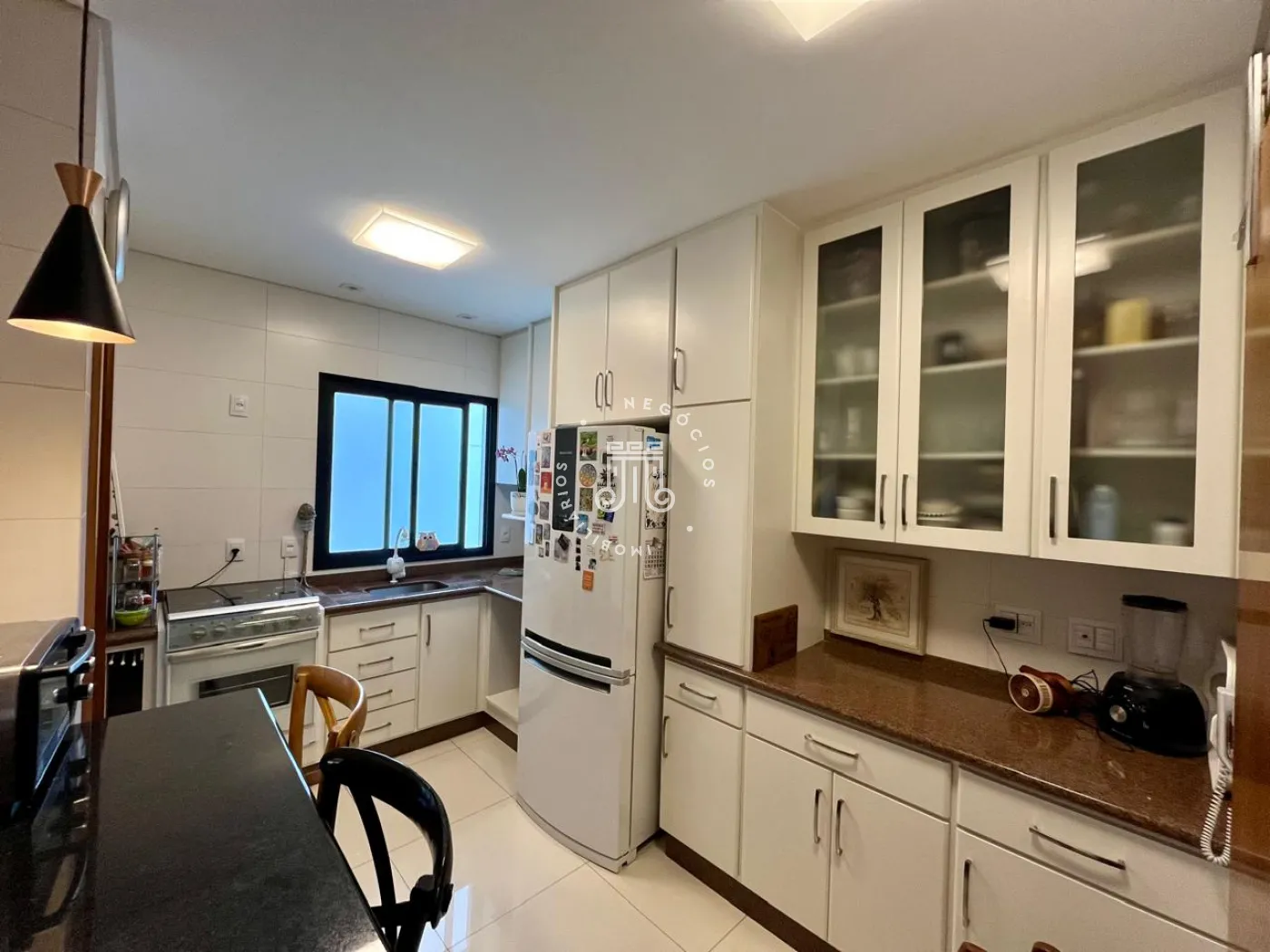 A cozinha possui armários planejados, e a área de serviço comporta equipamentos adicionais, como freezer. Os banheiros e a cozinha têm revestimento em porcelanato, e o sistema de aquecimento a gás atende chuveiros e torneiras. As instalações elétrica e hidráulica passaram por revisão.