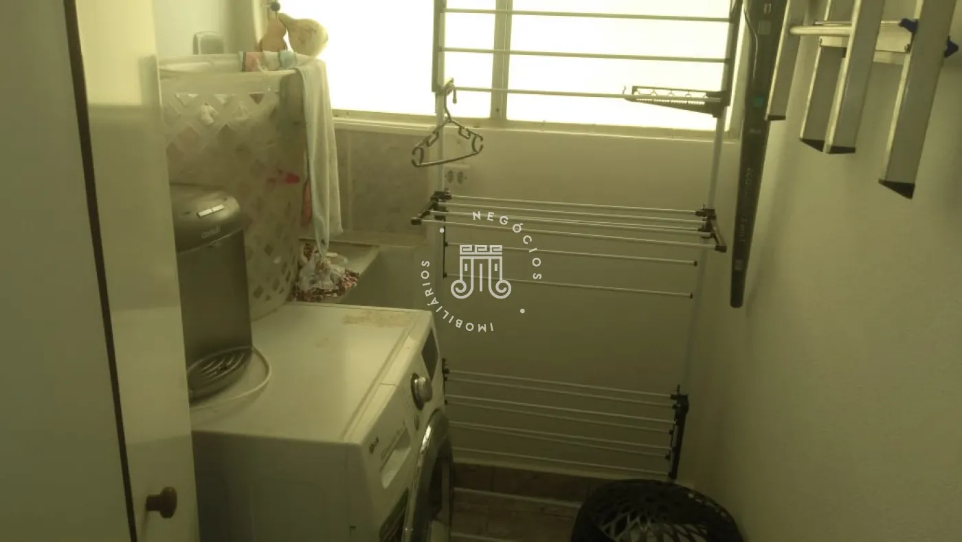 Área de serviço com armários, uma vaga de garagem coberta.