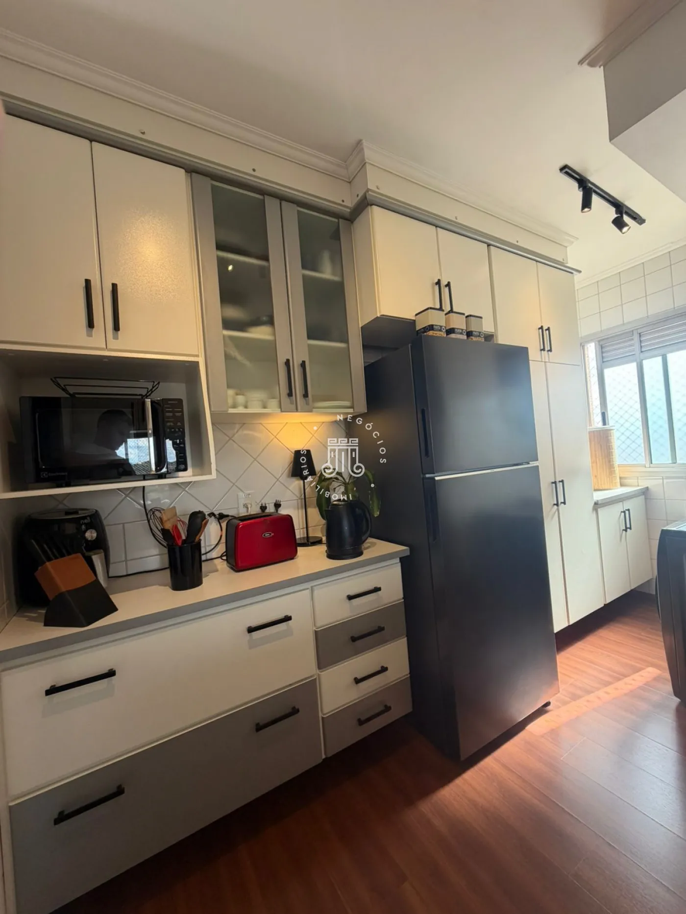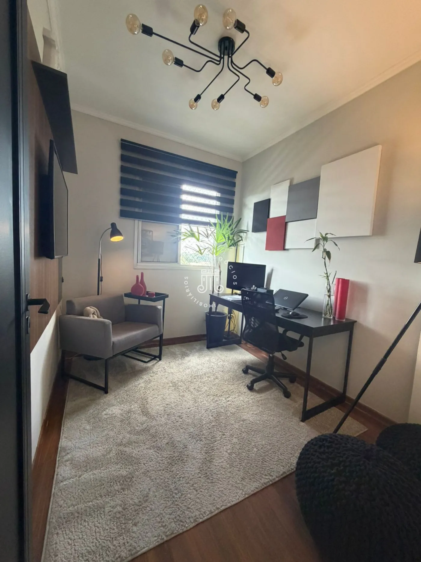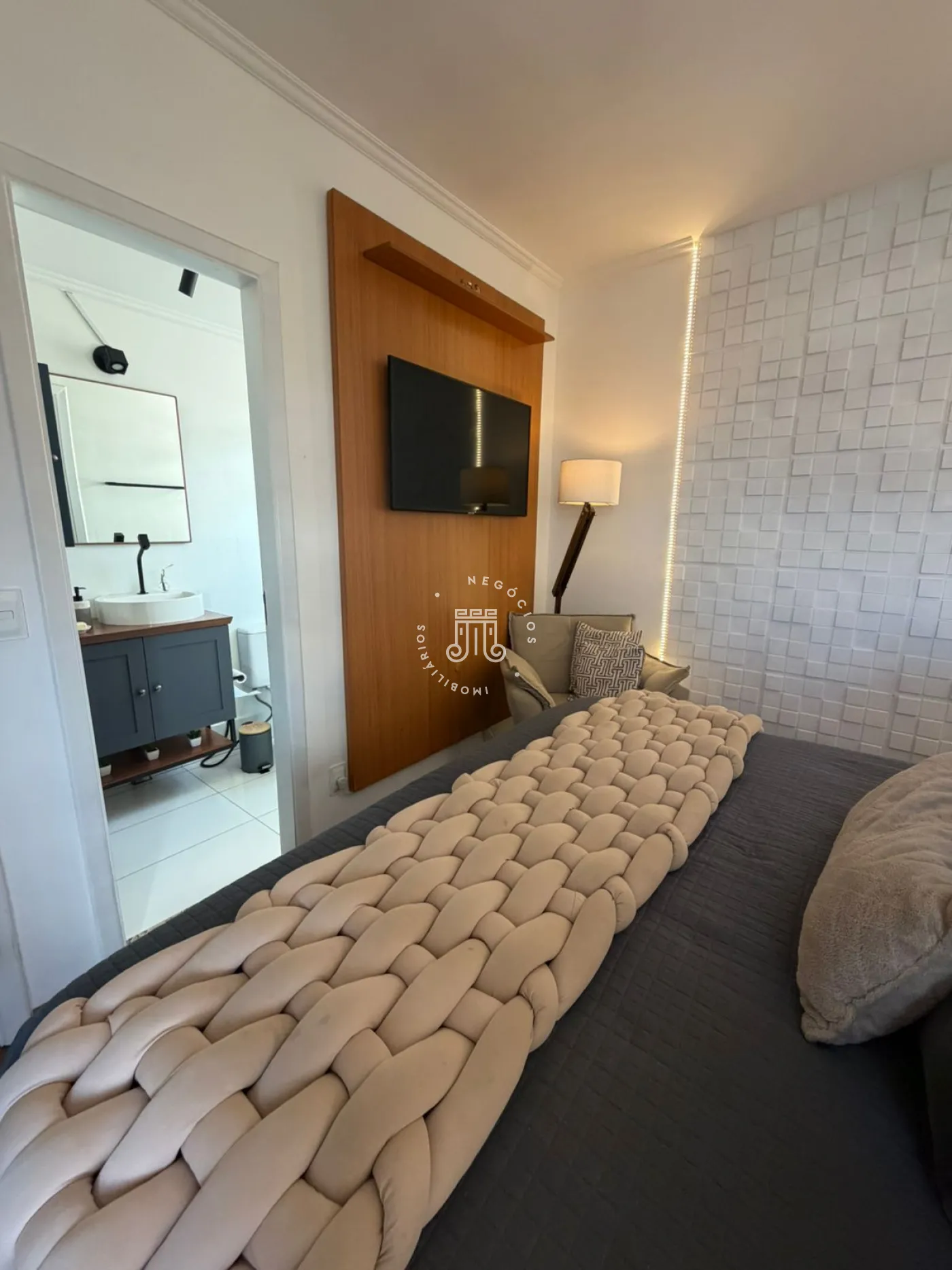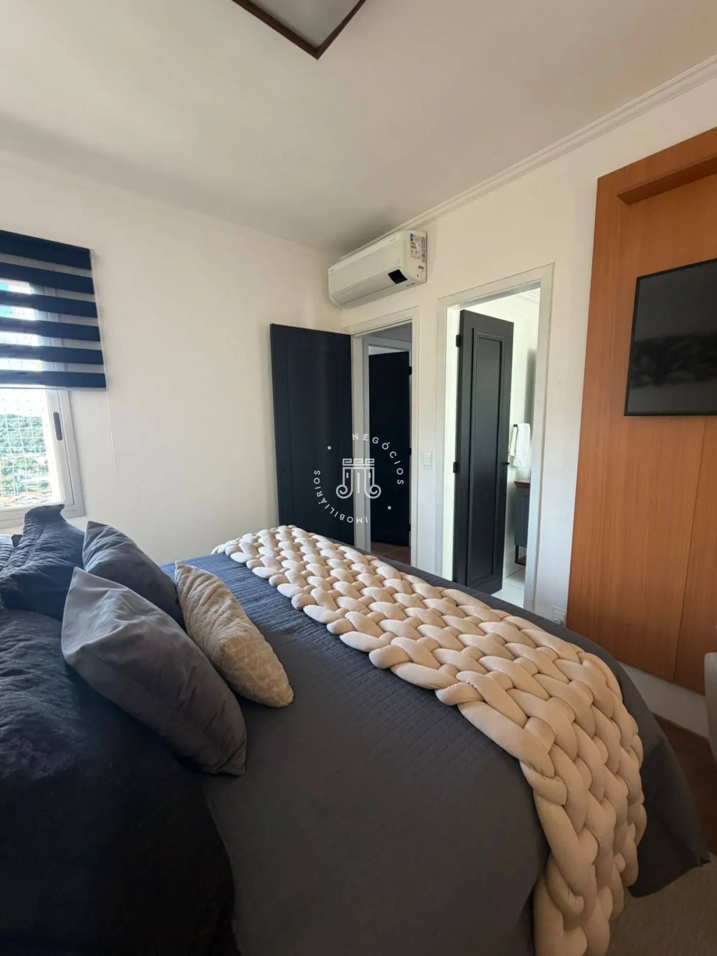 O imóvel possui 3 quartos, sendo 1 suíte, sala, cozinha integrada à área de serviço, 2 banheiros e closet. Conta com armários na cozinha, área de serviço, banheiros e closet, além de ar-condicionado na sala e na suíte. Possui 1 vaga de garagem coberta. Unidade em andar alto, com incidência de sol no período da manhã.