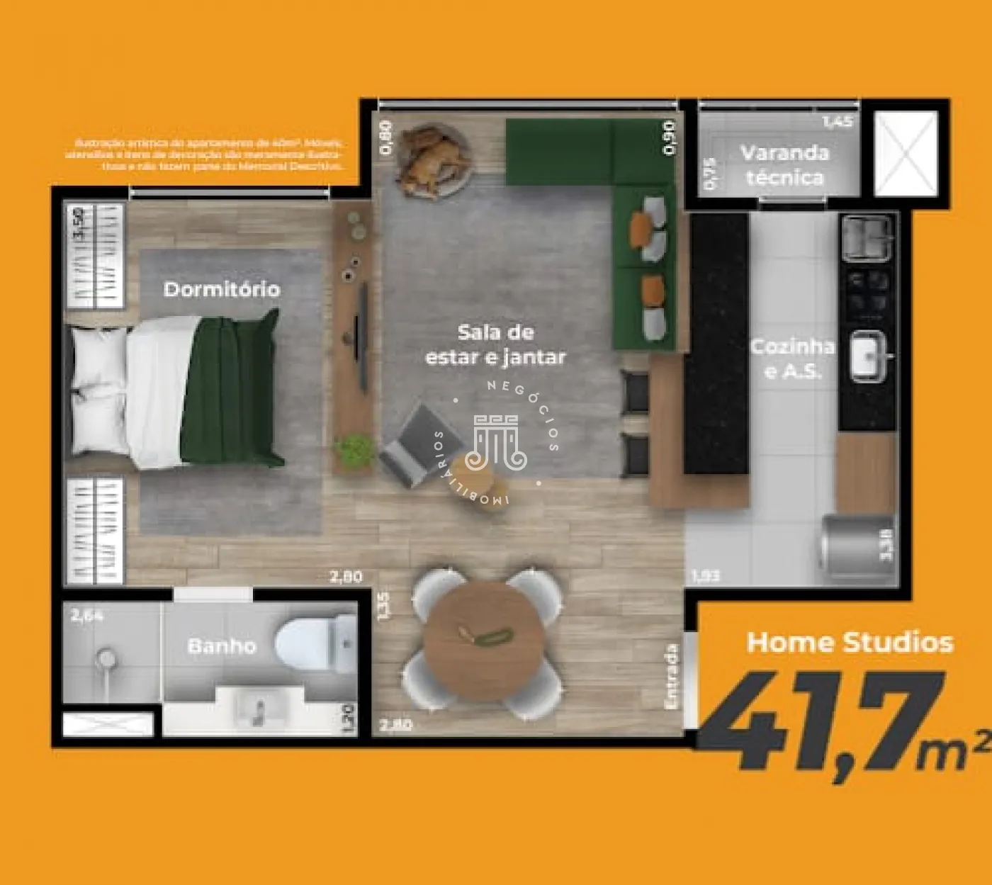Com 41,70m² de área útil, sendo 1,70m² de varanda técnica, com suíte, sala e cozinha. Previsto para ser entregue a partir de Agosto/2026, este apto oferece conforto e bem estar, com localização privilegiada, próximo à Av 9 de Julho. Banheiro com ventilação natural, sol da manhã, 1 vaga de garagem com depósito e preparação para ar condicionado.