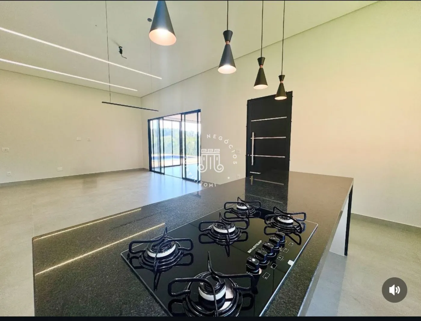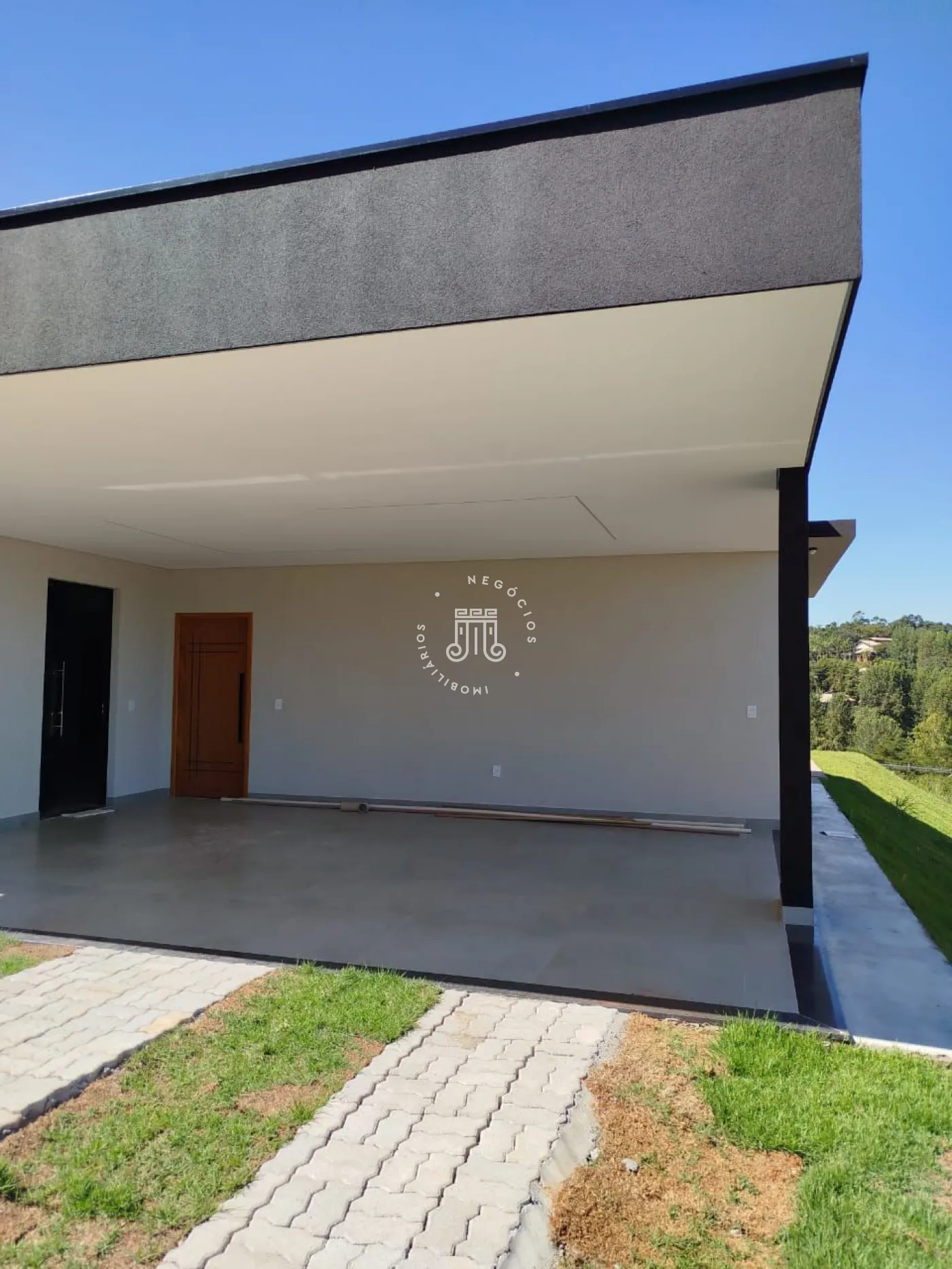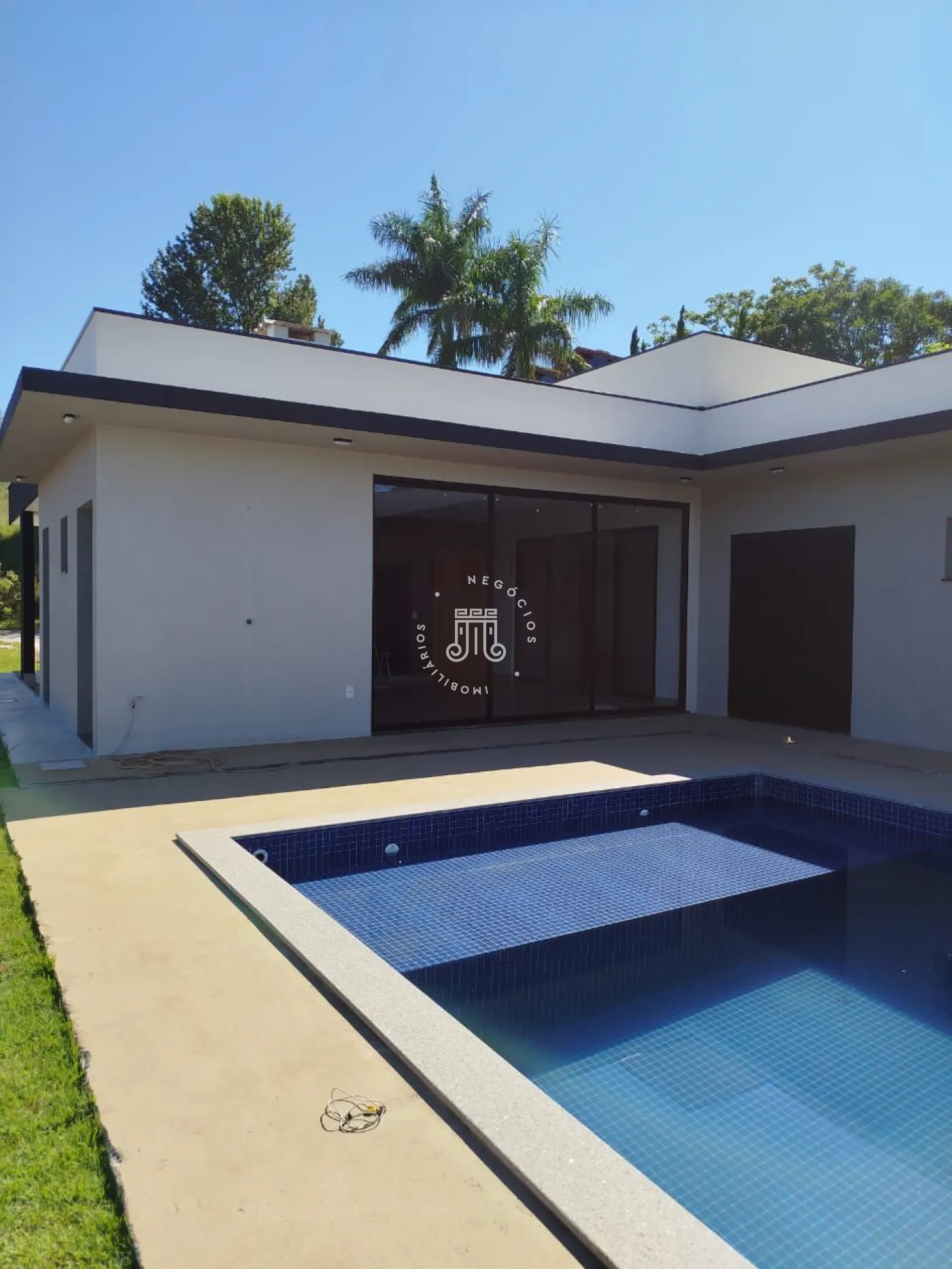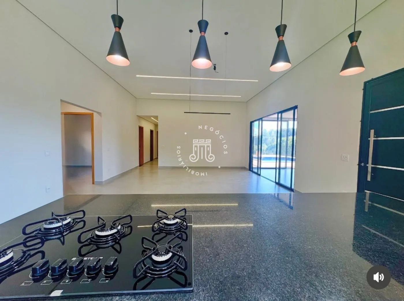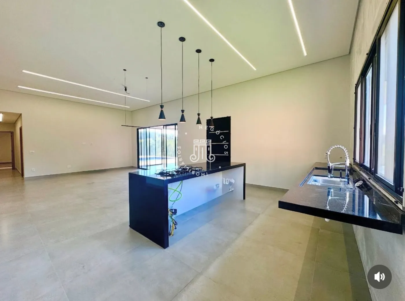 Casa à venda em condomínio, térrea, nunca habitada, com 298 m² de construção e terreno de 1140 m² plano, Composta por 3 quartos, sendo 2 Suítes, banheiro social, escritório privativo, ampla sala para 2 ambientes, lavabo, cozinha americana com ilha e cooktop, área de serviço, espaço gourmet, piscina e 8 vagas de garagem sendo 2 cobertas.