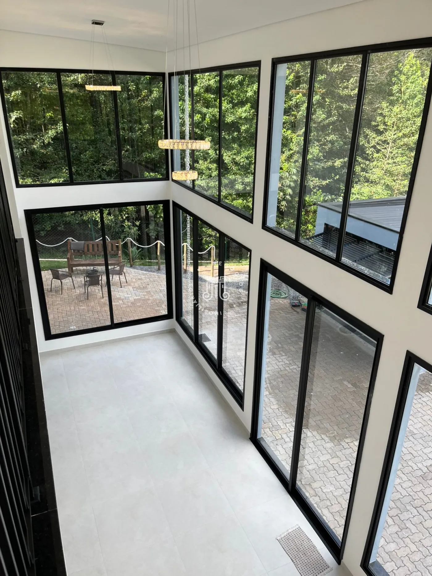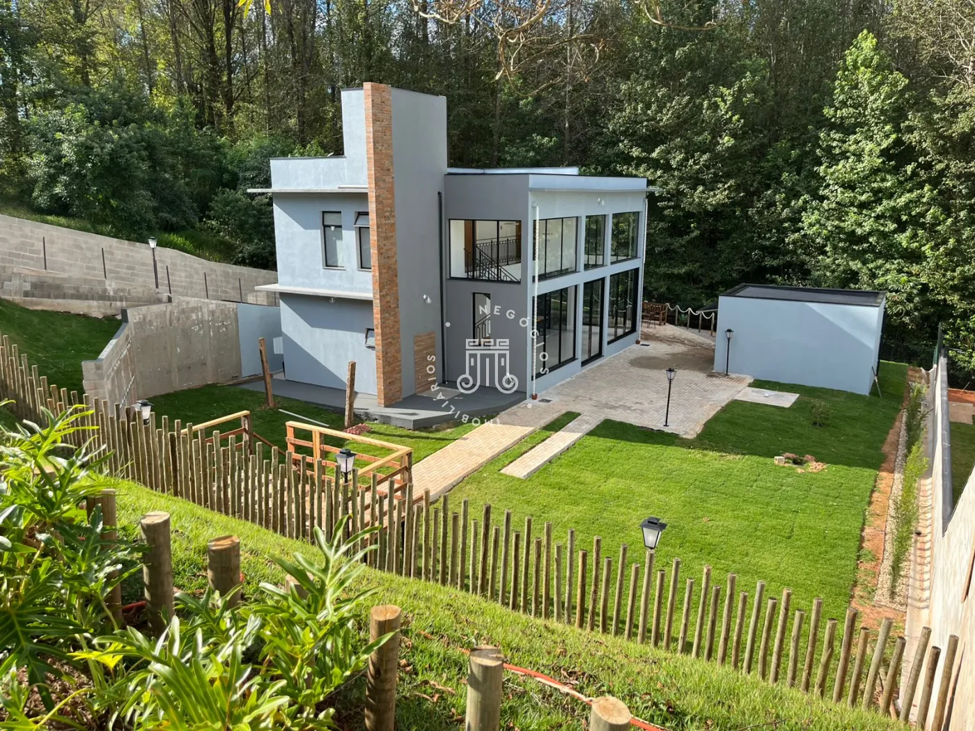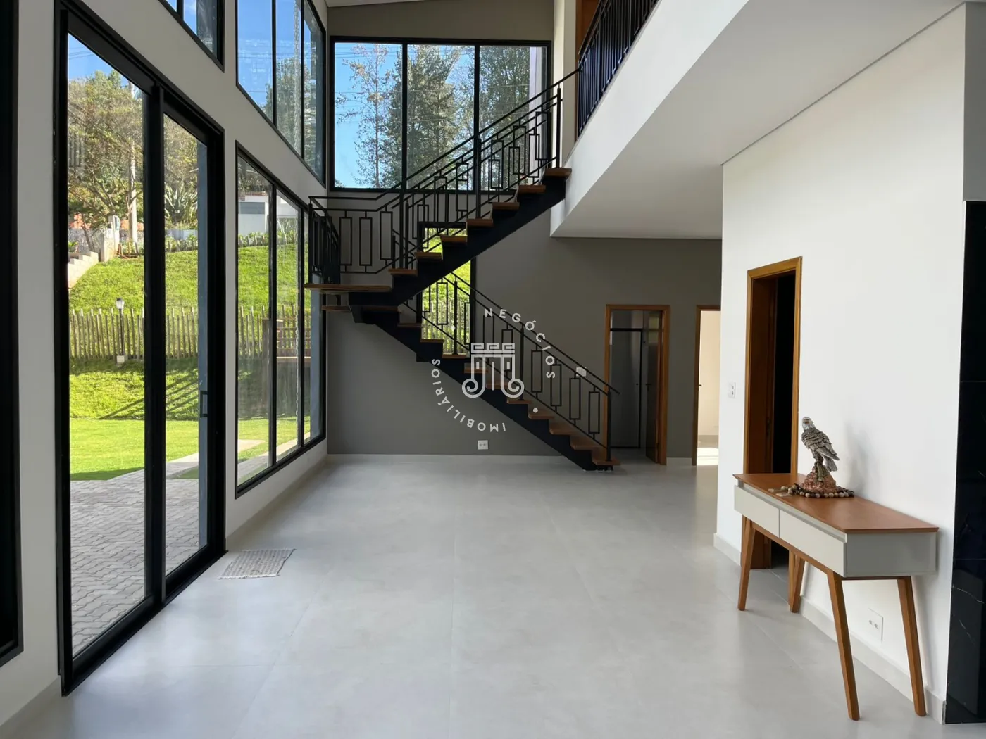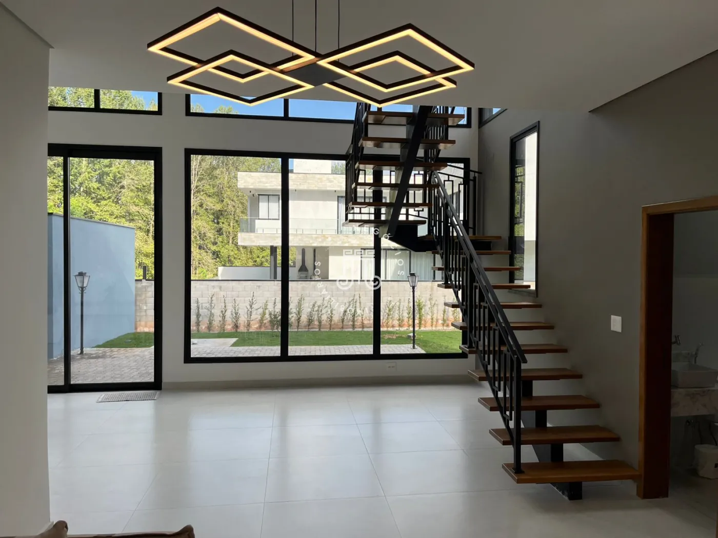 Casa em condomínio com 1.000 m² de terreno e 250 m² de área construída, com 4 dormitórios, sendo 3 suítes, sala americana integrada à cozinha, sala de TV, lavanderia e garagem coberta para 3 carros, com possibilidade de ateliê. Destaque para a sala de visitas com pé-direito duplo de 8 m e janelas de vidro que proporcionam excelente iluminação natural. Área externa com gramado, solário e redário. Construção de alta qualidade com porcelanato Portobello, peças Deca e Docol, fios de cobre e tomadas Pial Plus. Imóvel cercado por floresta, garantindo privacidade e contato com a natureza.