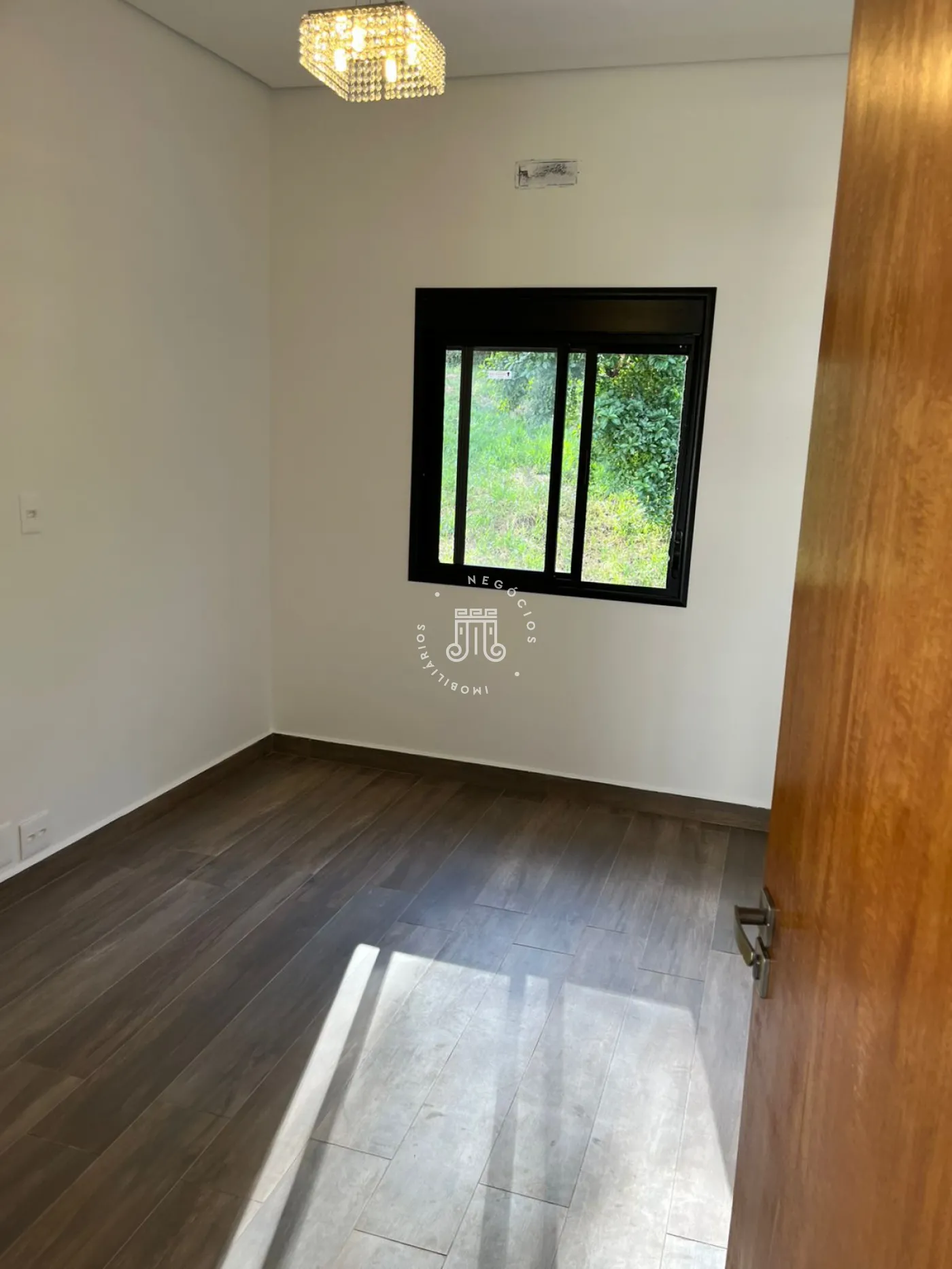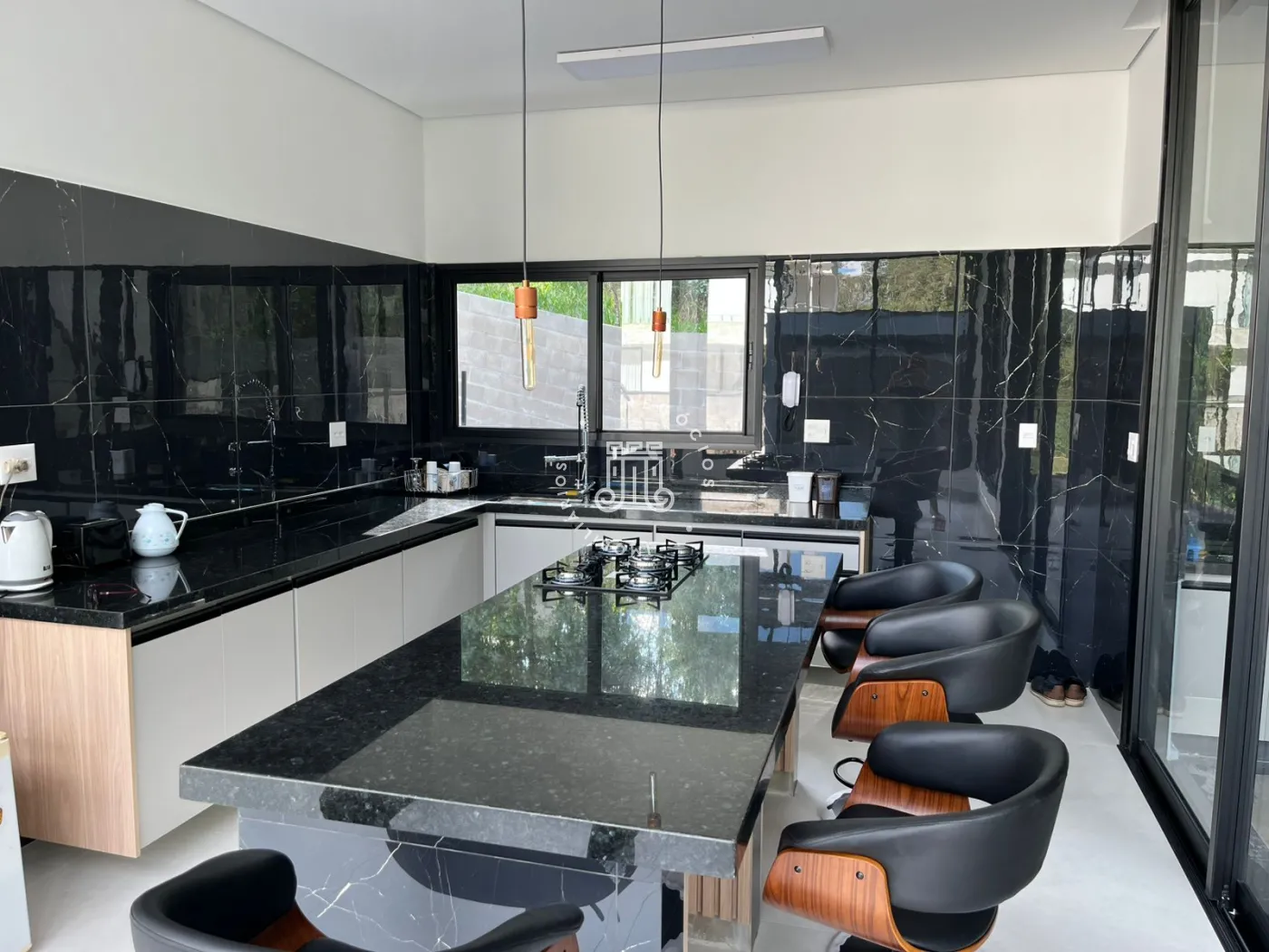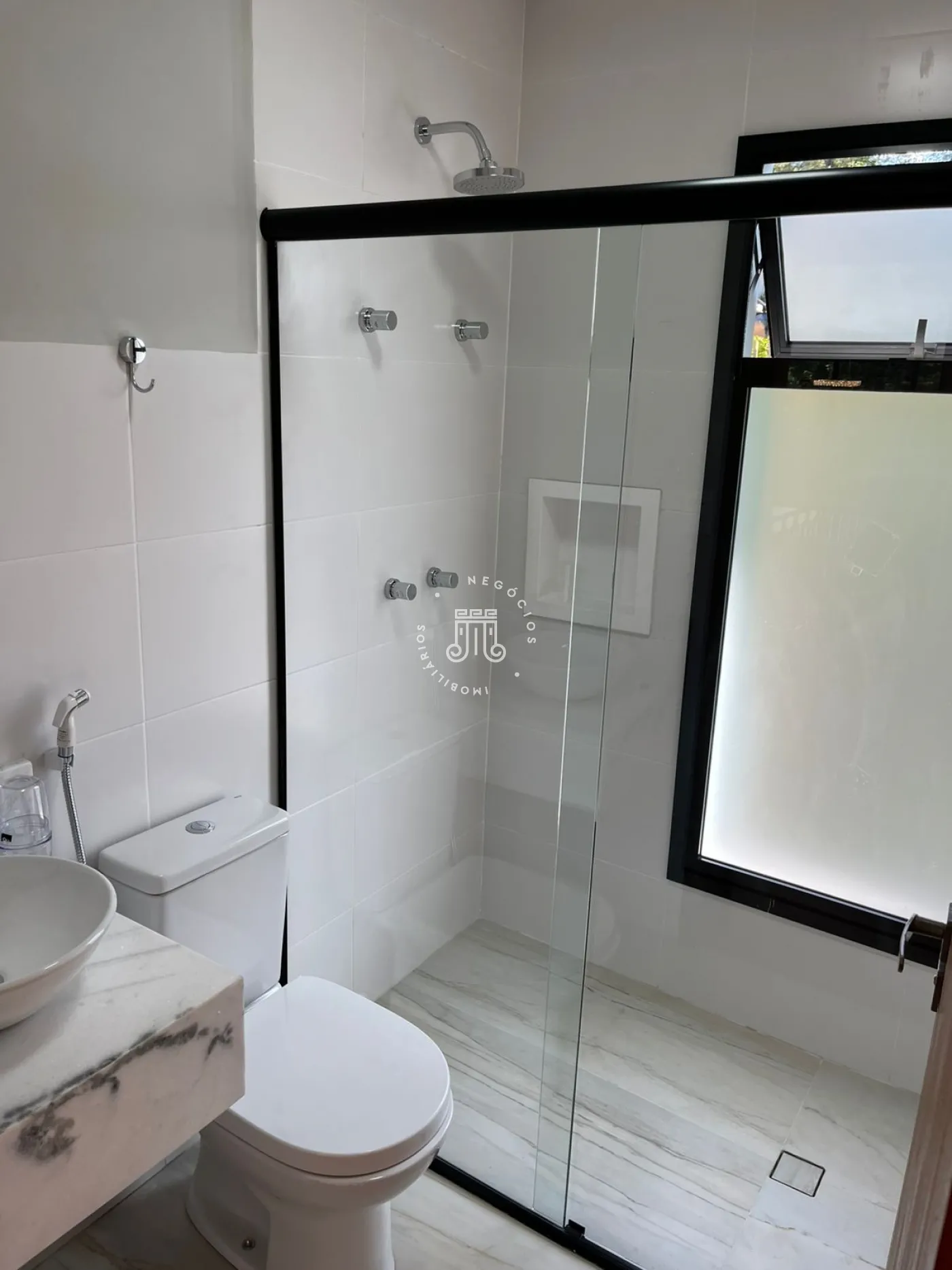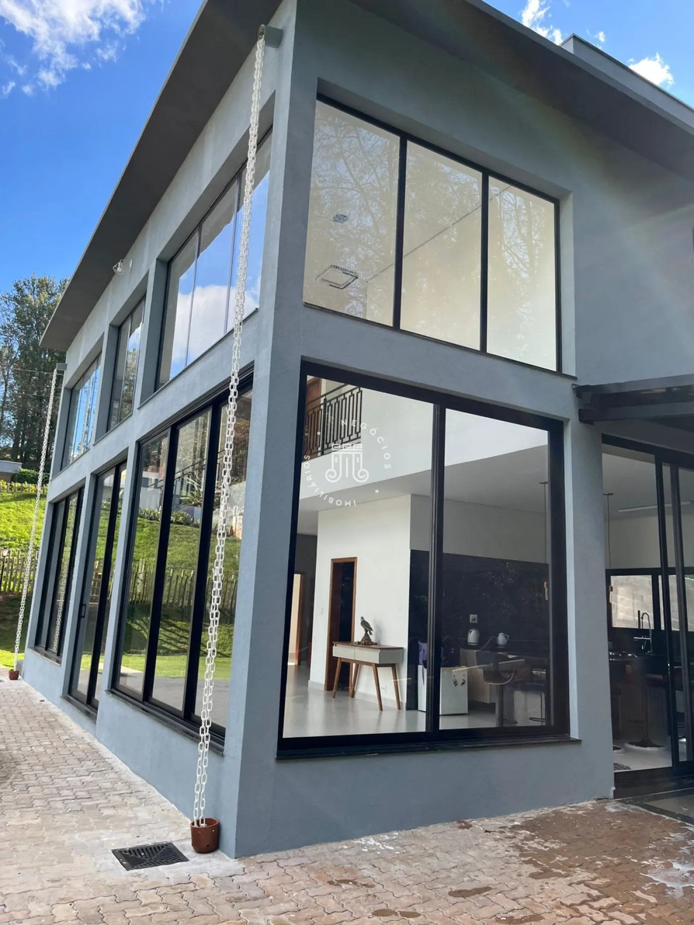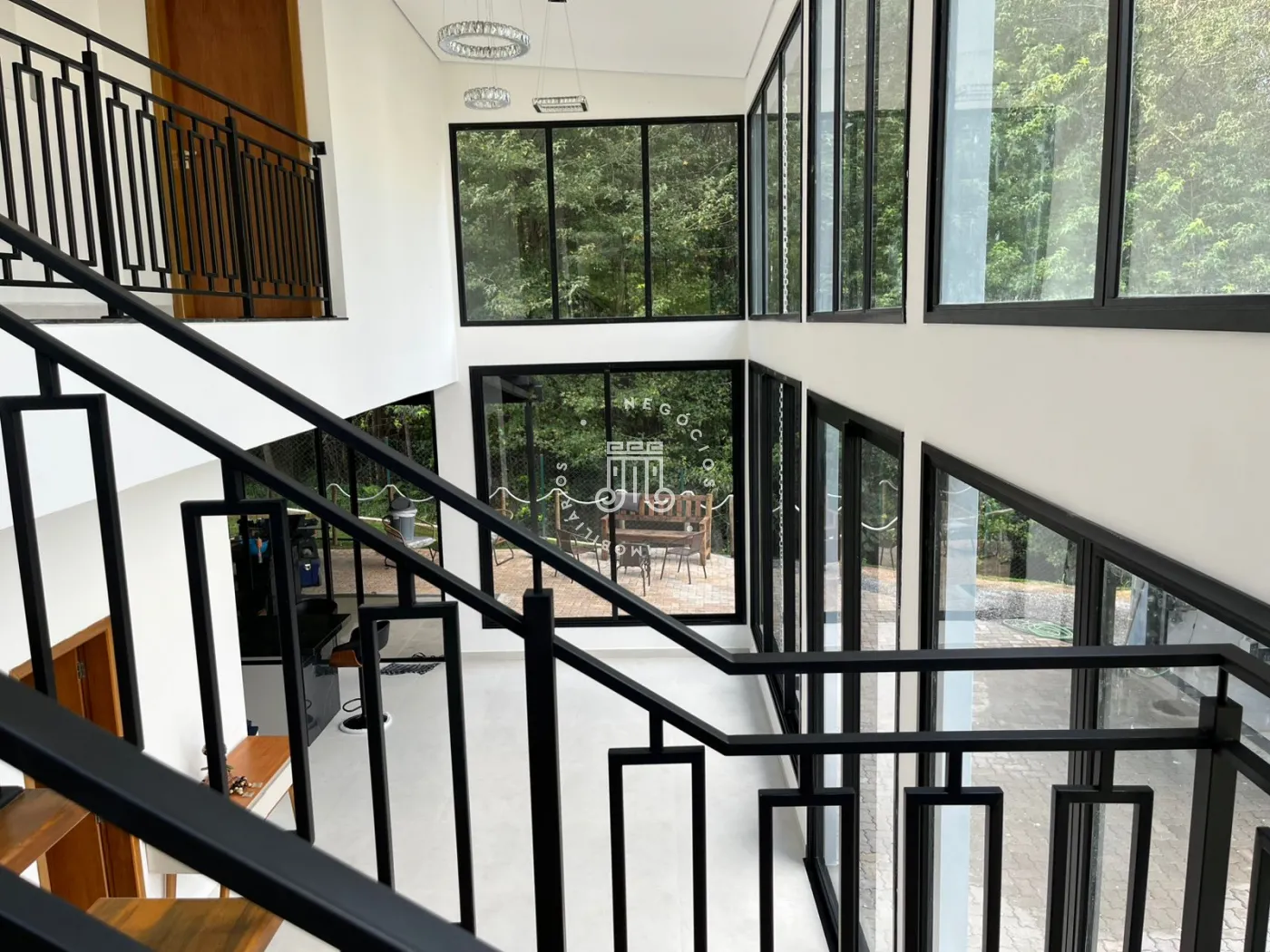 Casa em condomínio com 1.000 m² de terreno e 250 m² de área construída, com 4 dormitórios, sendo 3 suítes, sala americana integrada à cozinha, sala de TV, lavanderia e garagem coberta para 3 carros, com possibilidade de ateliê. Destaque para a sala de visitas com pé-direito duplo de 8 m e janelas de vidro que proporcionam excelente iluminação natural. Área externa com gramado, solário e redário. Construção de alta qualidade com porcelanato Portobello, peças Deca e Docol, fios de cobre e tomadas Pial Plus. Imóvel cercado por floresta, garantindo privacidade e contato com a natureza.