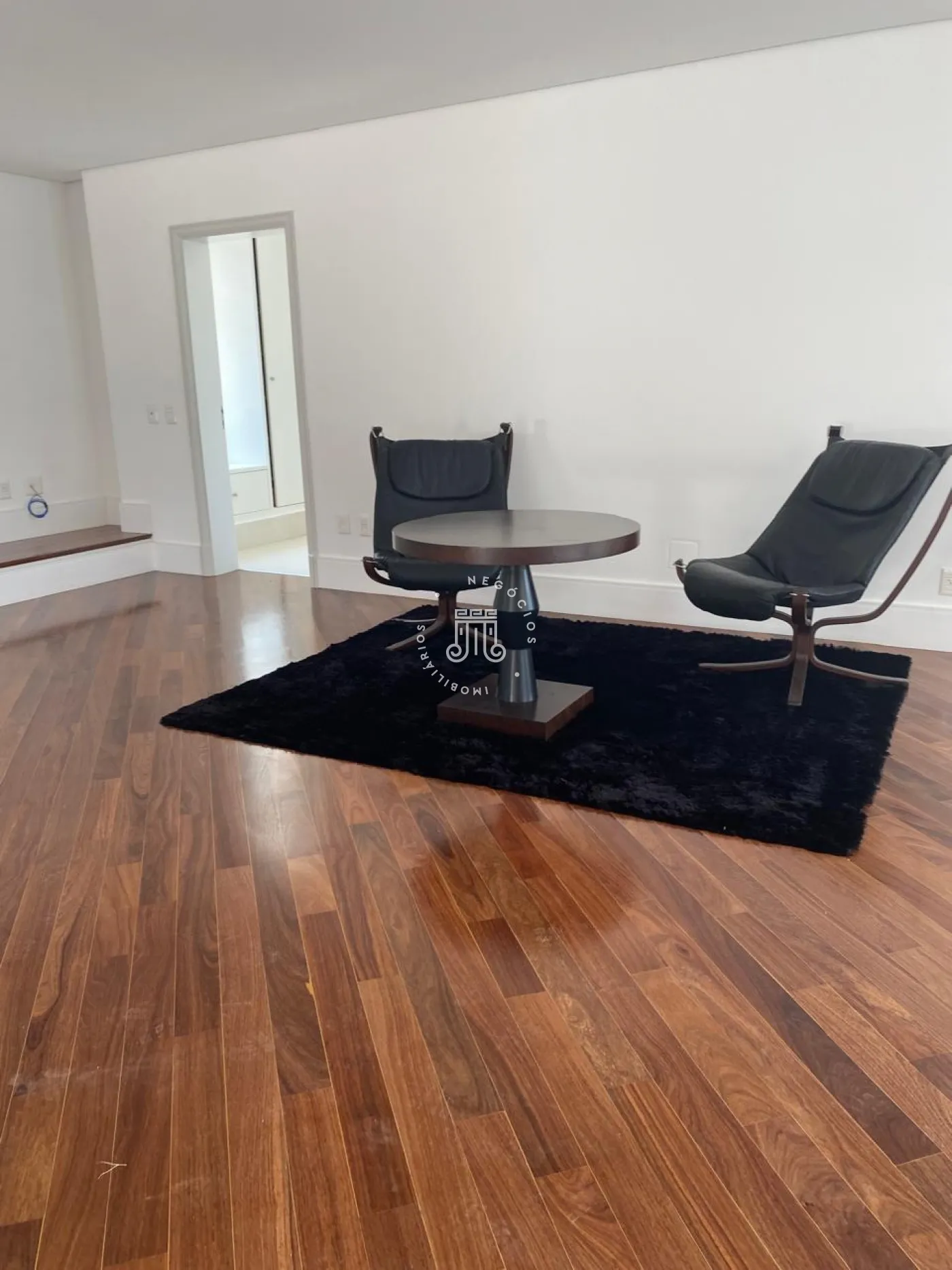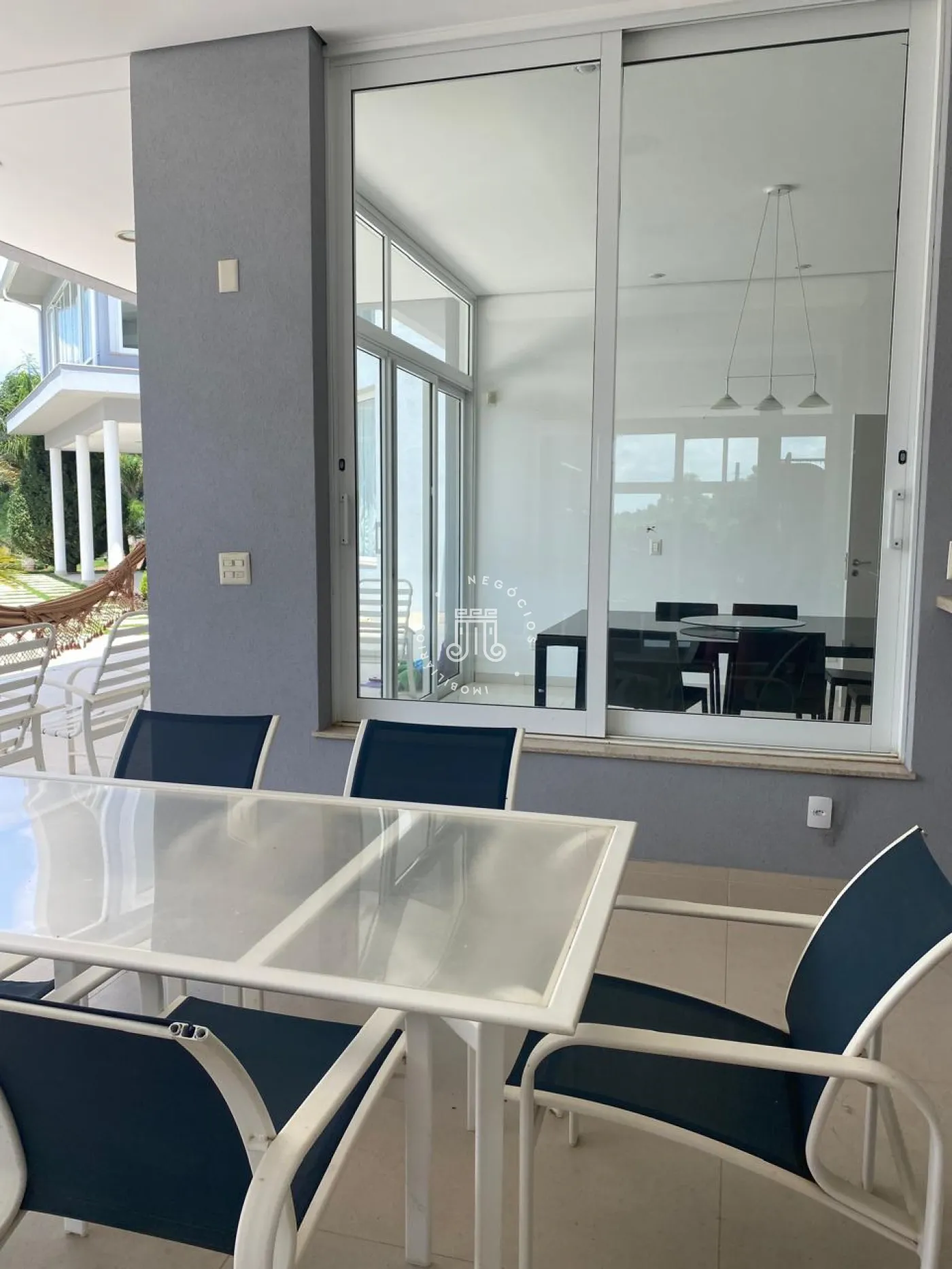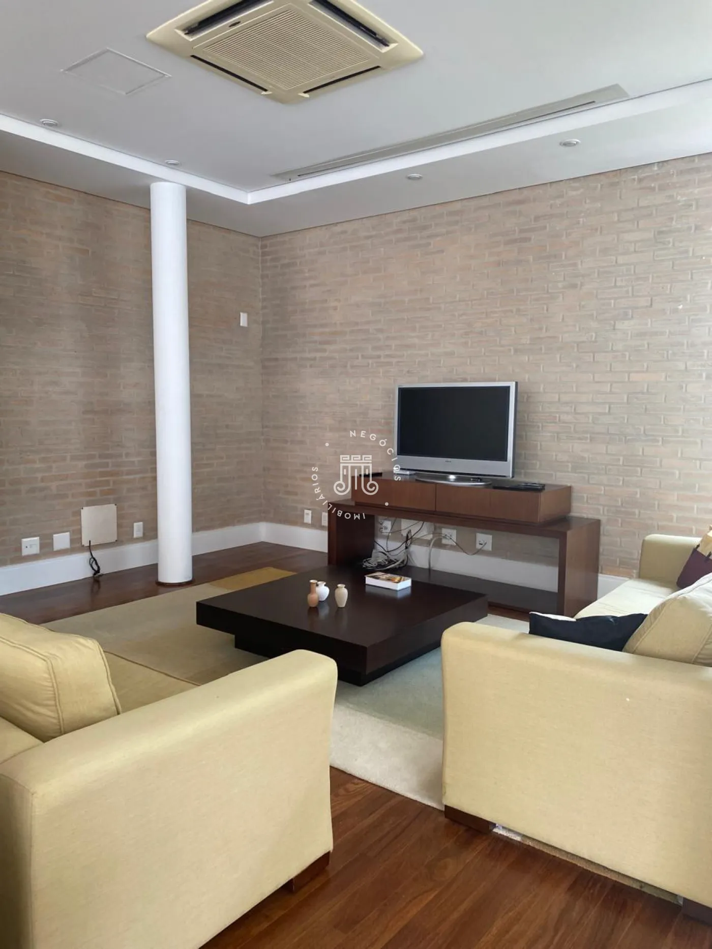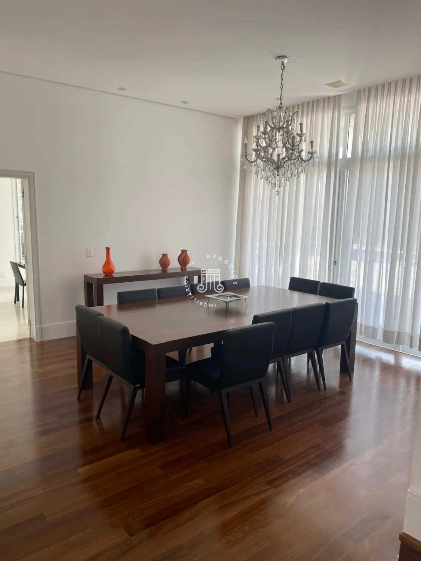 A área social integra a sala de jantar ao living, dispondo de uma mesa de mármore importada da Itália. Há ainda sala com lareira, sala de cinema equipada com sistema de som 7.1, tela de projeção de 100 polegadas e espaço destinado a pista de dança. A cozinha está equipada com eletrodomésticos, incluindo fornos italiano a gás e elétrico, e conta com sala de refeições anexa. A área de serviço possui dormitório auxiliar.