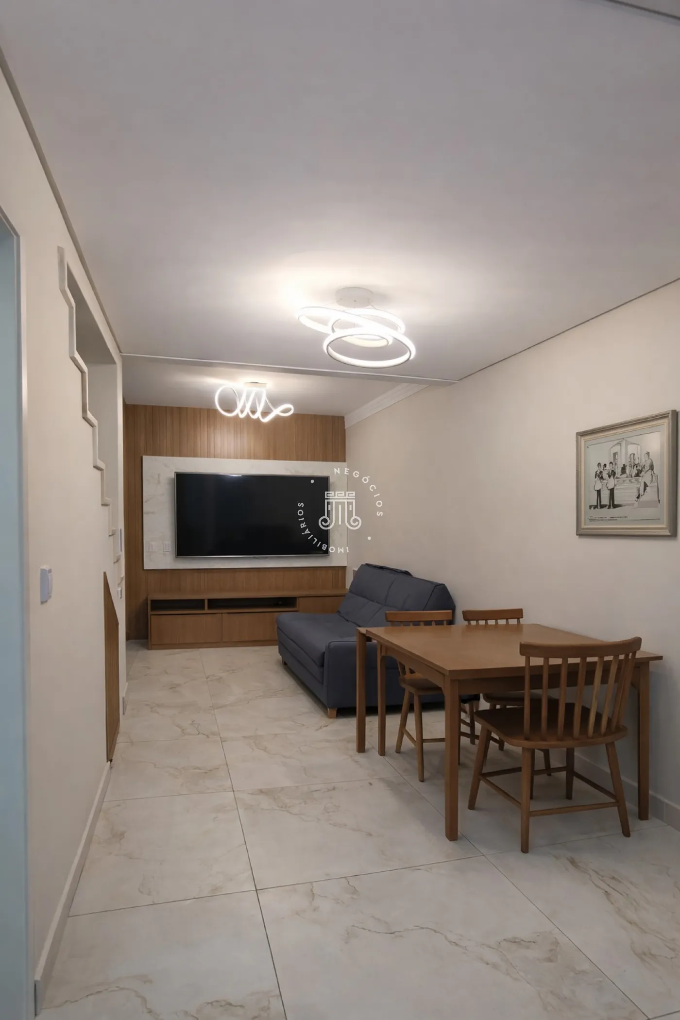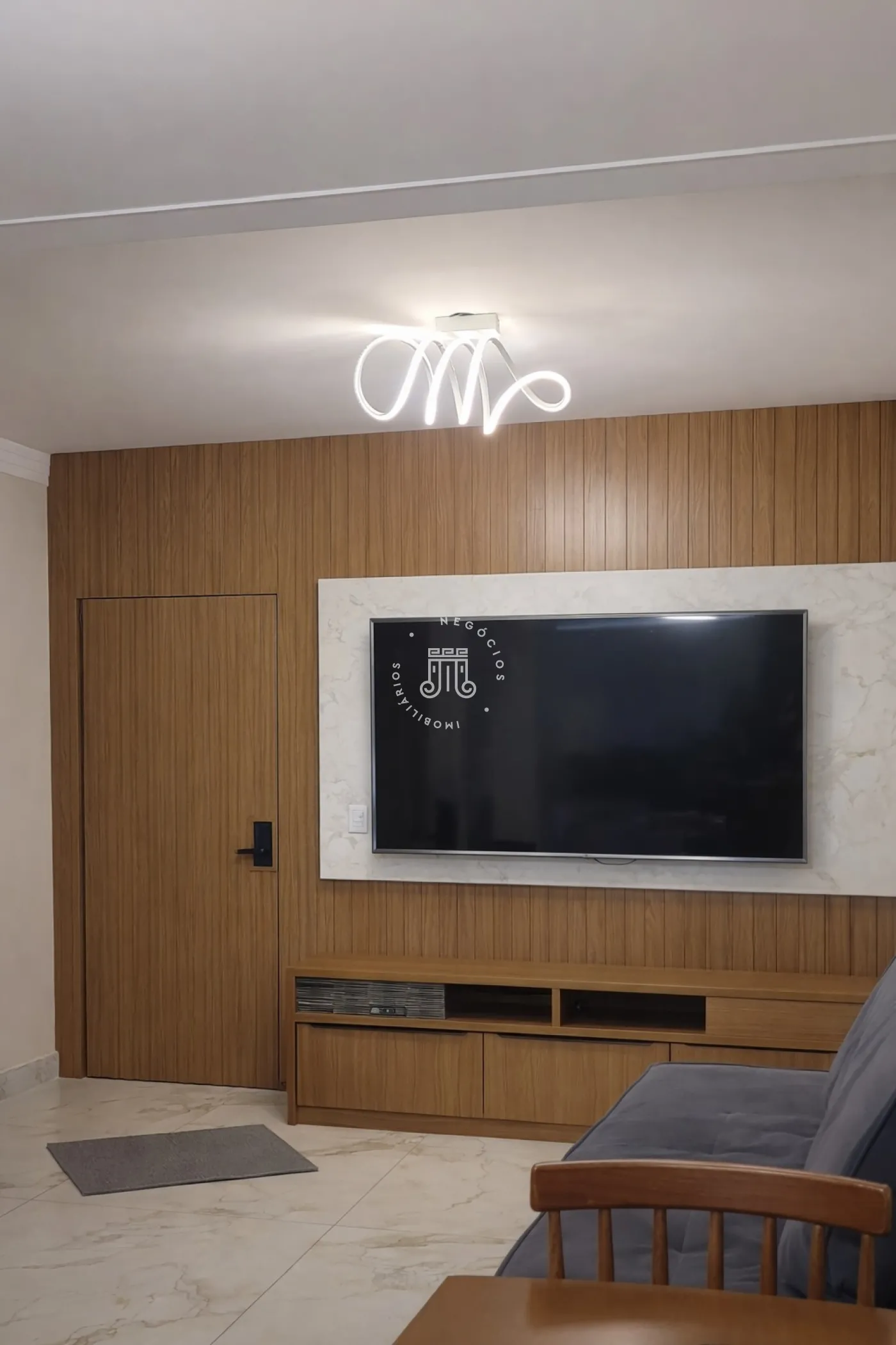 - Sala com painel e armários;
