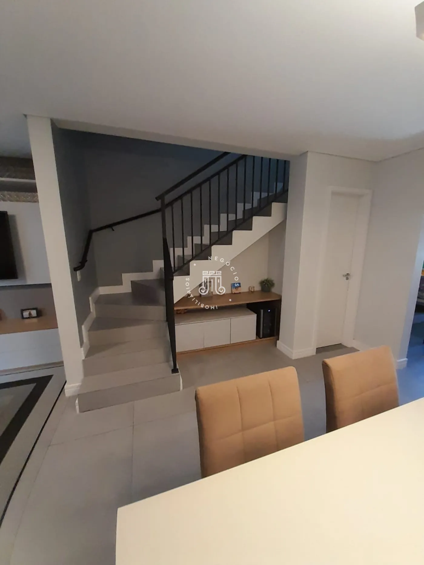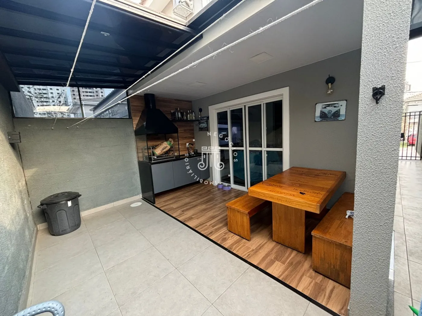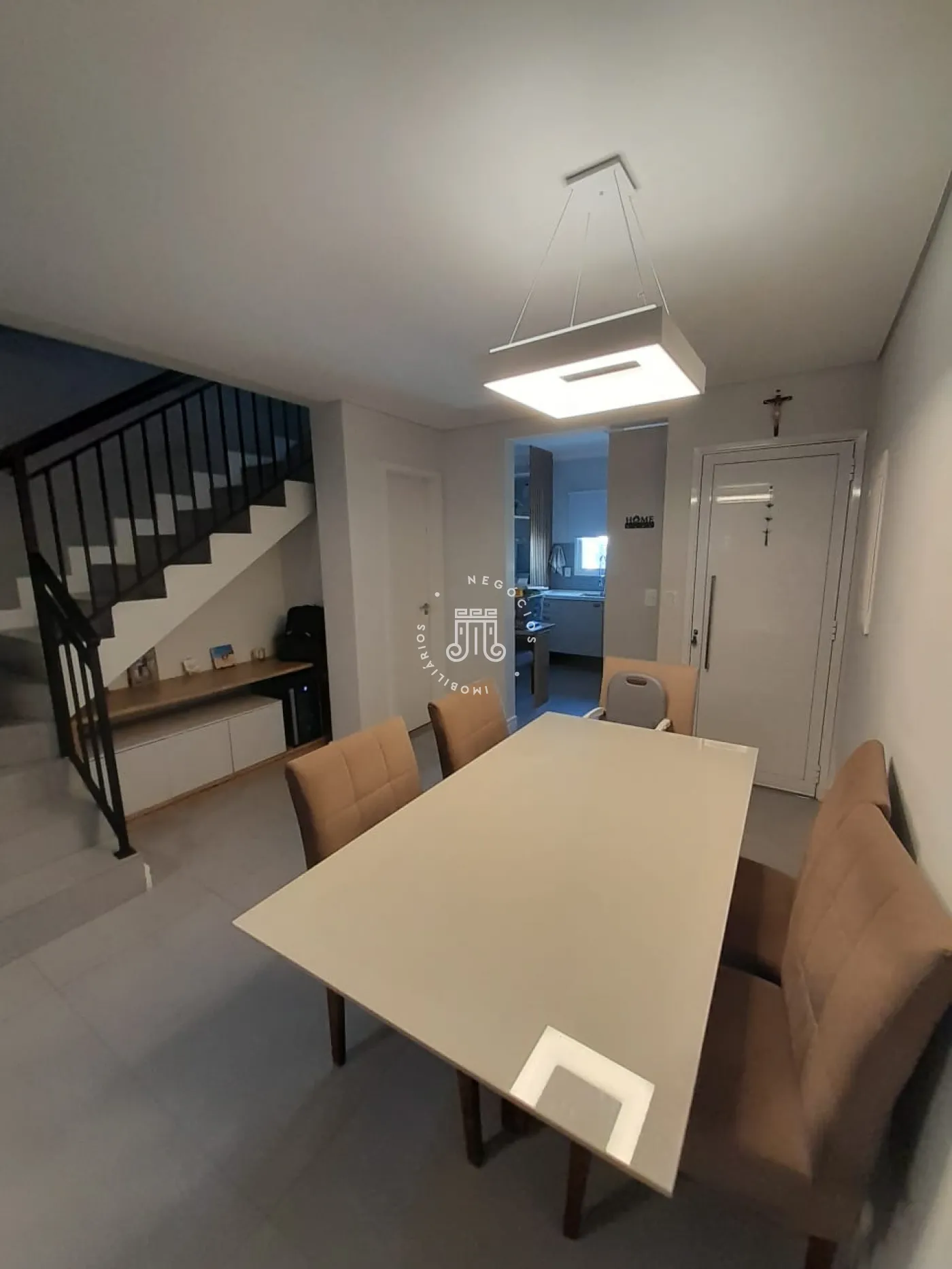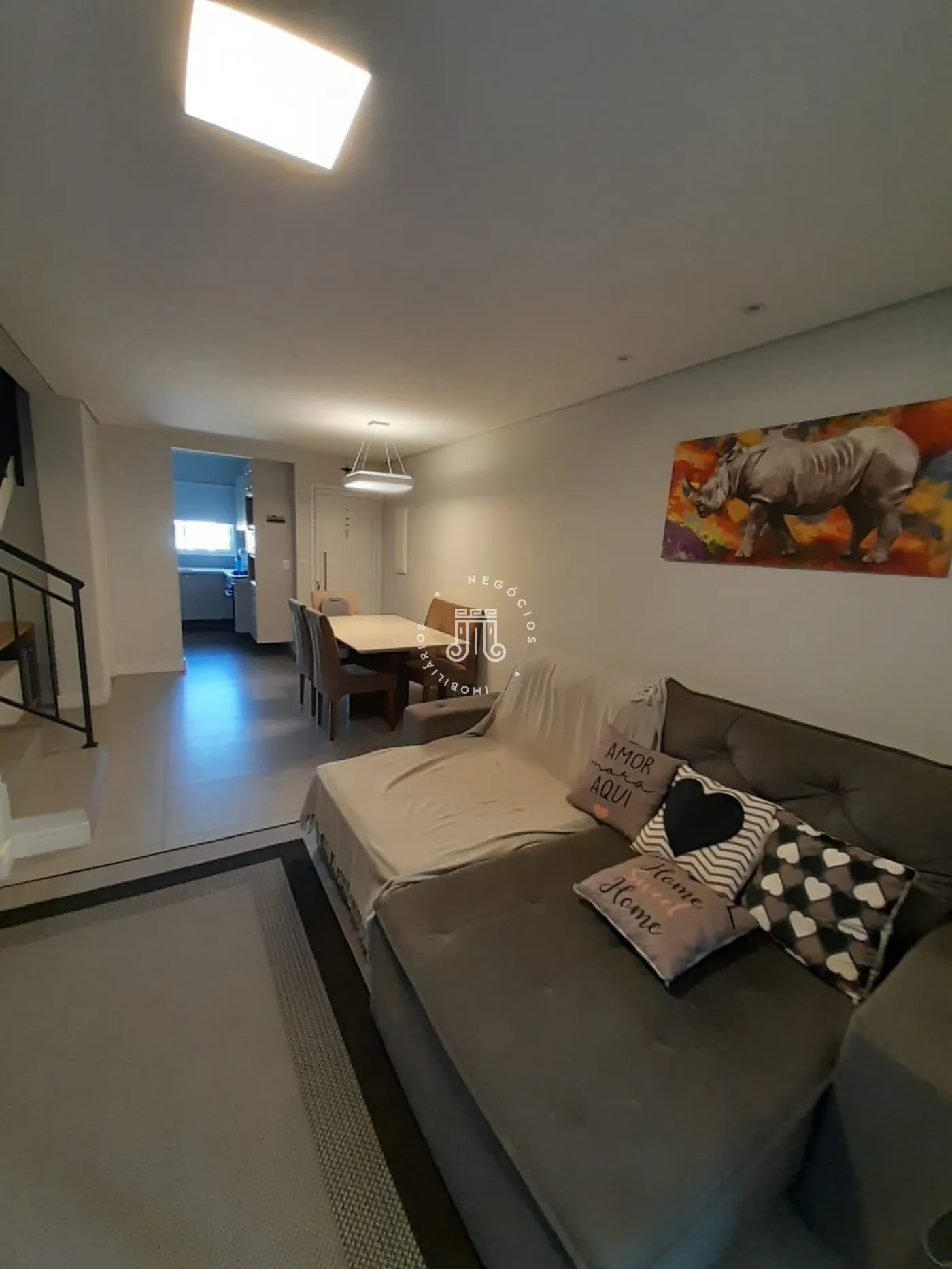 Sobrado com 2 suítes (uma com closet e outra com varanda), sala para 2 ambientes com painel para TV, cozinha planejada, lavabo, área de serviço com armários e área gourmet com churrasqueira e teto retrátil. Possui 2 vagas de garagem.
