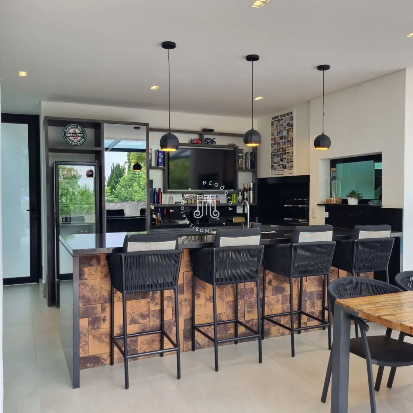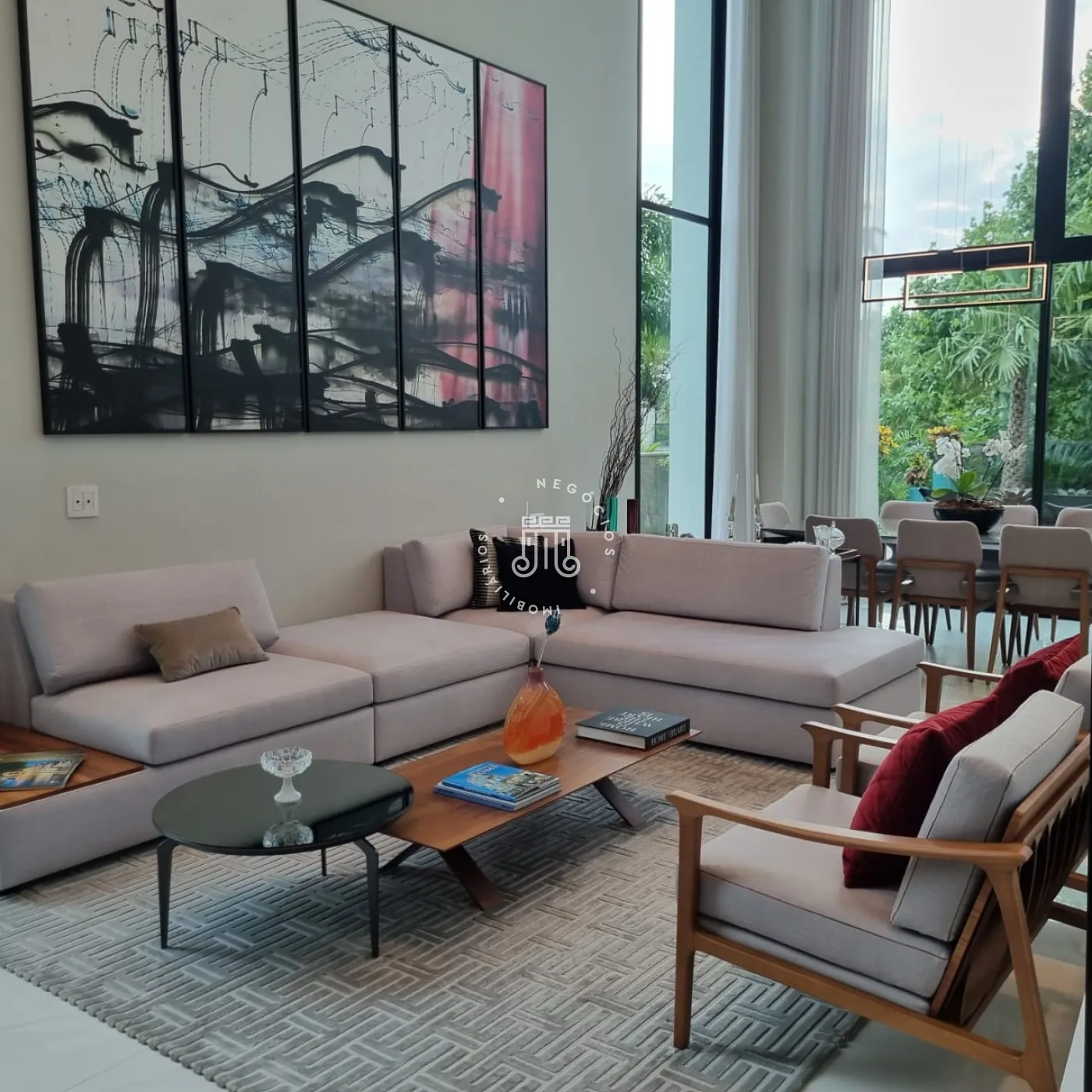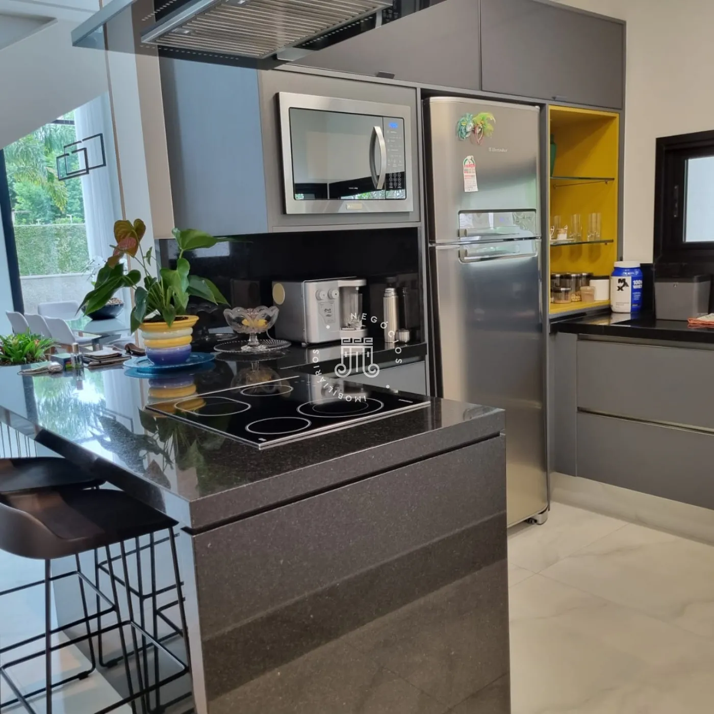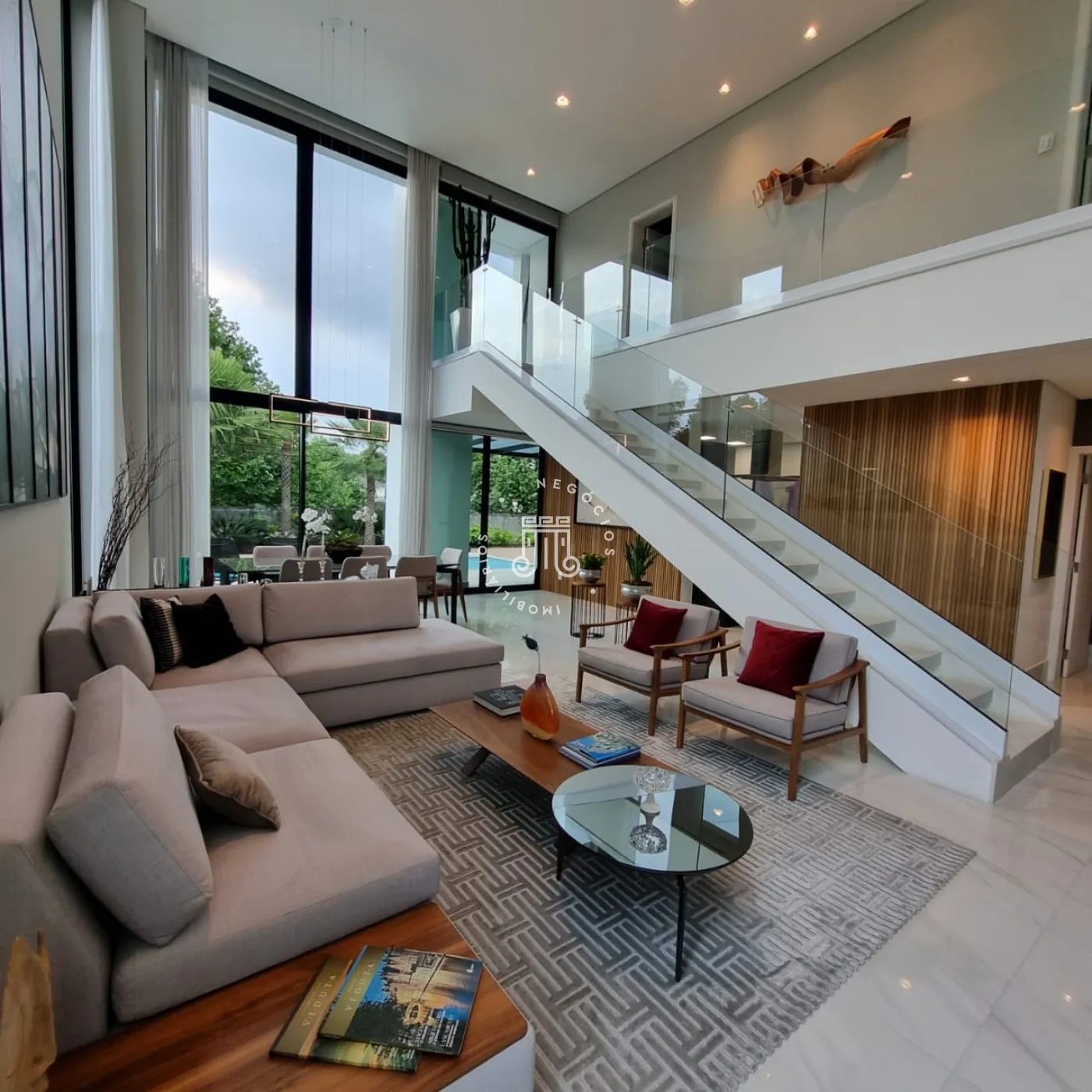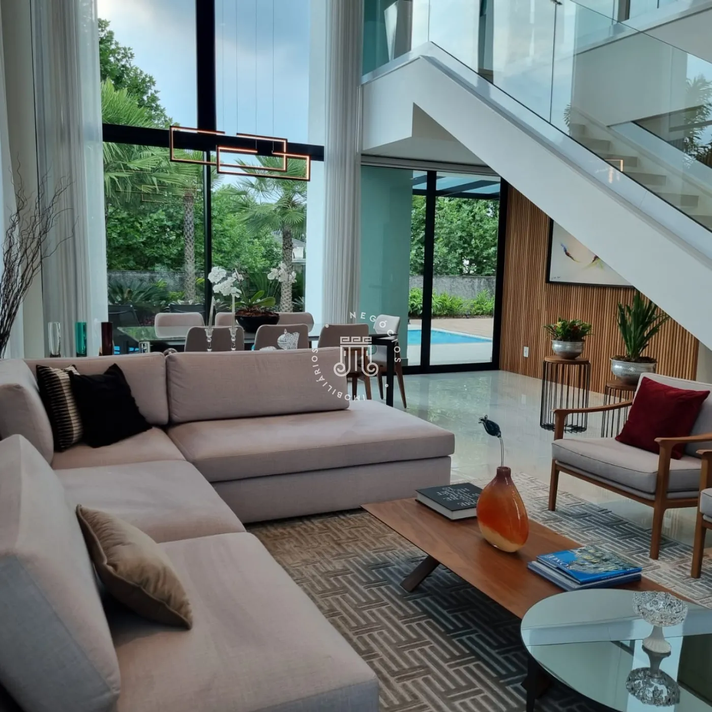 Parte térrea, living com pé direito duplo ,sala de jantar, lavabo ,cozinha com ilha integrada a sala de jantar e com armários planejados ,despensa, área de serviço, banheiro de serviço, amplo quintal, piscina, espaço gourmet com churrasqueira e 6 vagas de garagem sendo 3 cobertas.