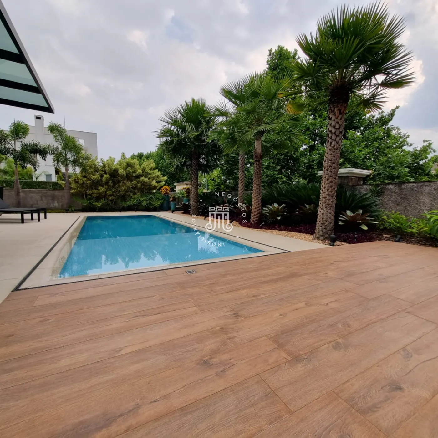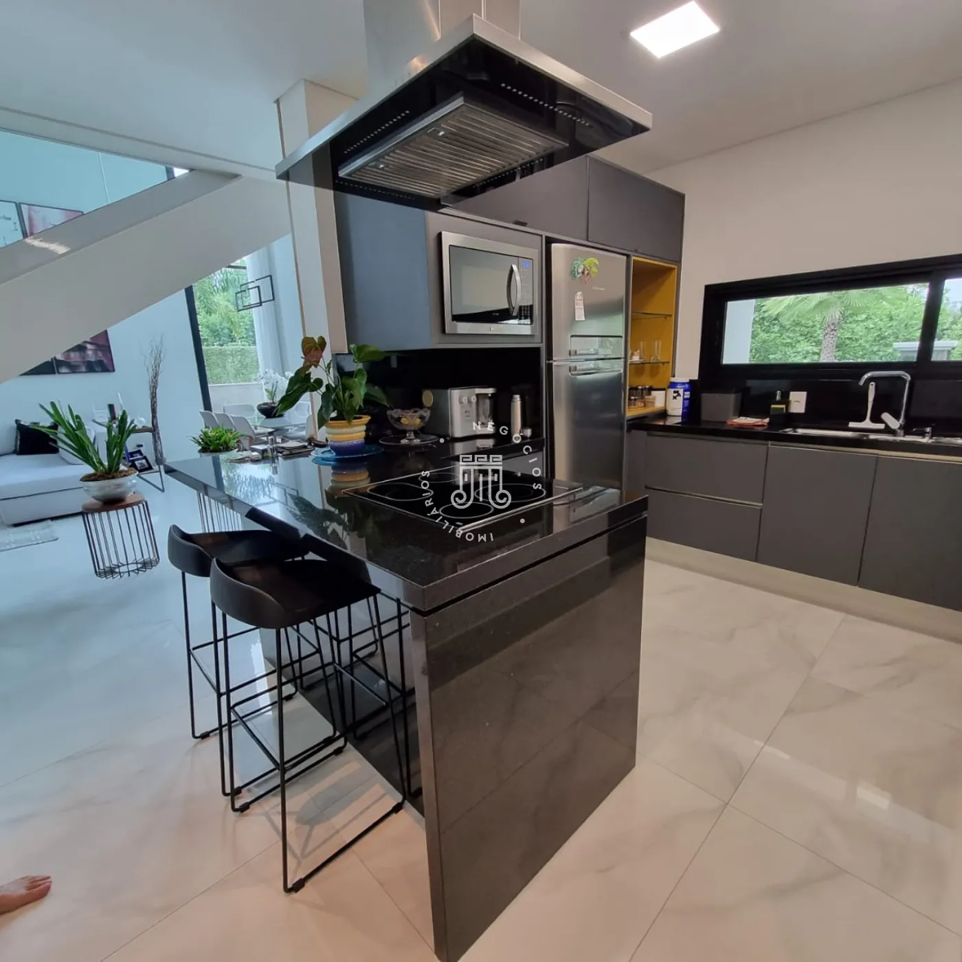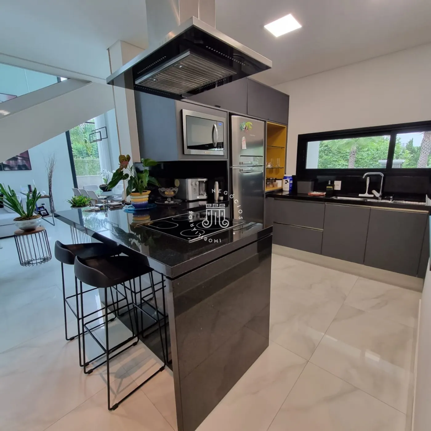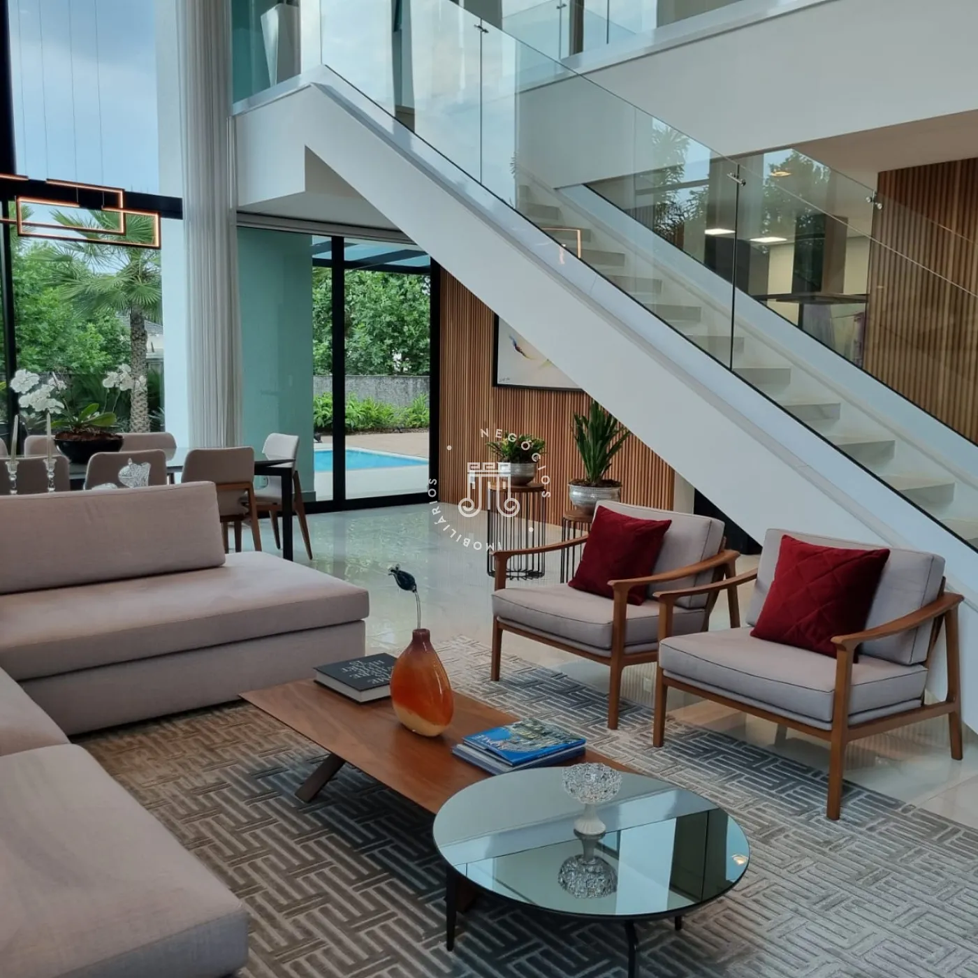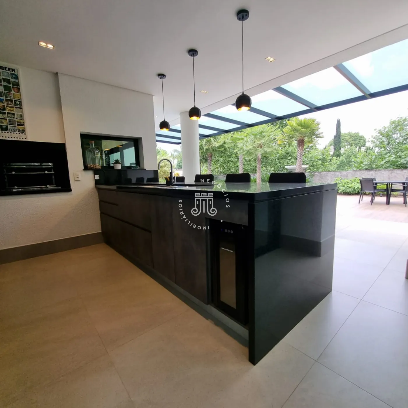Parte térrea, living com pé direito duplo ,sala de jantar, lavabo ,cozinha com ilha integrada a sala de jantar e com armários planejados ,despensa, área de serviço, banheiro de serviço, amplo quintal, piscina, espaço gourmet com churrasqueira e 6 vagas de garagem sendo 3 cobertas.