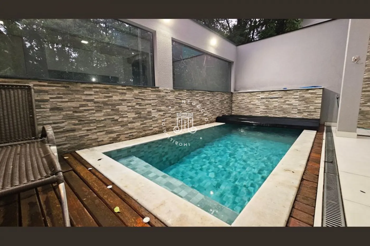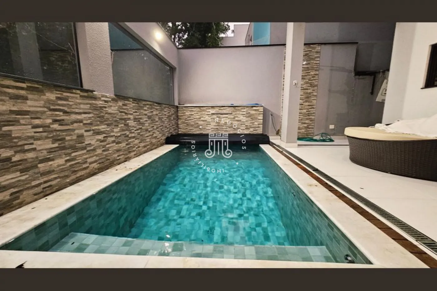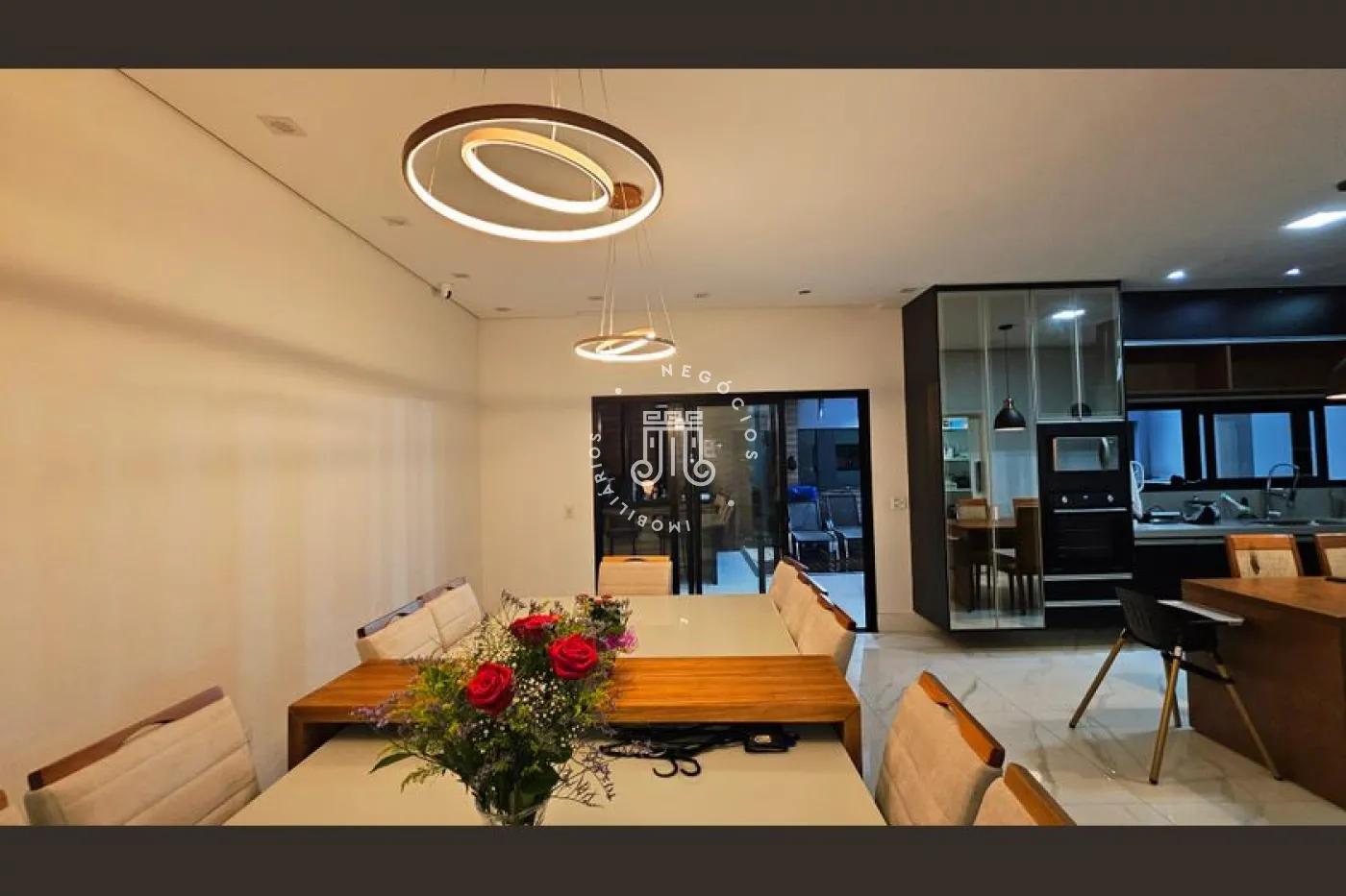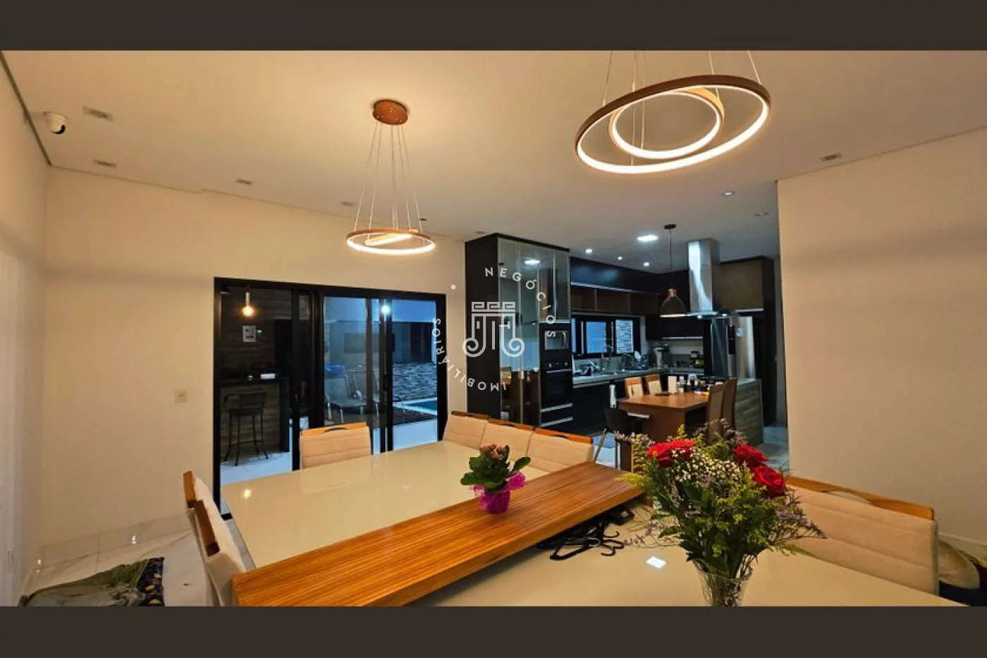 O imóvel conta com 4 dormitórios, sendo 3 suítes com sacadas, escritório e banheiro social. Possui sala para 2 ambientes, lavabo, copa e cozinha planejada, área de serviço e área gourmet completa com quintal e piscina. Dispõe ainda de 4 vagas de garagem, sendo 2 cobertas. A casa conta com aquecimento a gás e ar-condicionado.