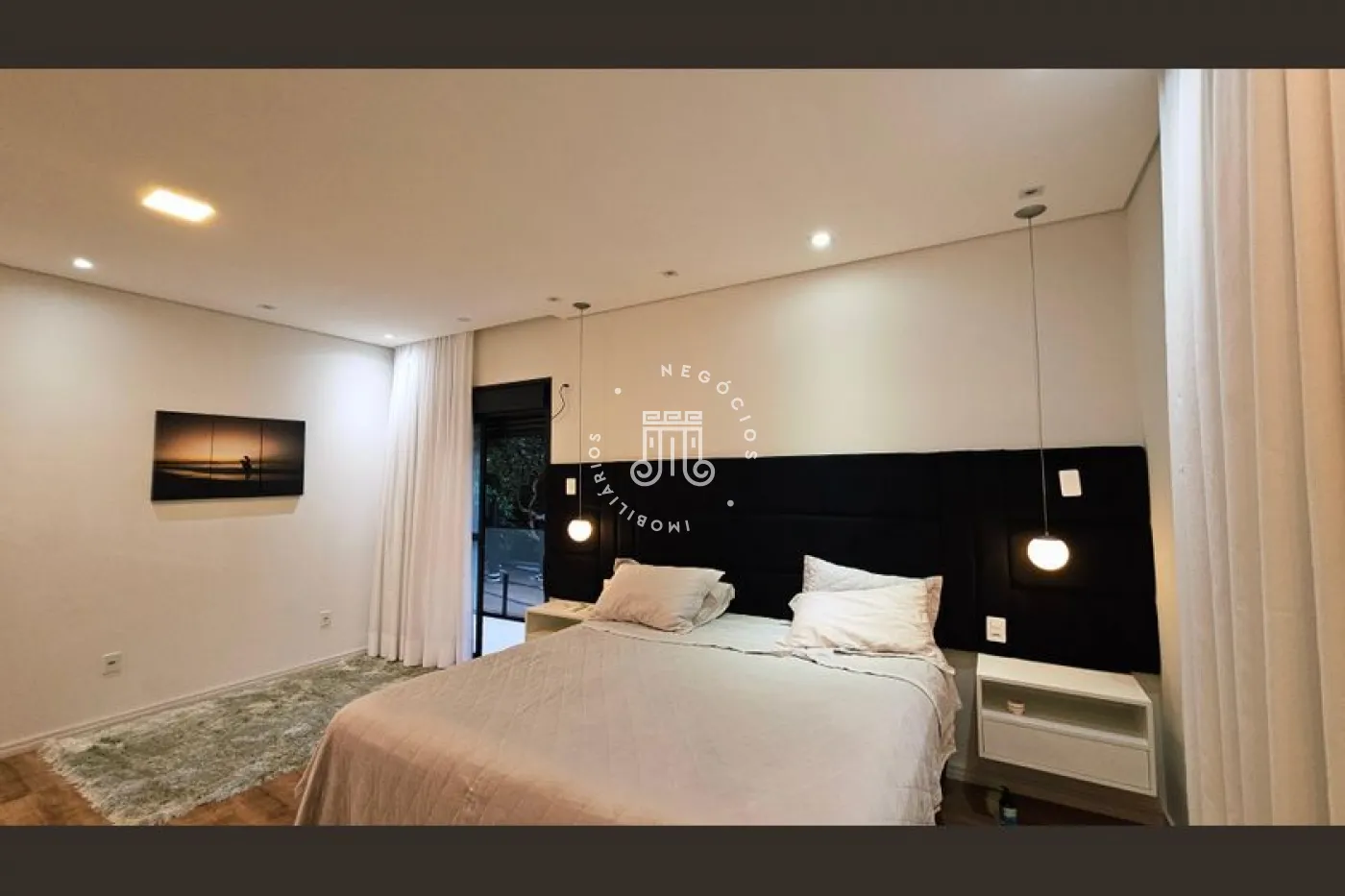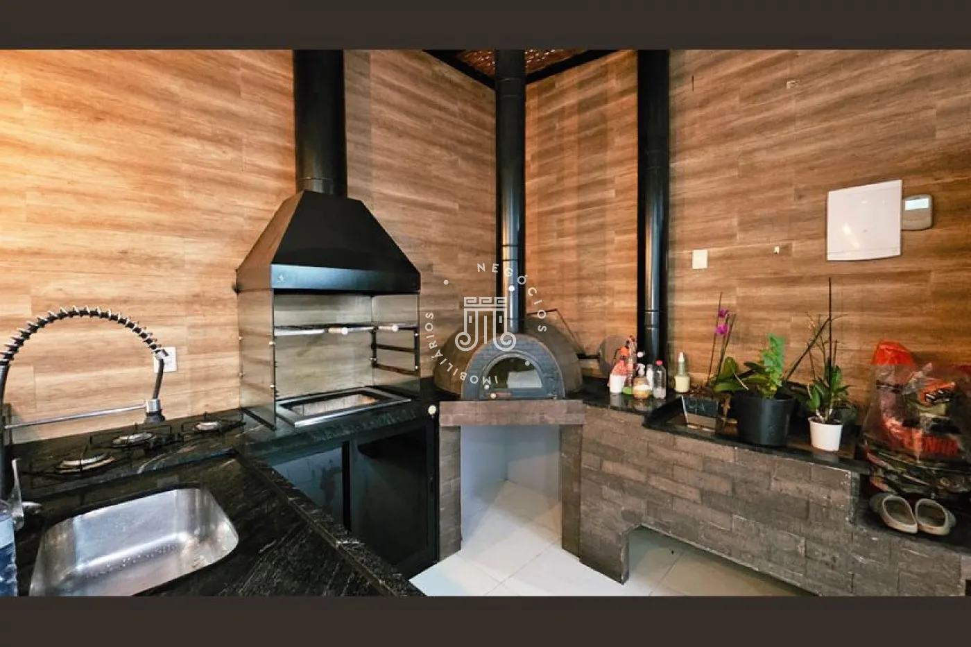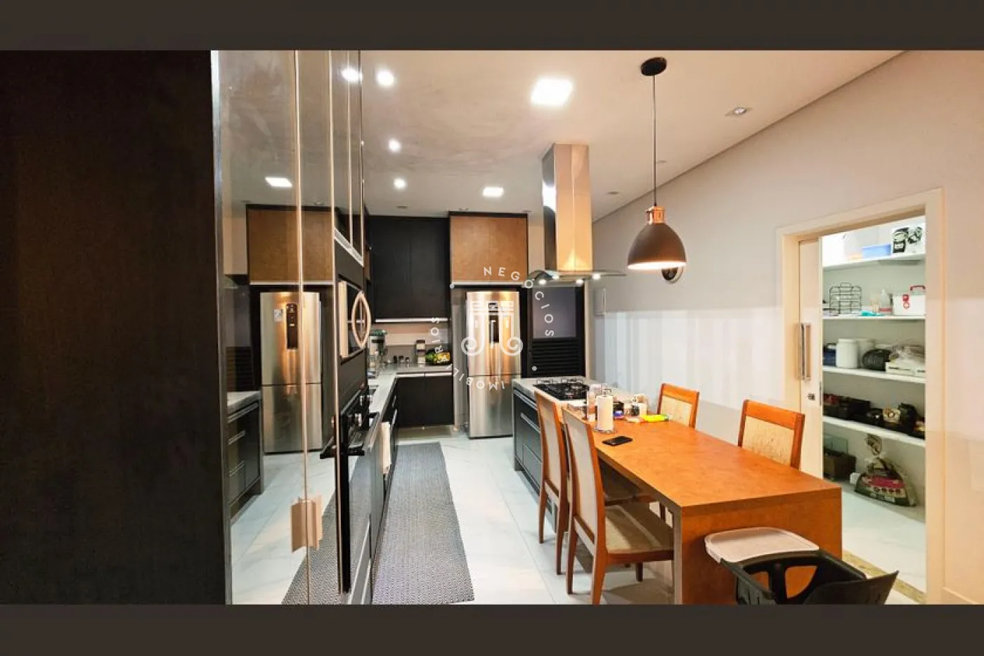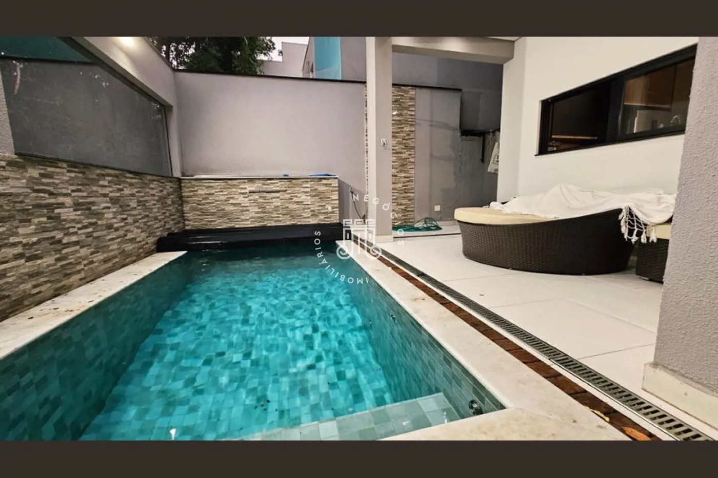 O imóvel conta com 4 dormitórios, sendo 3 suítes com sacadas, escritório e banheiro social. Possui sala para 2 ambientes, lavabo, copa e cozinha planejada, área de serviço e área gourmet completa com quintal e piscina. Dispõe ainda de 4 vagas de garagem, sendo 2 cobertas. A casa conta com aquecimento a gás e ar-condicionado.