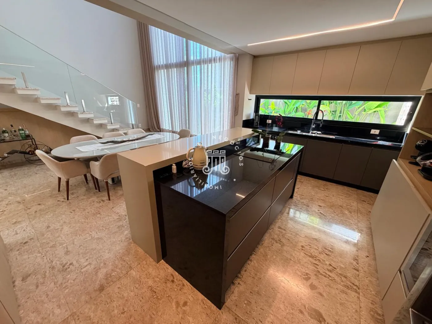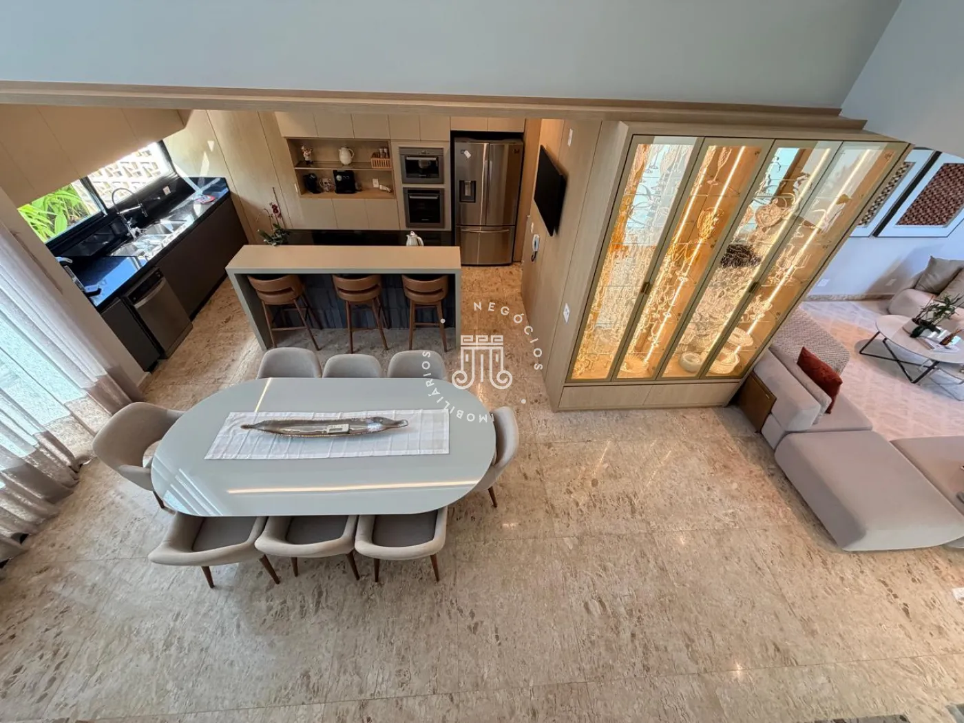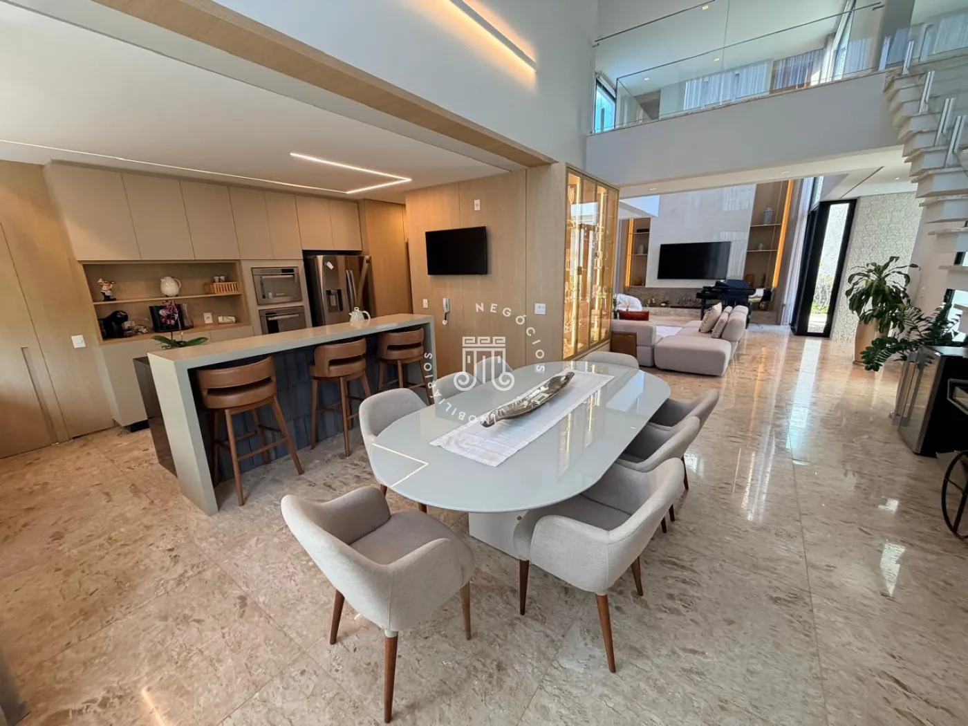 Logo na entrada, o lavabo acolhe com elegância e discrição. O living integra sala de estar e jantar à cozinha de forma fluida, criando um ambiente social amplo, funcional e convidativo ? ideal tanto para receber convidados quanto para o dia a dia com conforto e leveza. A lavanderia, reservada, garante praticidade sem interferir na área social. Ainda no térreo, um espaço versátil amplia as possibilidades de uso, podendo ser adaptado como escritório, brinquedoteca, ateliê ou até mesmo um dormitório de apoio.