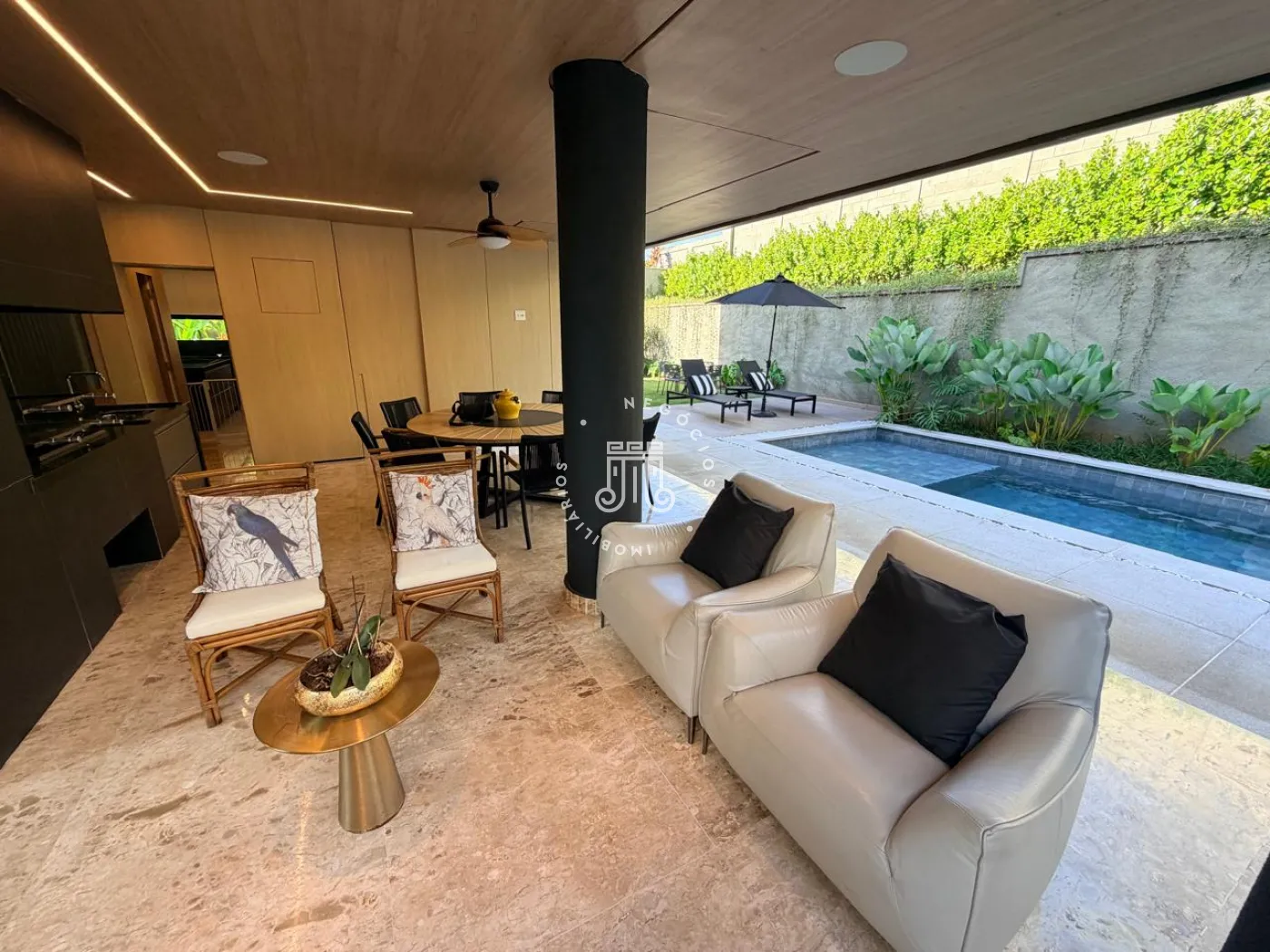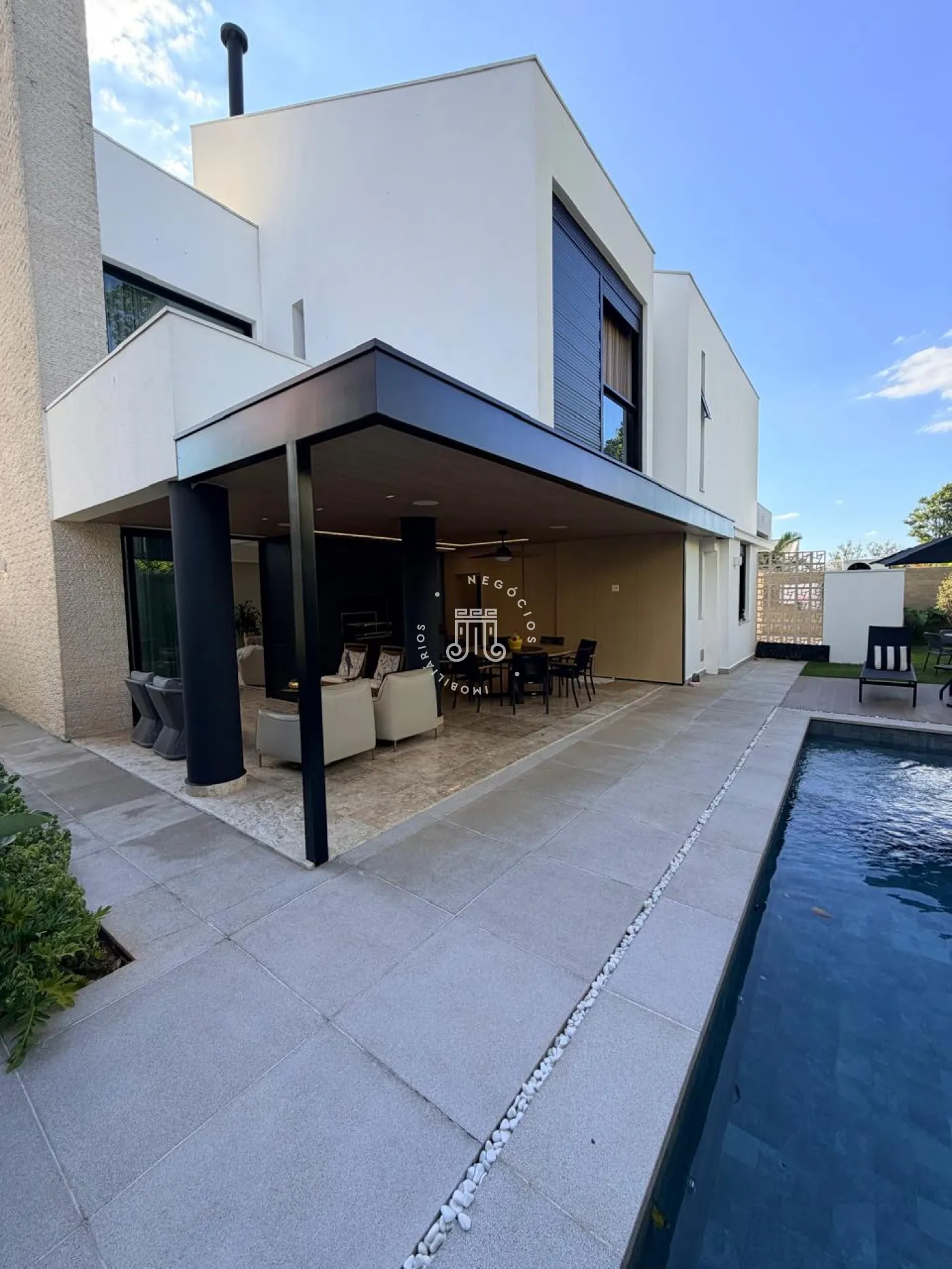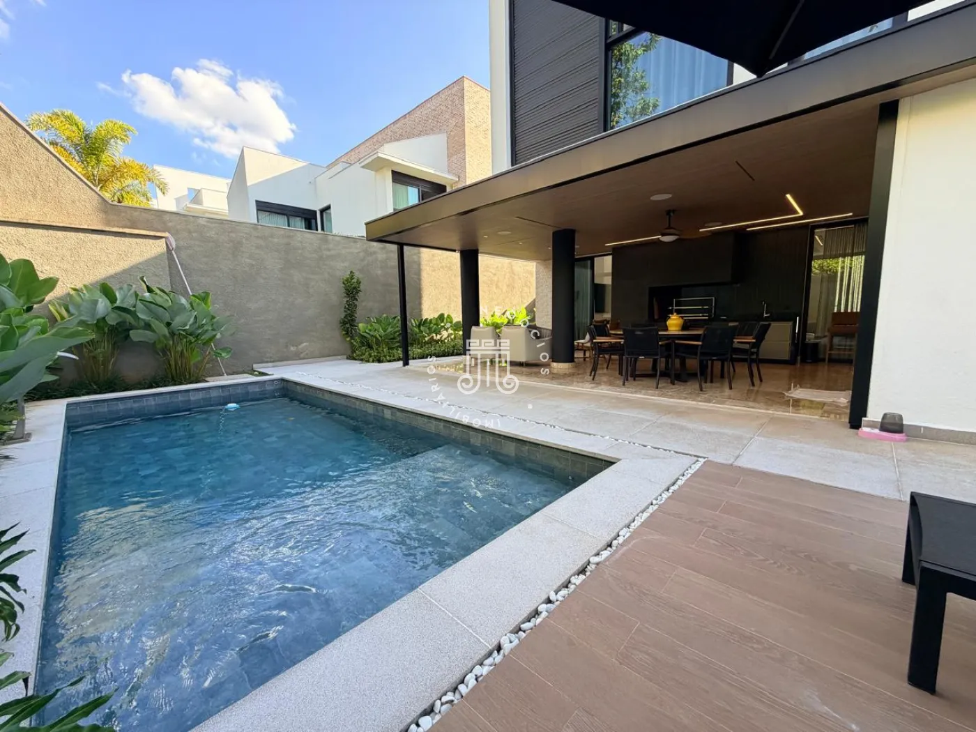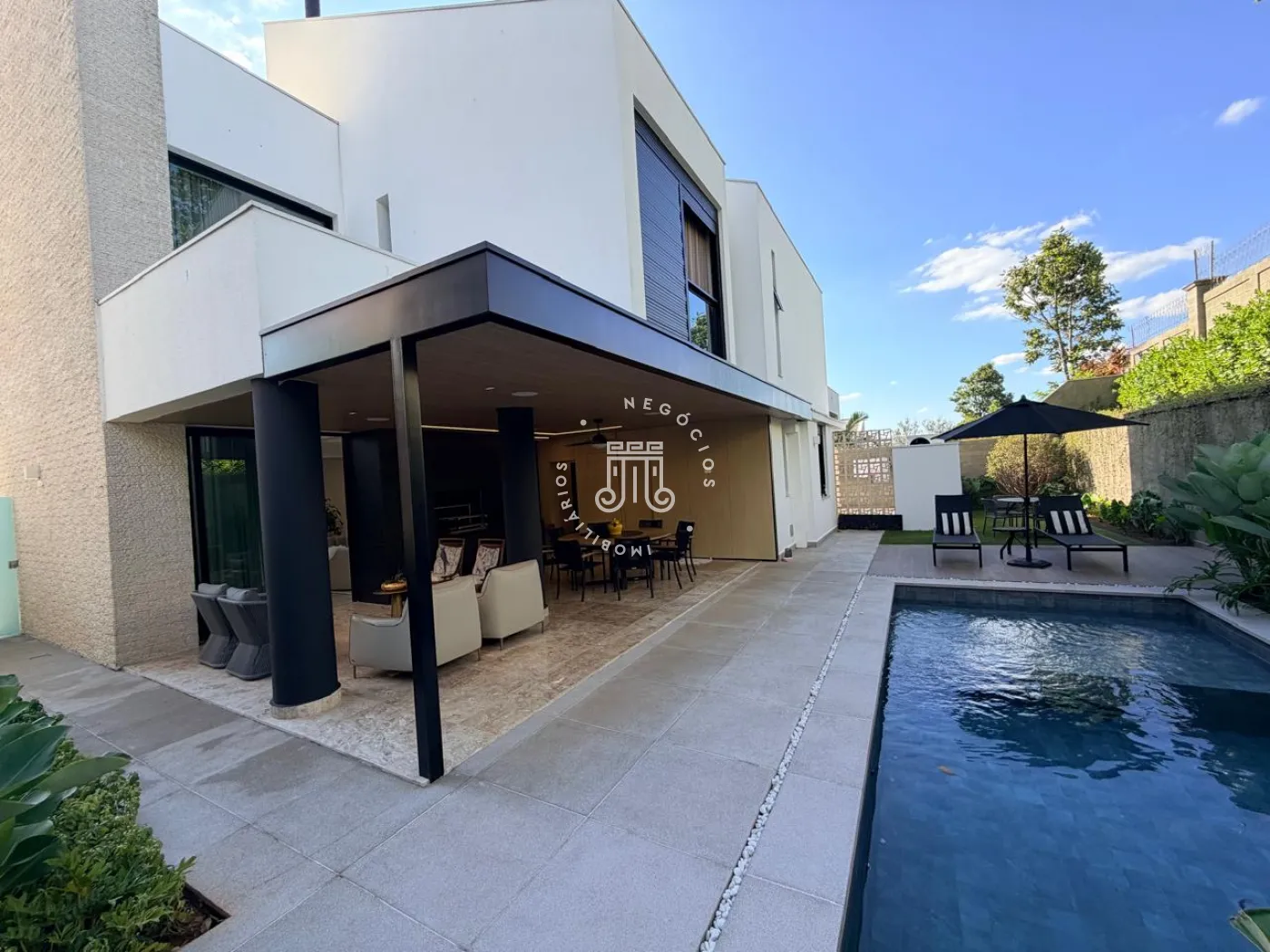 A área externa é um verdadeiro convite ao convívio. Com churrasqueira, piscina e um amplo quintal, o espaço foi pensado para momentos de lazer, encontros e experiências memoráveis. O paisagismo, cuidadosamente elaborado, reforça a sensação de bem-estar, enquanto a ausência de vizinhos nos fundos garante um diferencial cada vez mais raro: privacidade.