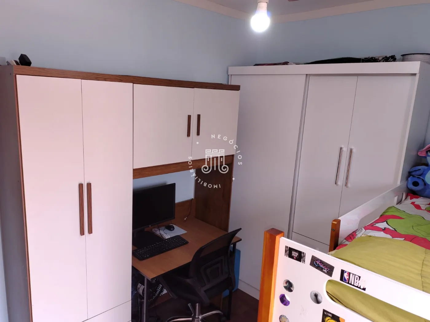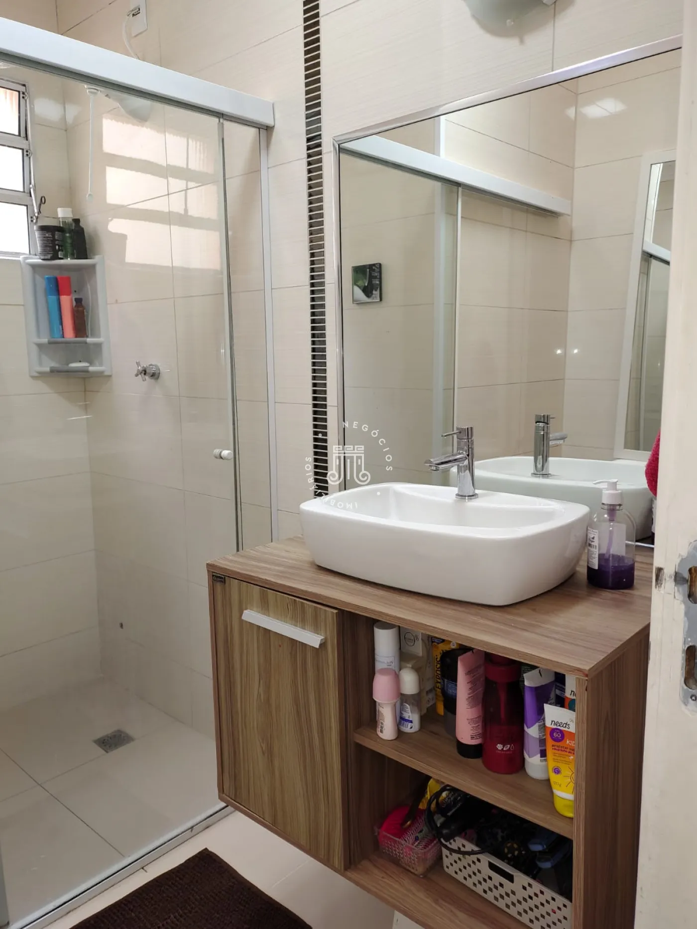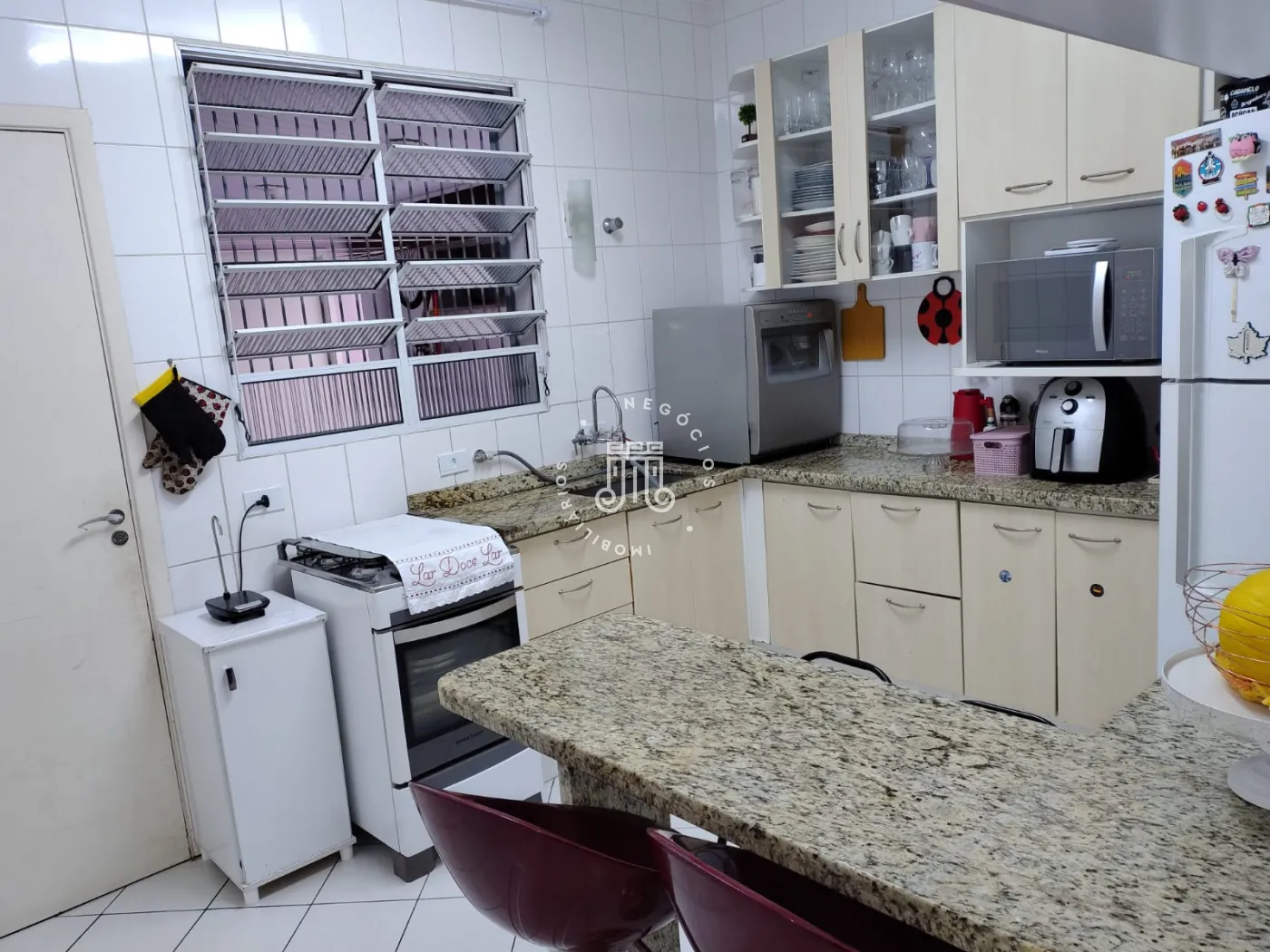Com 2 quartos um com ar condicionado, banheiro social com box vidro e gabinete, sala 2 ambientes, lavabo, copa cozinha pia e gabinete, área de serviço com armários, uma vaga coberta, o condomínio te piscina e um salão de festa.