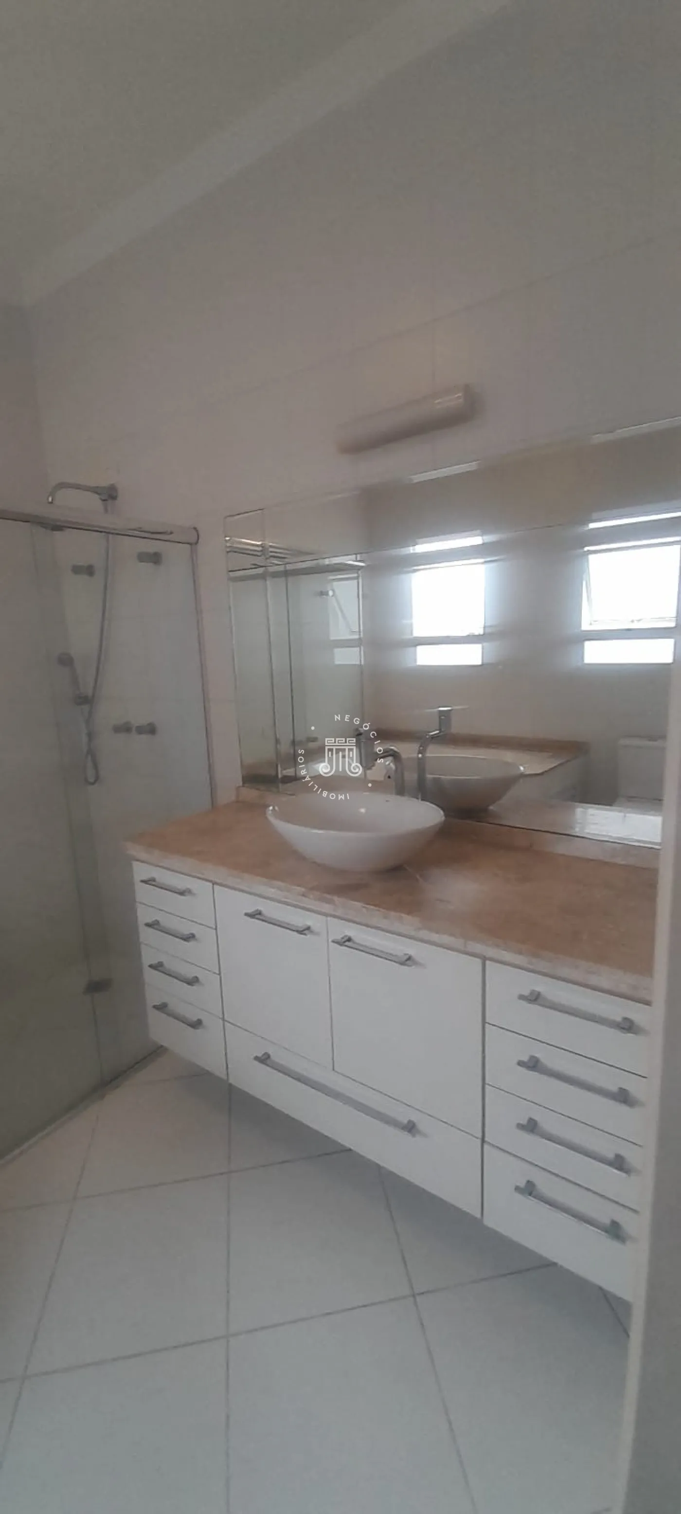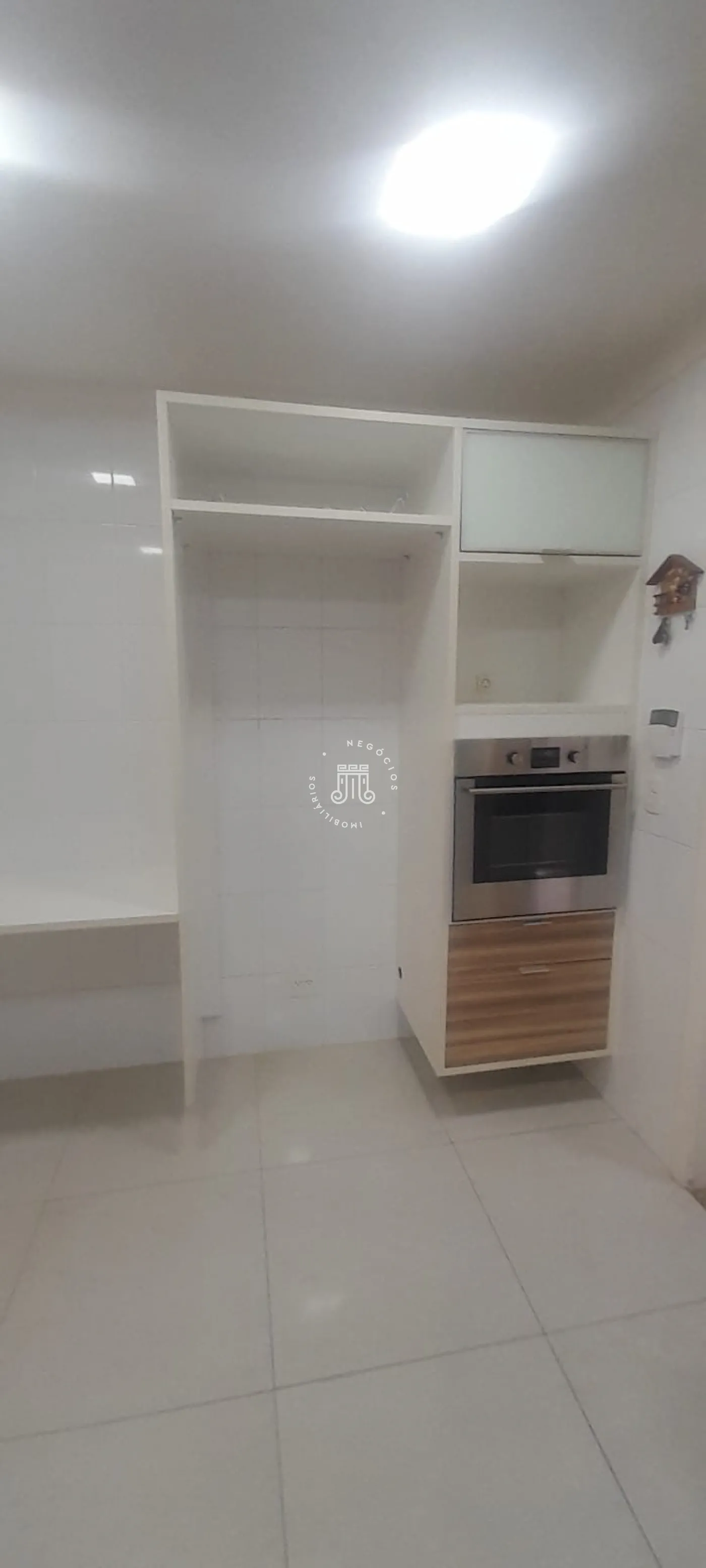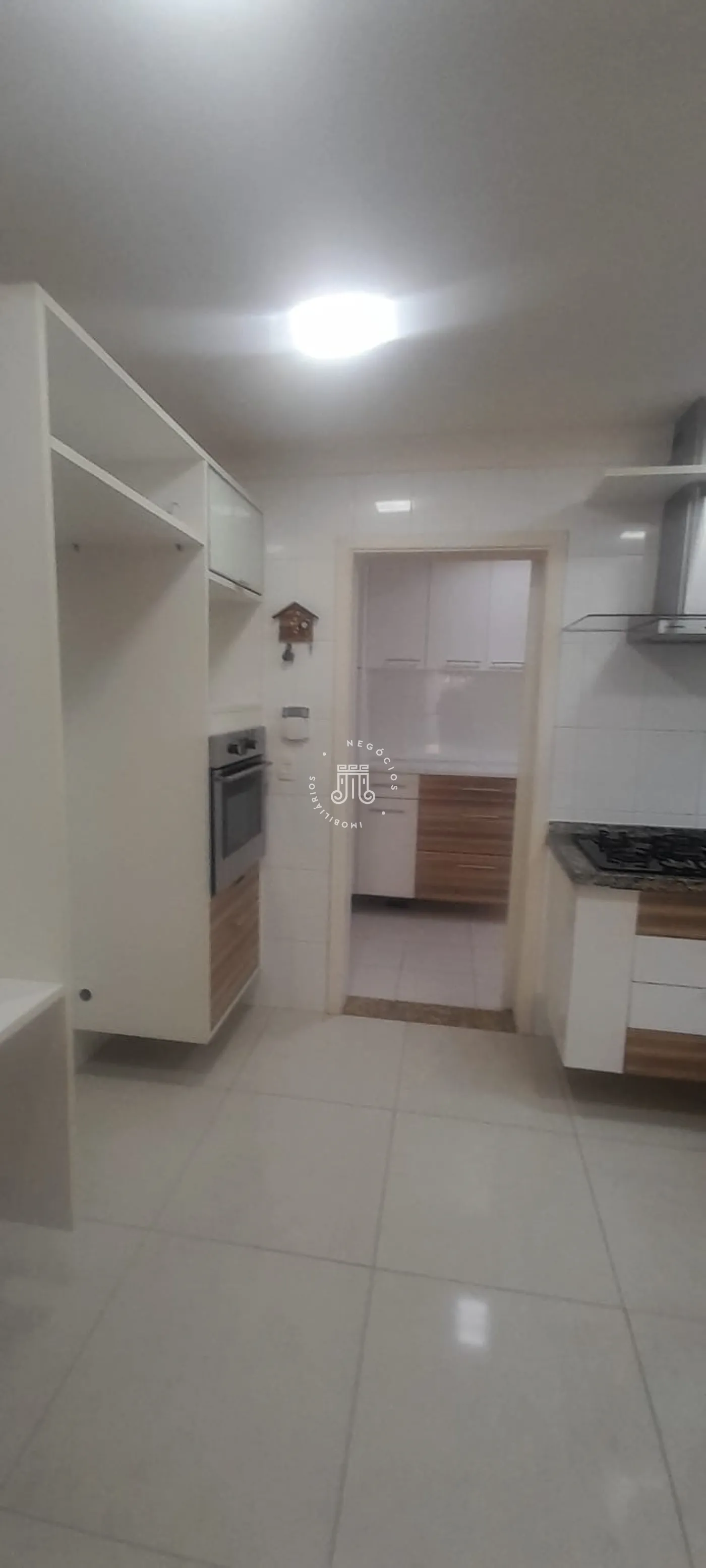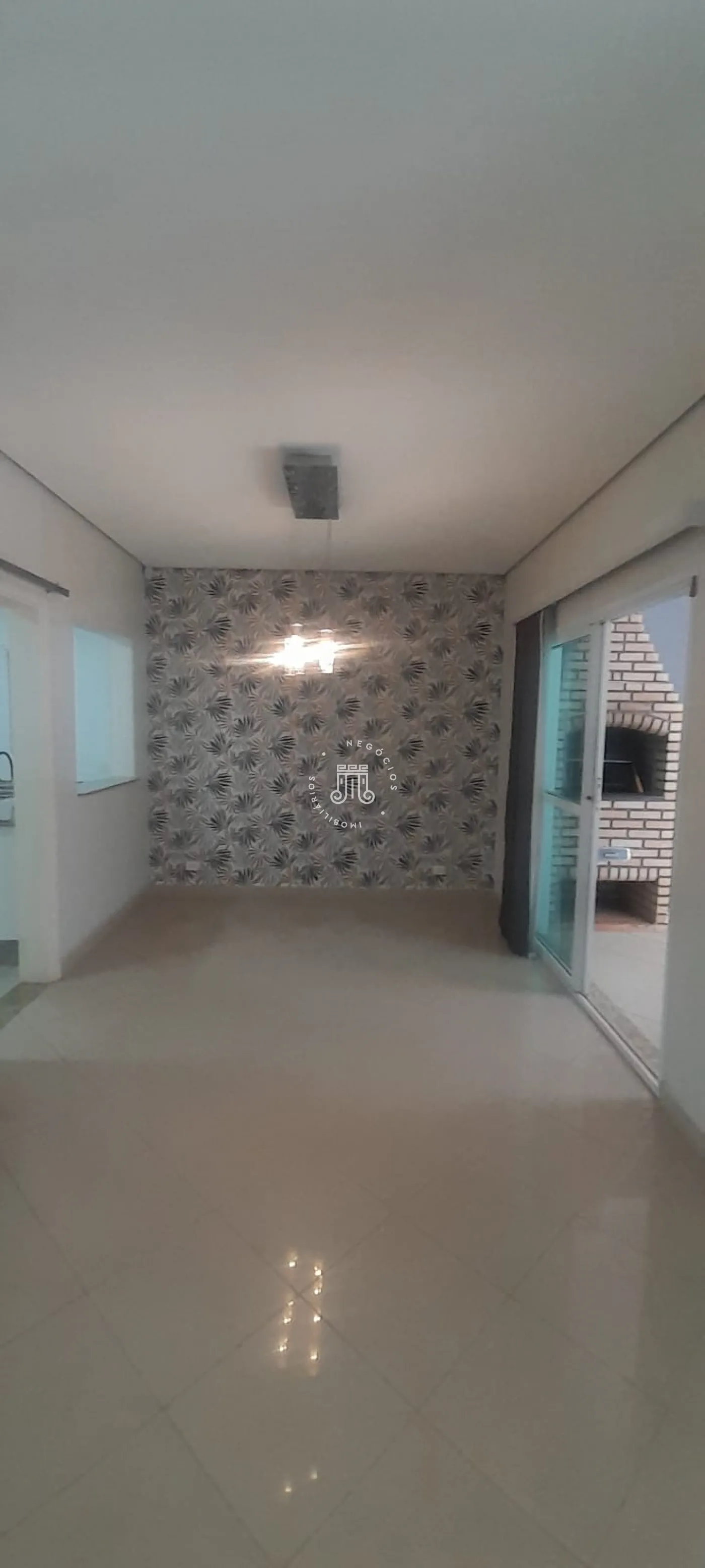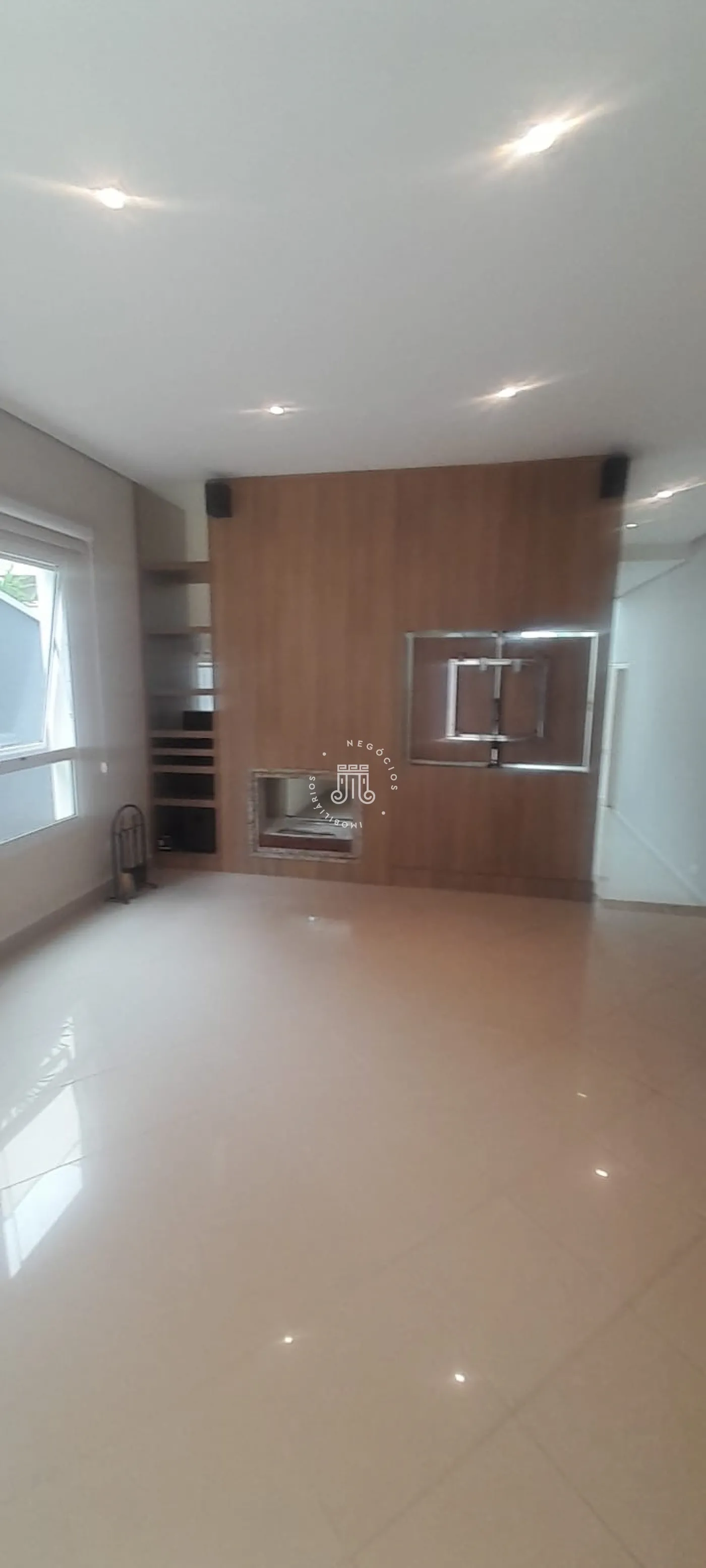 O imóvel conta com três suítes com sacada, sendo uma delas com banheira e closet, além de escritório. Possui cozinha e lavanderia com móveis planejados, sala de estar com painel e lareira, sala de jantar, quintal com churrasqueira e armários, dois lavabos e quatro vagas de garagem.